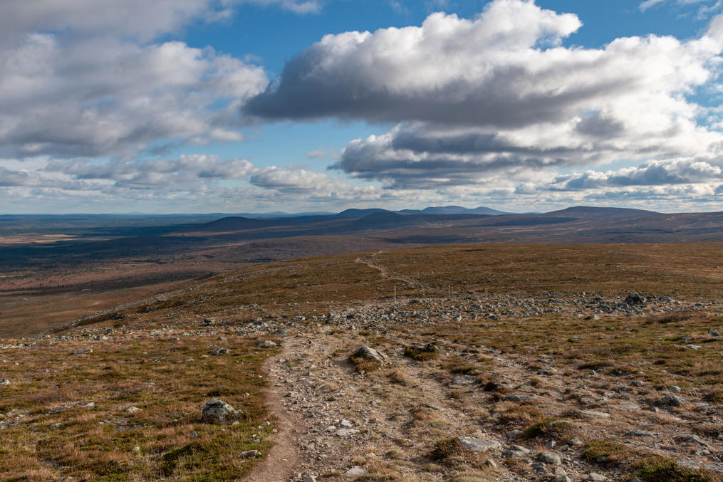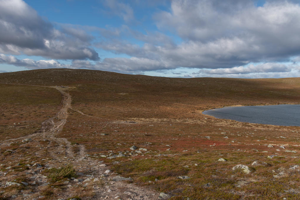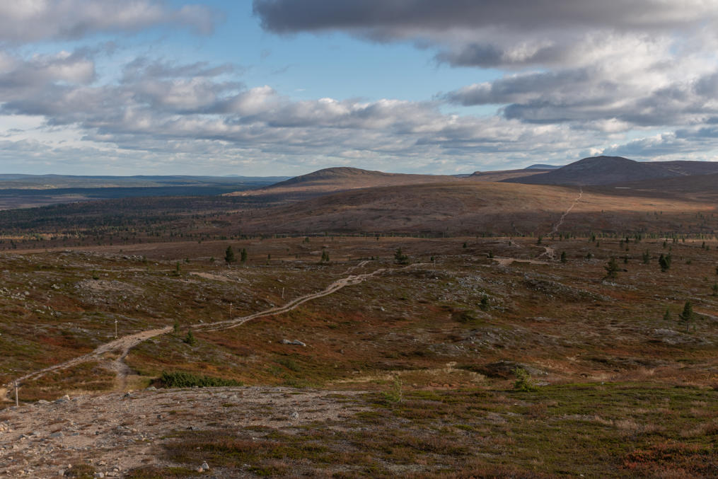 22. Как и в национальном парке Урхо Кекконена, тропы здесь очень широкие и сильно эродированные, выделяются на склонах тундр огромными шрамами, что, конечно, несколько портит виды. Виной здесь в первую очередь туристы, которые вместо того, чтобы идти по центру тропы, где обычно каменисто, а иногда и грязно, часто идут по краешку, где тонкий слой земли еще не вытоптан и идти комфортнее. Ну да что ругать — иногда и сам так делаю, хоть и стараюсь не делать, но после десятка-другого километров начинаешь уже менее внимательно к этому относиться. Помимо туристов, тут также ездят на квадроциклах оленеводы и обслуживающий персонал, но те все-таки стараются одной колеи придерживаться, часто и полностью отдельной от тропы.