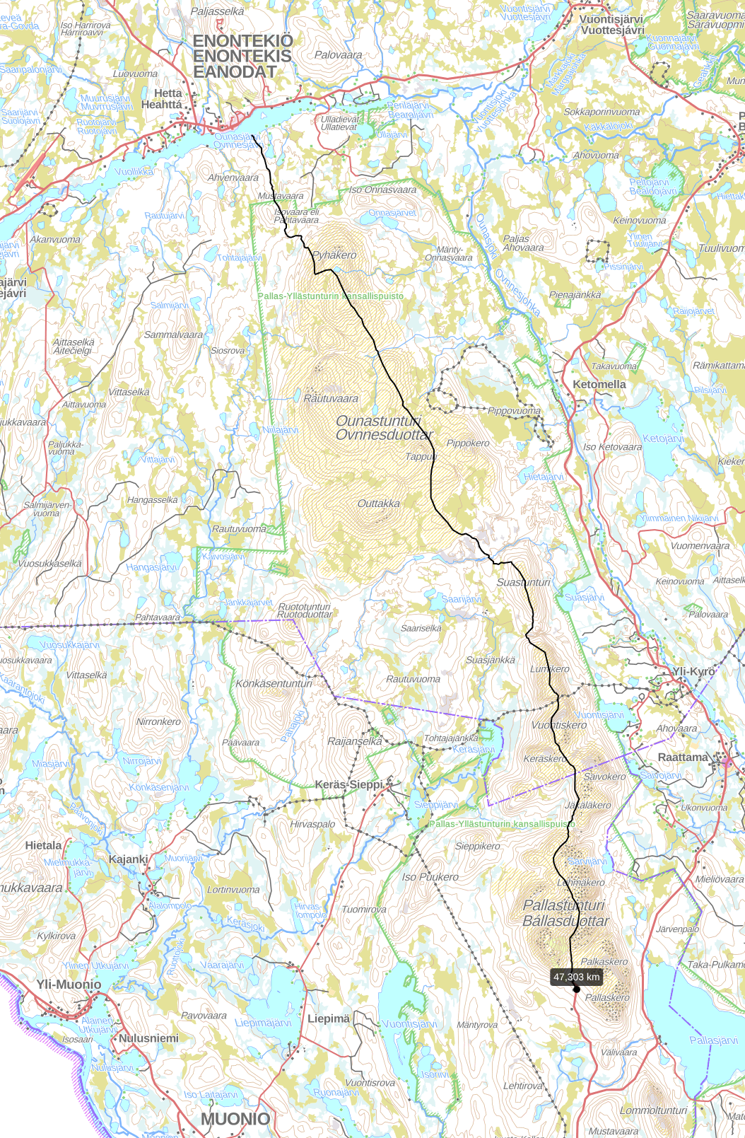 На официальном сайте nationalparks.fi/luontoon.fi есть подробное описание собственно маршрута Хетта-Паллас и национального парка Паллас-Юллстунтури в целом. Я не фанат, как они сделали редизайн сайта с год назад, но вся нужная информация все-таки должна быть, в т. ч. на английском. И обзорные топографические карты есть.