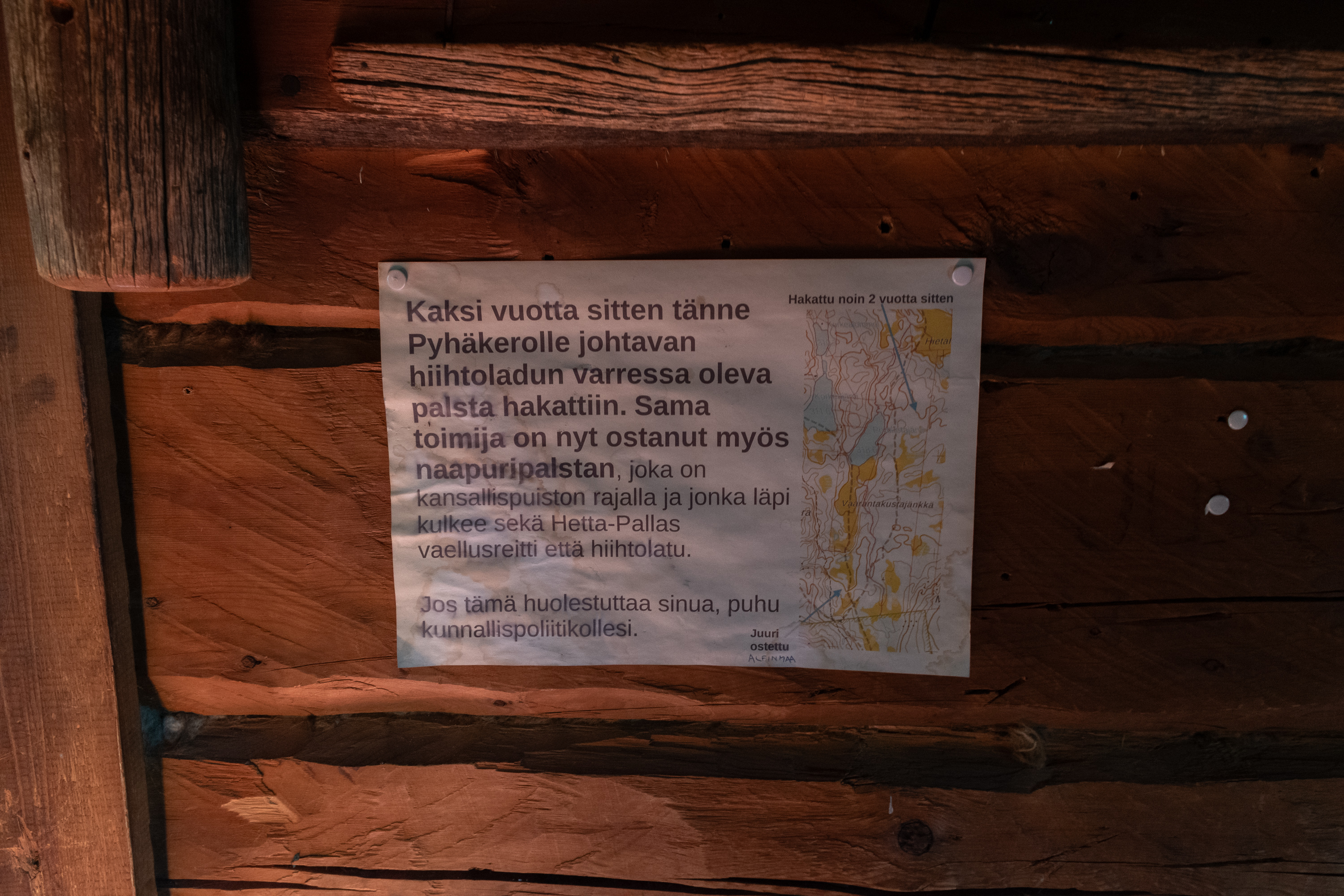 17. На стене висела еще такая вот бумажка. "Два года назад участок леса у ведущей сюда, на Пюхякеро, лыжни был вырублен. Та же компания теперь купила также соседний участок, на границе национального парка, через который идет как лыжня, так и пеший маршрут Хетта-Паллас. Если вас это беспокоит, поговорите с вашим муниципальным политиком." Действительно, есть такая история, можно погуглить. Небольшая компания Metsäyhtiö Lamminen & Numminen из Киттиля, которая уже пару десятков лет промышляет лесом в т. ч. в Энонтекиё, купила участок в 55 га на границе национального парка в 2024, сильно обеспокоив местных. Муниципалитет Энонтекиё попытался принудительно перекупить участок — в некоторых случаях у муниципалитетов есть такое право, когда происходит сделка с недвижимостью — но административный суд весной 2025 отменил это решение. Муниципалитет пытается теперь обжаловать в Верховный административный суд. Будет, конечно, жалко, если лес вырубят — речь идет об участке маршрута в 800-850 м длиной. С другой стороны, ну, по-хорошему, предприниматели тут в полном праве, и фатального ничего не произойдет все-таки, вон вдоль Кархункиерроса тоже за пределами территории национального парка (Оуланка) есть вырубки, и никто не умер вроде.