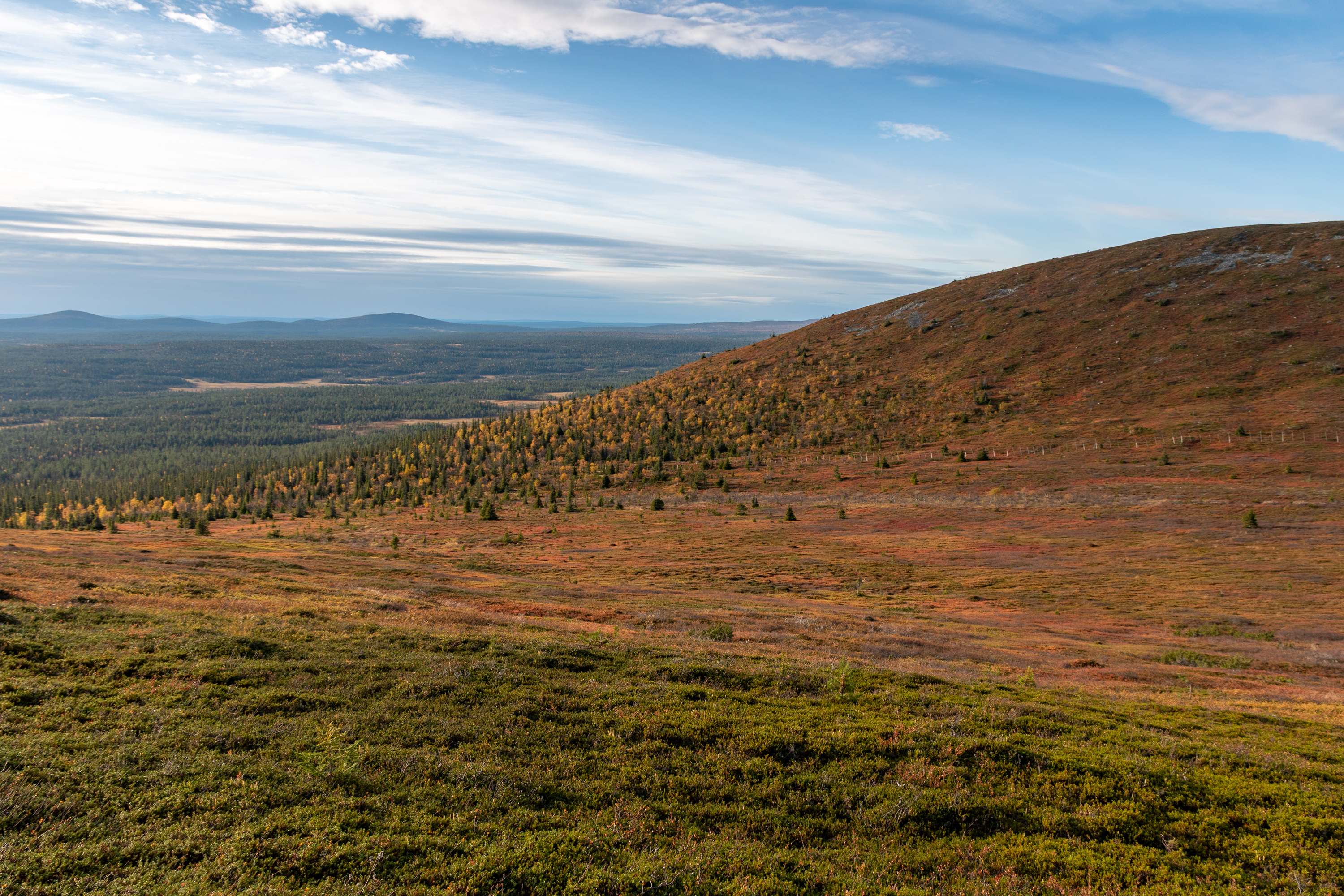 19. Палластунтури (Pallastunturi, саам. Bállasduottar; название саамского происхождения, скорее всего, от корня, означающего "склон"; не имеет отношения к Палладе или прусско-русскому географу Палласу) отличается от Оунаса еще тем, что на Палласе растут ели, а на Оунасе уже нет — слишком северно для них. На топографической карте граница еловых лесов действительно проходит в аккурат по Ханнукуру, и елки после него и правда появляются довольно резко. Неочевидно, конечно, что ели при движении на север исчезают первыми, до сосны (годом раньше видел самые северные в мире сосновые рощи в Стаббурсдалене уже в Северной Норвегии) и березы, но поэтому они и выглядят в Лапландии такиим узкими и куцыми, что сложнее им выживать. С другой стороны, на Палласе и южнее на Юллясе относительно мало горной березы, характерной для более северных гор.