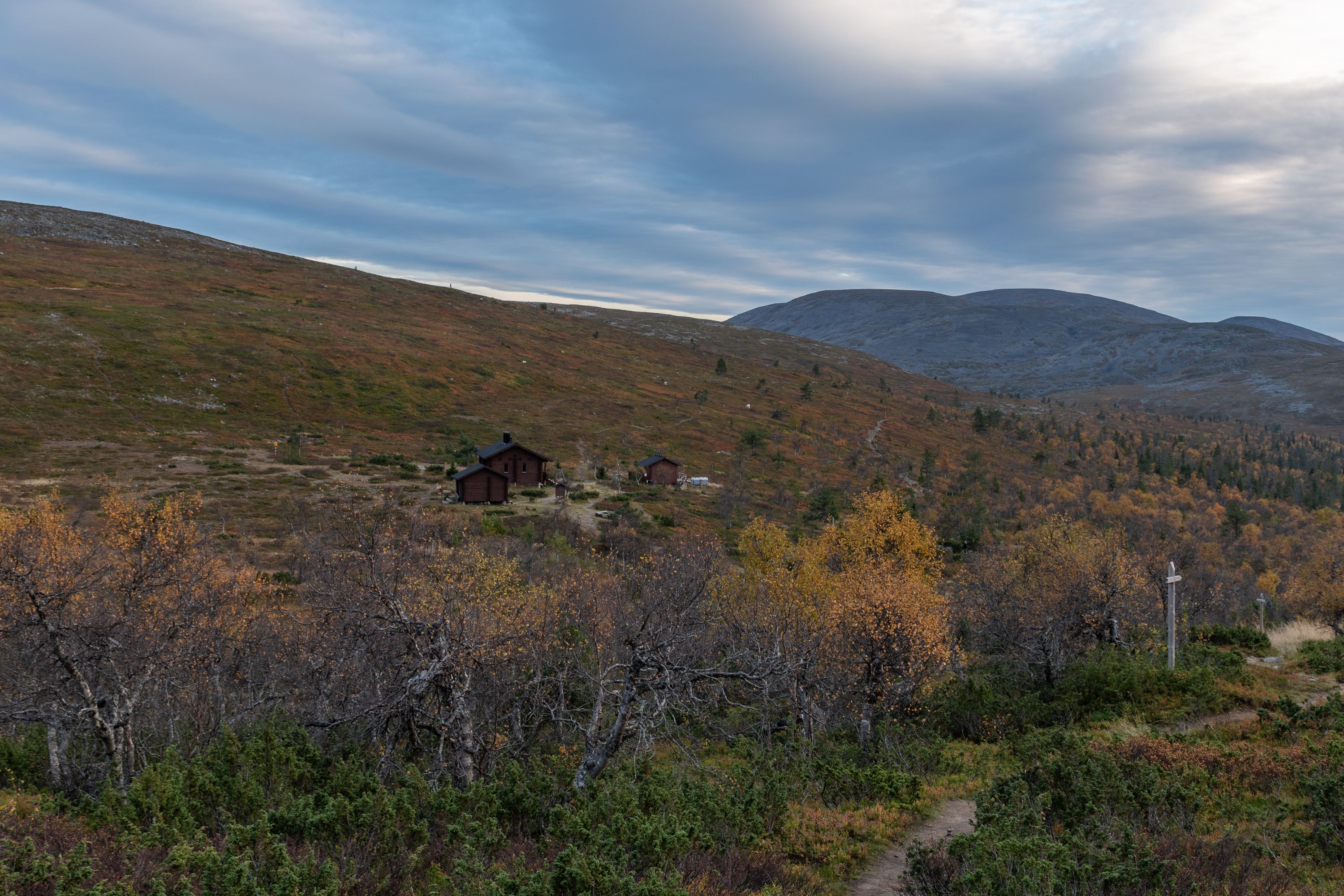 1. В конце первого дня, в начале пятого вечера я уже был у хижины Сиоскуру, и благополучно расположился там на ночевку в палатке. Немного смутило, что на одном столбике (красно-белом, виднеется немного сзади на этом фото) было написано "No camping" — может, поэтому кроме меня ни одной палатки не было? Хижина была занята при этом — здесь и общедоступная autiotupa, и varaustupa с бронируемыми местами есть. Но это бред какой-то, тут есть хорошие места для палаток, и я перепроверил официальный сайт, где говорится, что палатку можно ставить в непосредственной близости от всех мест привала, и даже на хижине на табличке было мнаписано, что палатки ставить можно. Может, какой-то конкретный кусок земли так ограничили? Непонятно, в общем. Ну, в любом случае, до следующего возможного места я дойти вряд ли бы успел до заката.