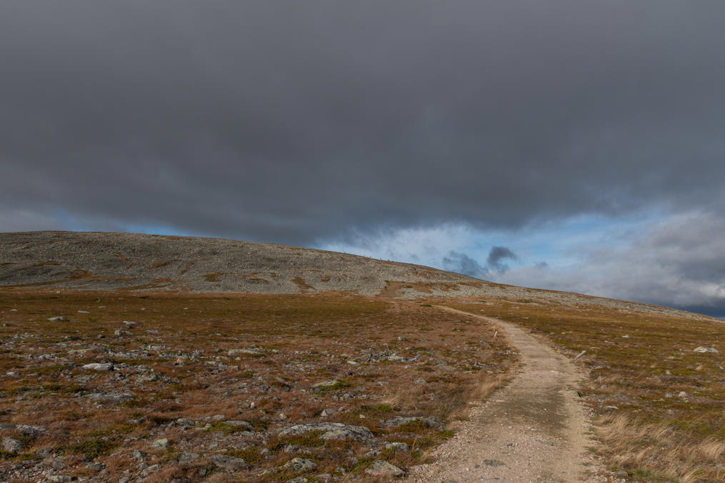 56. Седловина представляет собой практически плоское плато между вершинами Тайваскеро и соседней Пюхякеро; на вершину Тайваскеро, строго говоря, тут ответвляется отдельная короткая тропа. Ну, конечно, не залезть глупо, тут всего 50 м подъема остается, а рюкзак я оставил внизу полежать. Над Тайваскеро как раз внезапно вылезла довольно устрашающего вида тучка, но никакого дождя не началось.