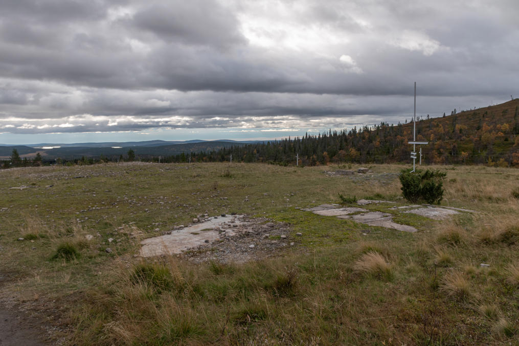 30. Вершина — почти одновременно с другими туристами забрался. Здесь таки есть табличка, хотя без указания высоты, а высоты здесь около 660 м над уровнем моря. Слева вдалеке видна гора со светлой полосой — это по всей видимости Леви, почти одинокая гора на одноименном горнолыжном курорте, более или менее крупнейшем в Финляндии, в паре десятков километров к северу от поселка Киттиля. Полоса, скорее всего, представляет собой запас прошлогоднего снега, прикрытый специальными матами — благодаря которому курорт может открыться вновь на новый сезон уже в октябре.