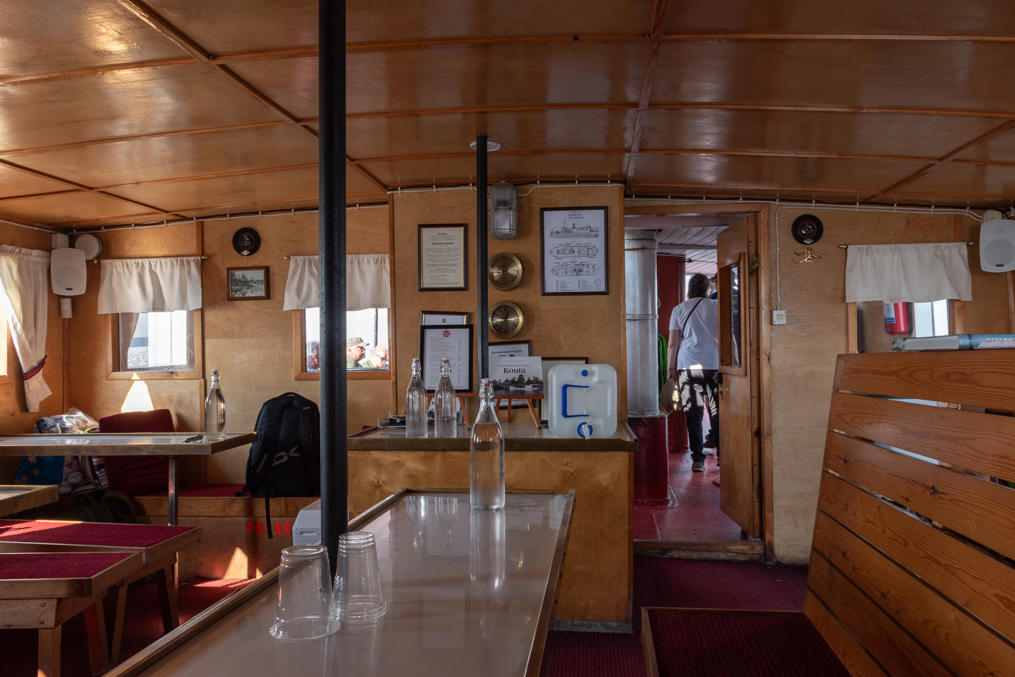 3. Покажу пароход получше, забегая вперед, уже от пристани на Эрьянсаари, со времени отправления обратно. Построен он был, как я уже сказал, в 1920 году, на озерных верфях компании Ahlström (одного из крупнейших промышленных конгломератов Финляндии в первой половине 20 века) в городе Варкаус, на Сайменской озерной системе, но предназначался изначально для Кайнуу, так что его по частям привезли в Каяани и окончательную сборку произвели уже здесь. Но работал он тогда не на Оулуярви, а с другой стороны Каяани и его ГЭС — под названием Vuokatti II он ходил на линии между Каяани и поселками Соткамо и Вуокатти, по озеру Нуасъярви. Характеристики парохода такие: длина 22.5 м, ширина 5.3 м, осадка 1.6 м, мощность паровой машины 121 л. с., максимальная скорость 6 узлов, изначальный экипаж 7 человек, перевозить же могли и больше сотни пассажиров за раз — сейчас можно не более 60.