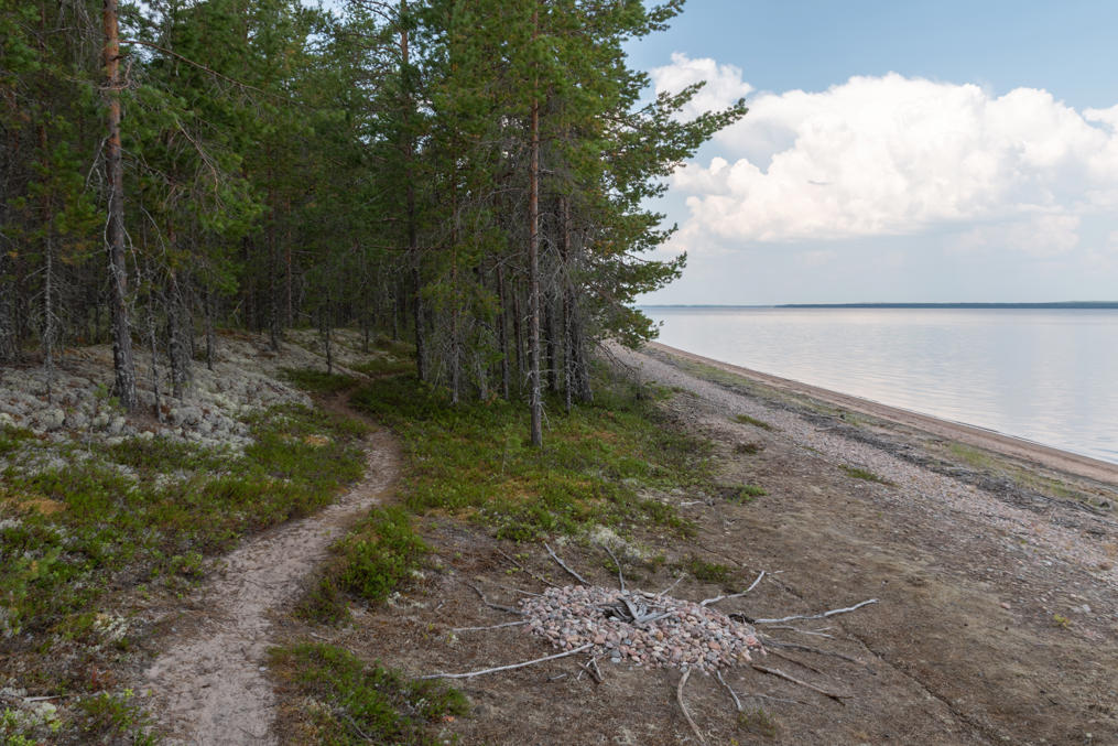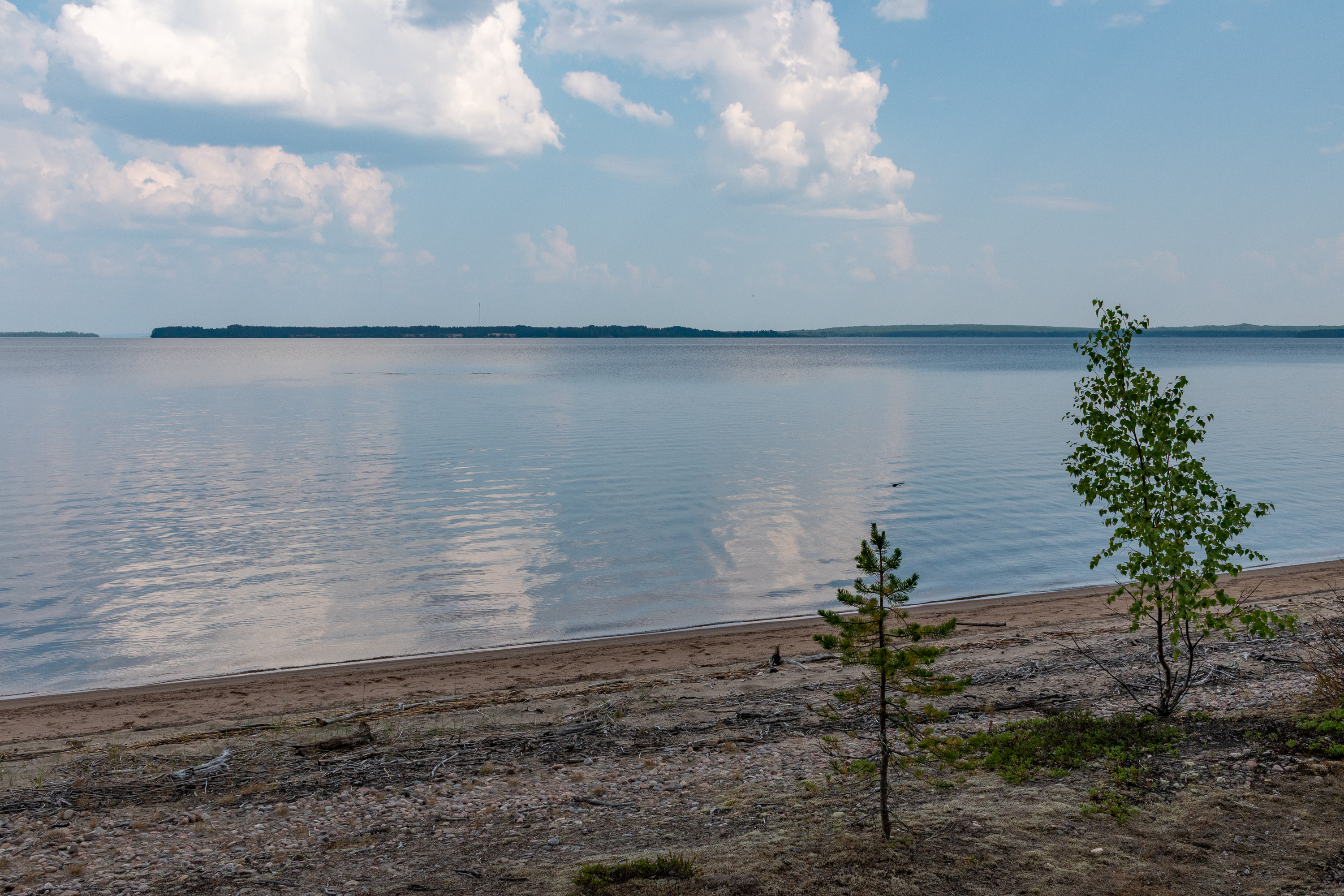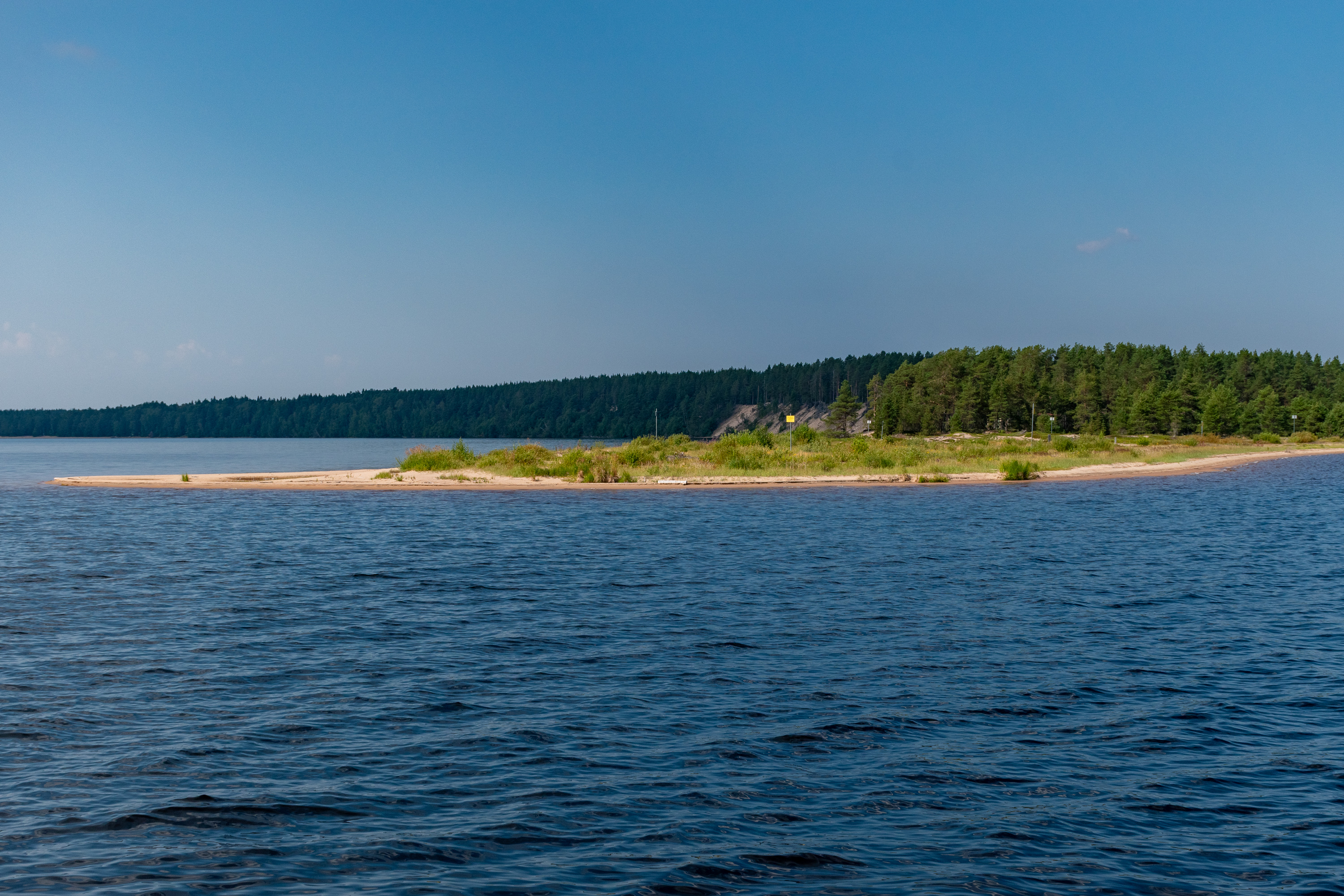 12. Палтаселькя и Эрьянселькя разделяет пролив шириной всего в 3 км, посреди которого вклинился остров Тоукка, очертаниями напоминающий уменьшенную вдвое копию Эрьянсаари, 2.3x0.7 км размерами. И, в отличие от Эрьянсаари, почти совершенно плоский и не песчаный. Но тоже целиком лесистый — его край здесь виден слева — и практически лишенный построек, лишь одну маленькую дачку на карте видно. Toukka означает "личинка", не знаю, откуда название, может по форме какую-то личинку насекомого напоминает, а может, слово изначально что-то другое означало. Остров служит рекреационной территорией для тех, кто в состоянии туда сам добраться. А правее Тоукки на фото вода уже до самого горизонта — Каянское море!