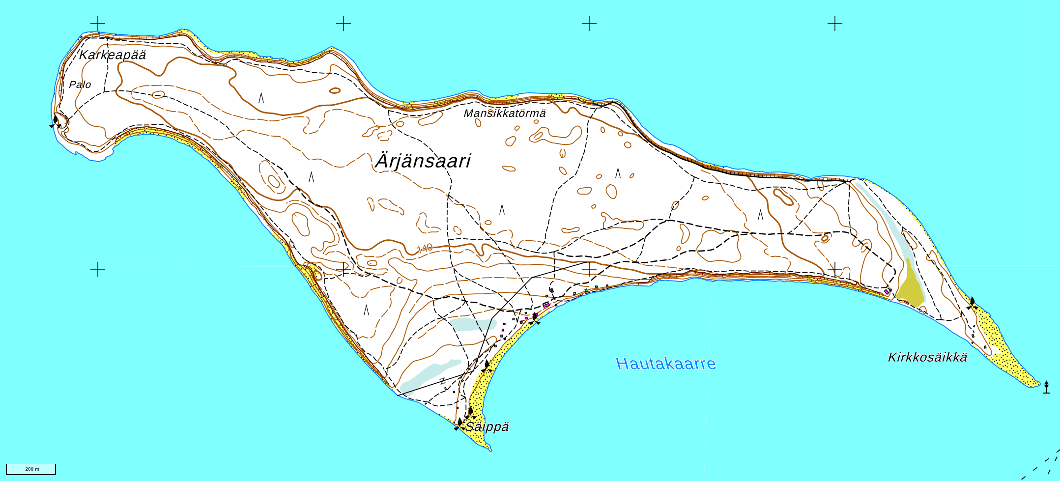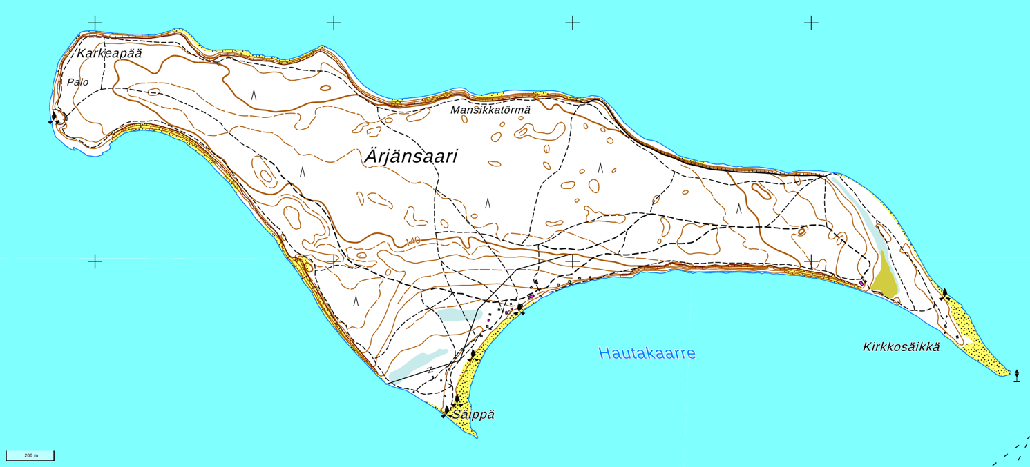 14. Огибаем остров с юга и проходим мимо восточной оконечности. Лес здесь переходит в дюны, и мыс тоже на карте называется "Церковной дюной", Кирккосяйккя (Kirkkosäikkä; säikkä — местное слово для дюны, обычно särkkä).