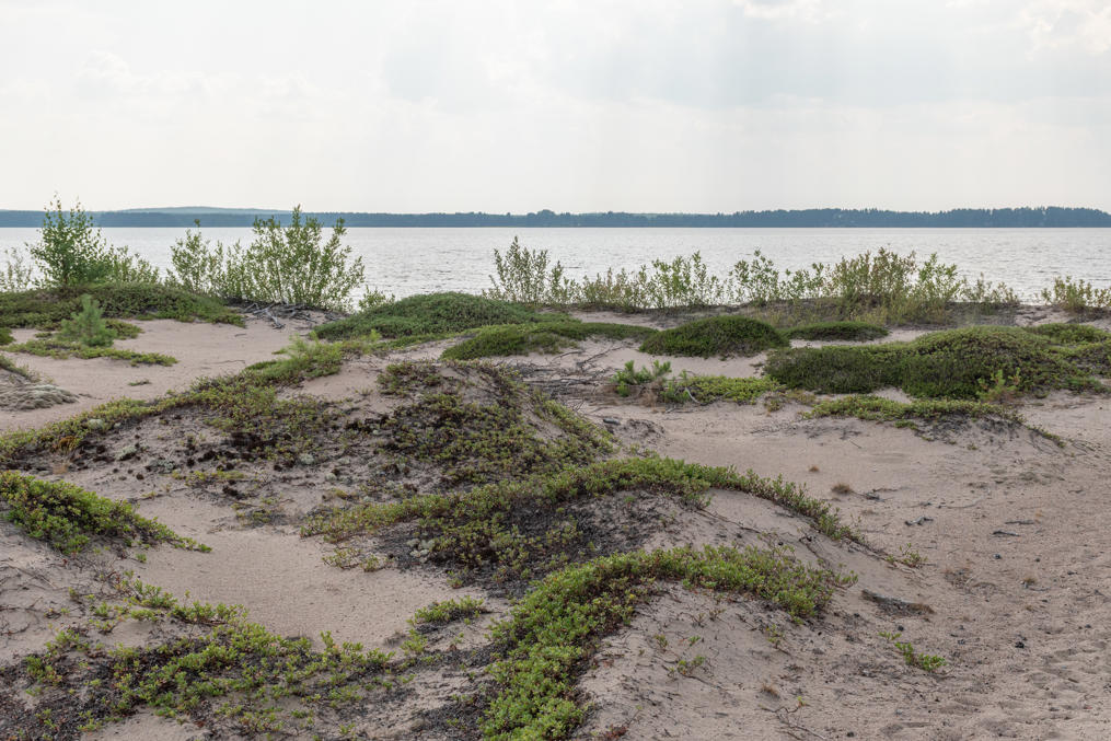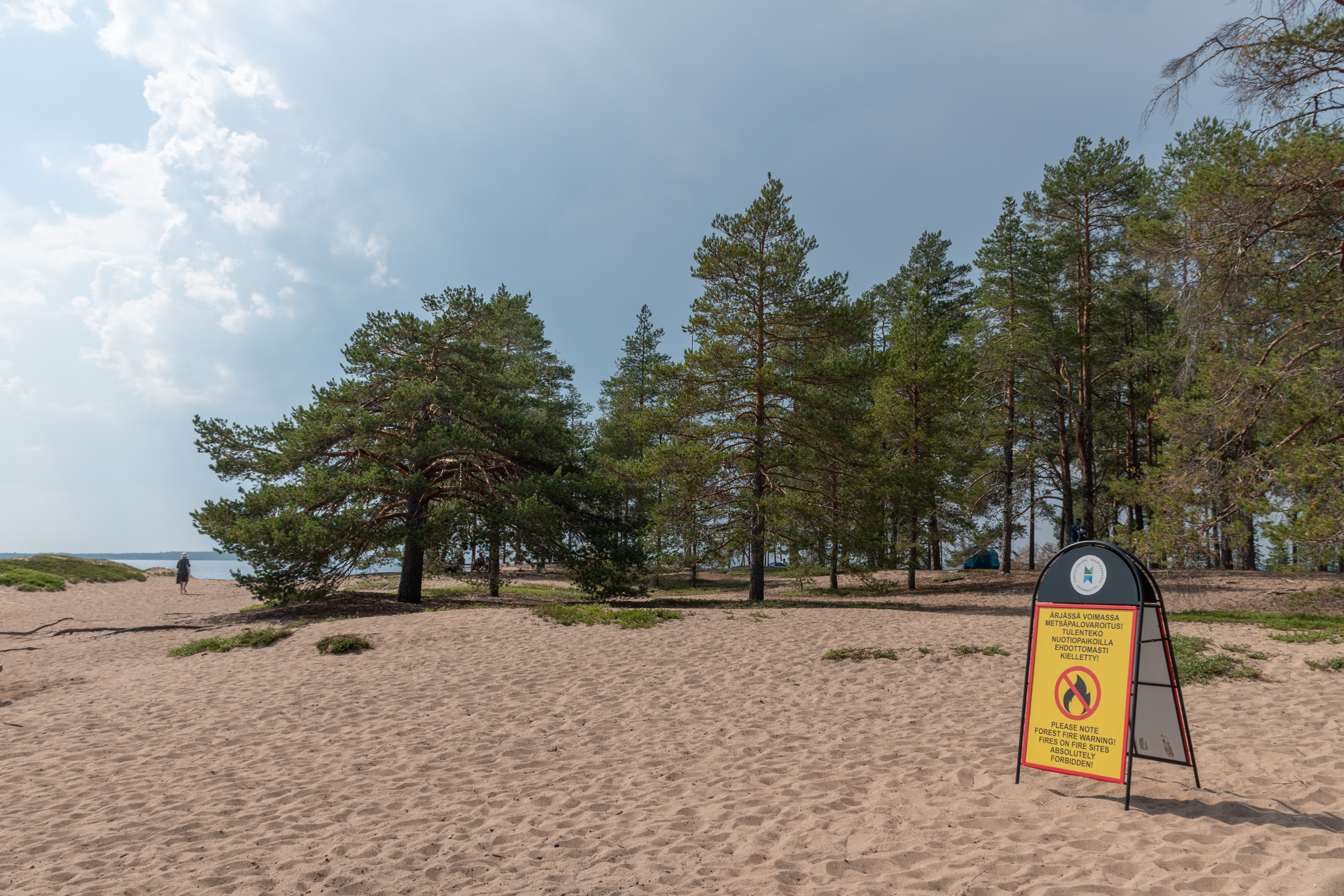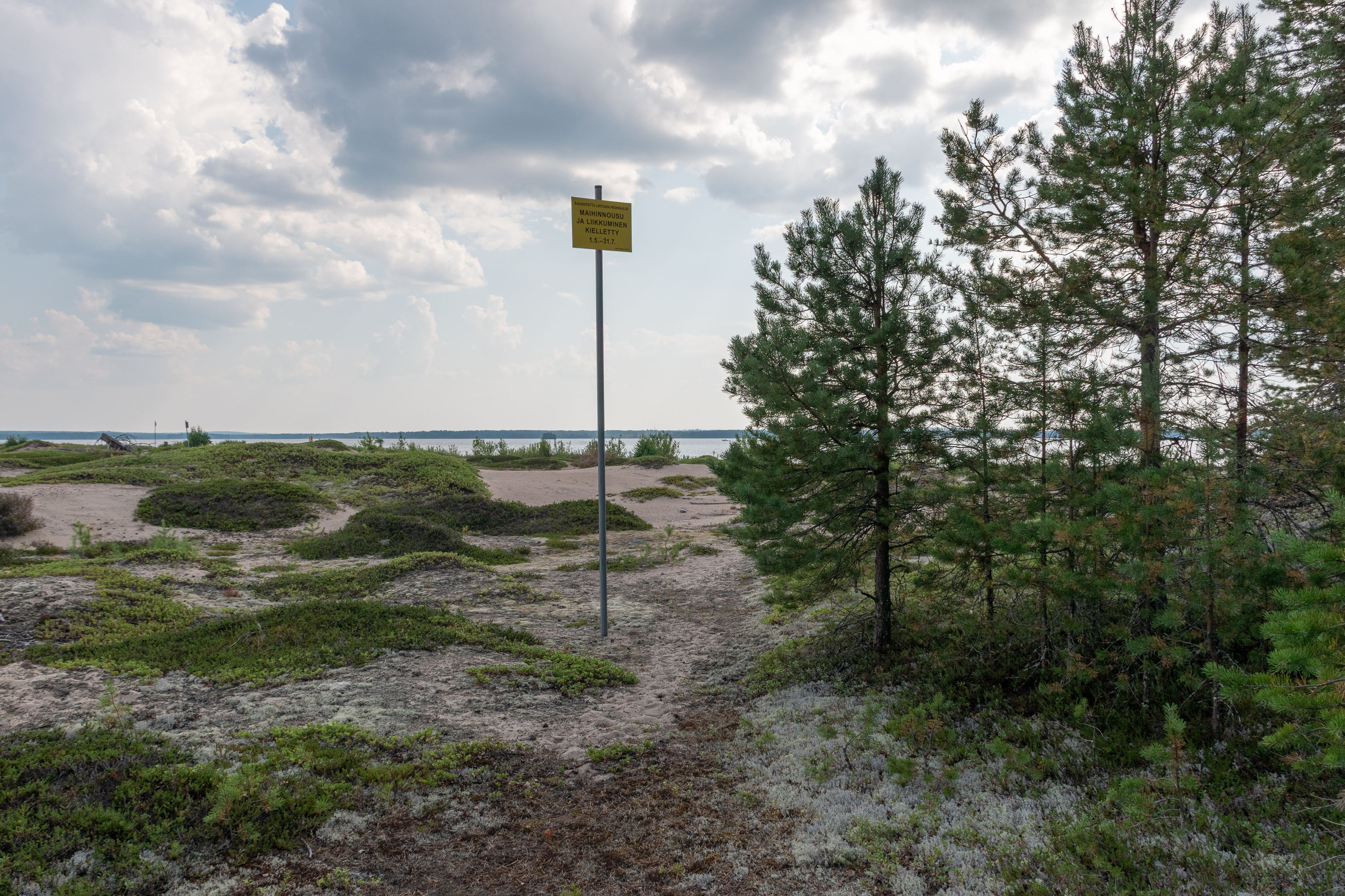 40. Дальше лес кончается и последние несколько десятков метров до конца острова — просто поросшие растительностью дюны — Кирккосяйккя, которую мы видели с парохода. Стоит табличка "Охраняемая территория гнездования птиц. Высадка и передвижение запрещены с 1.5 по 31.7".