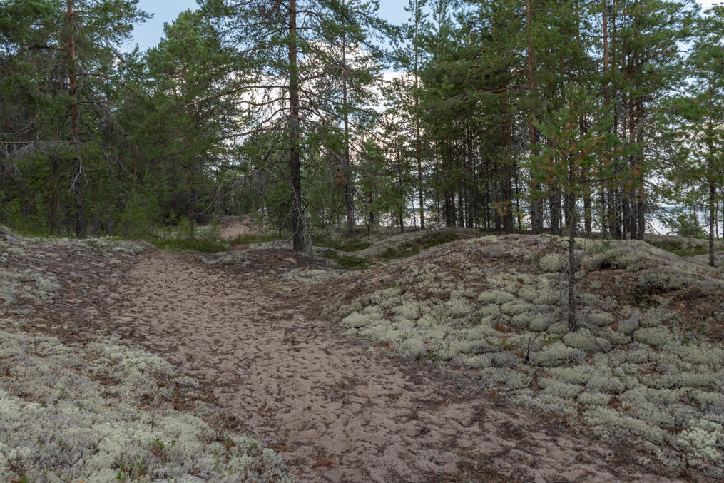 42. До дальнего берега острова, по которому я пошел в обратную сторону от оконечности, и вовсе, видимо, редко добираются. Вначале тропа идет среди заросших ягелем и соснами дюн.