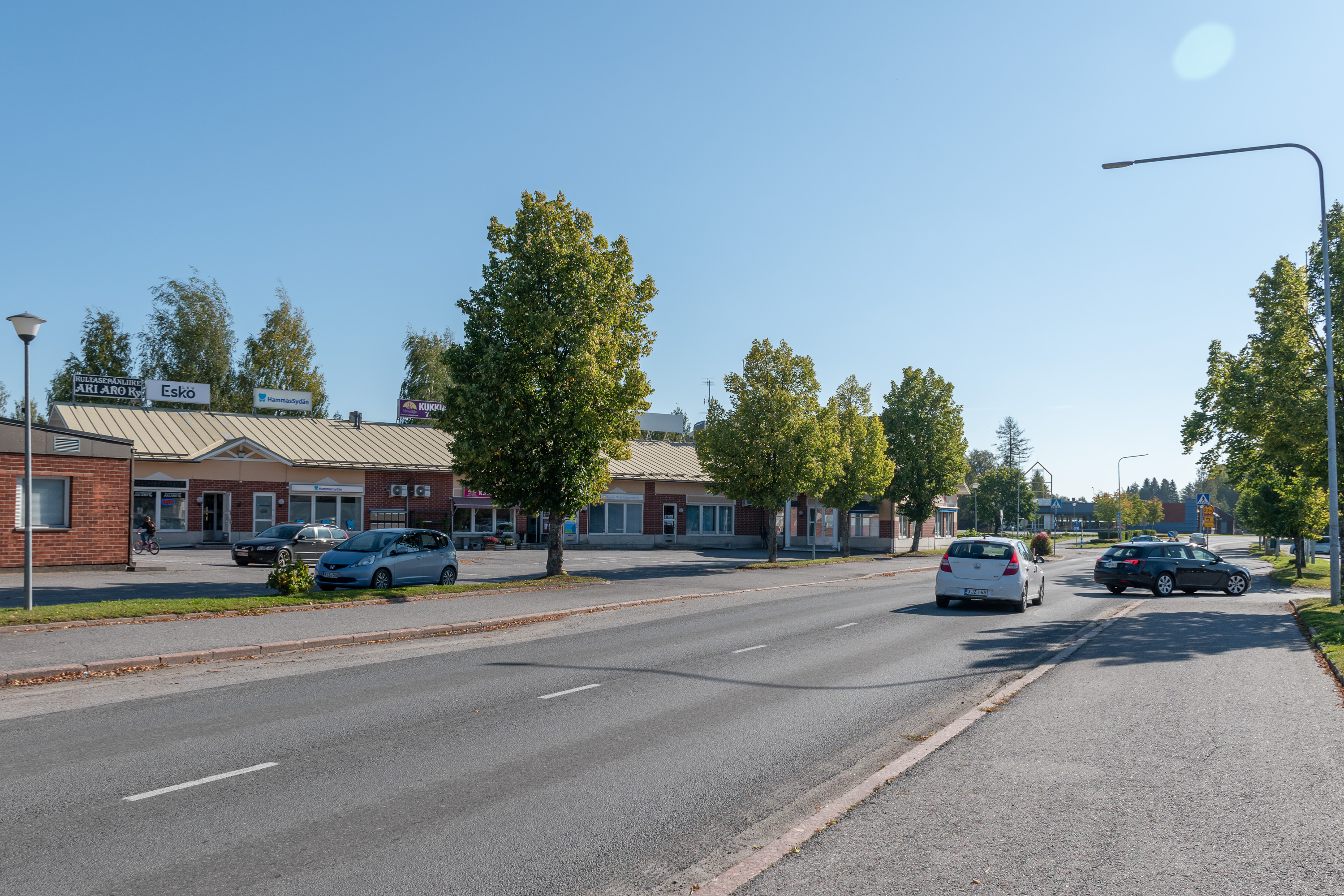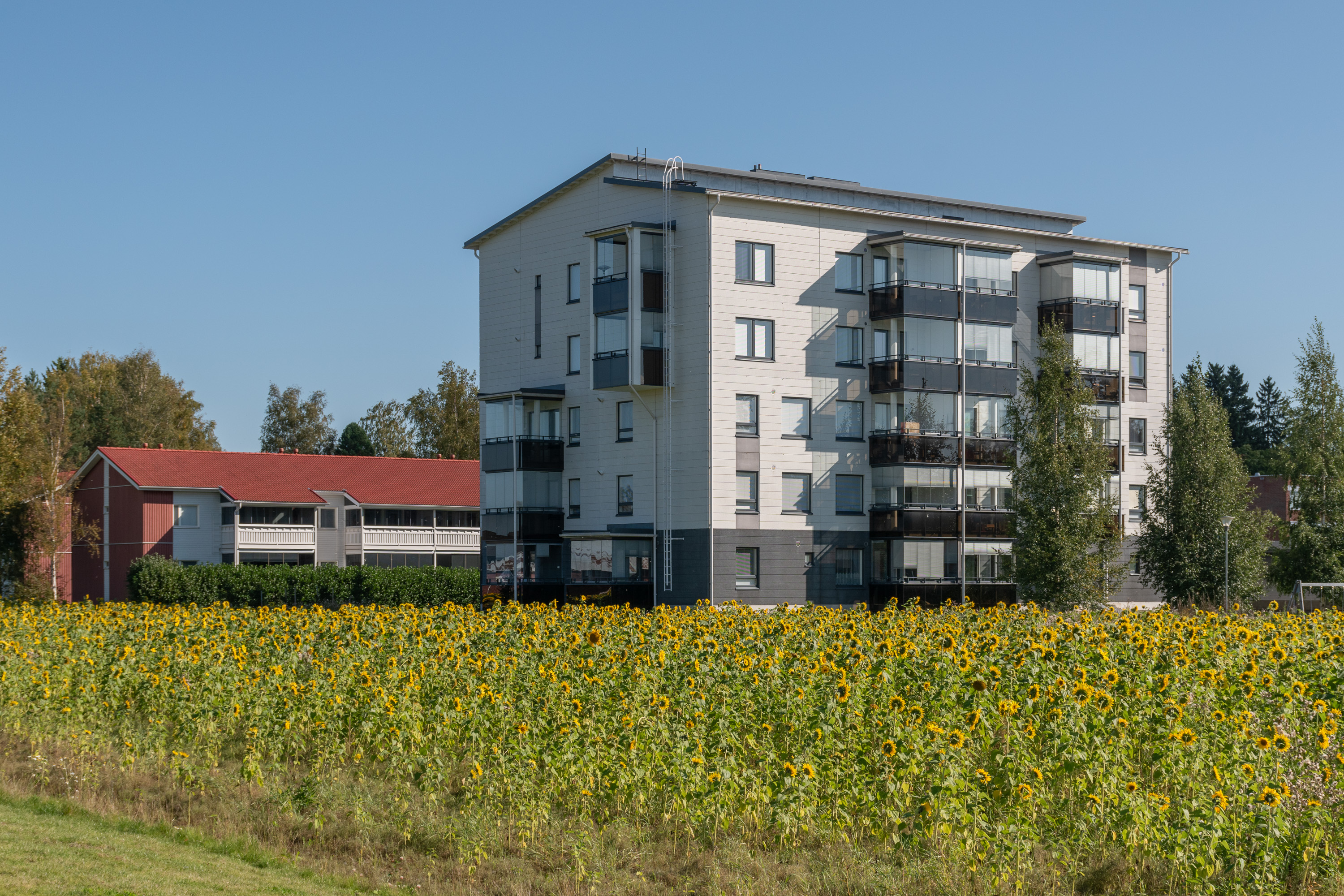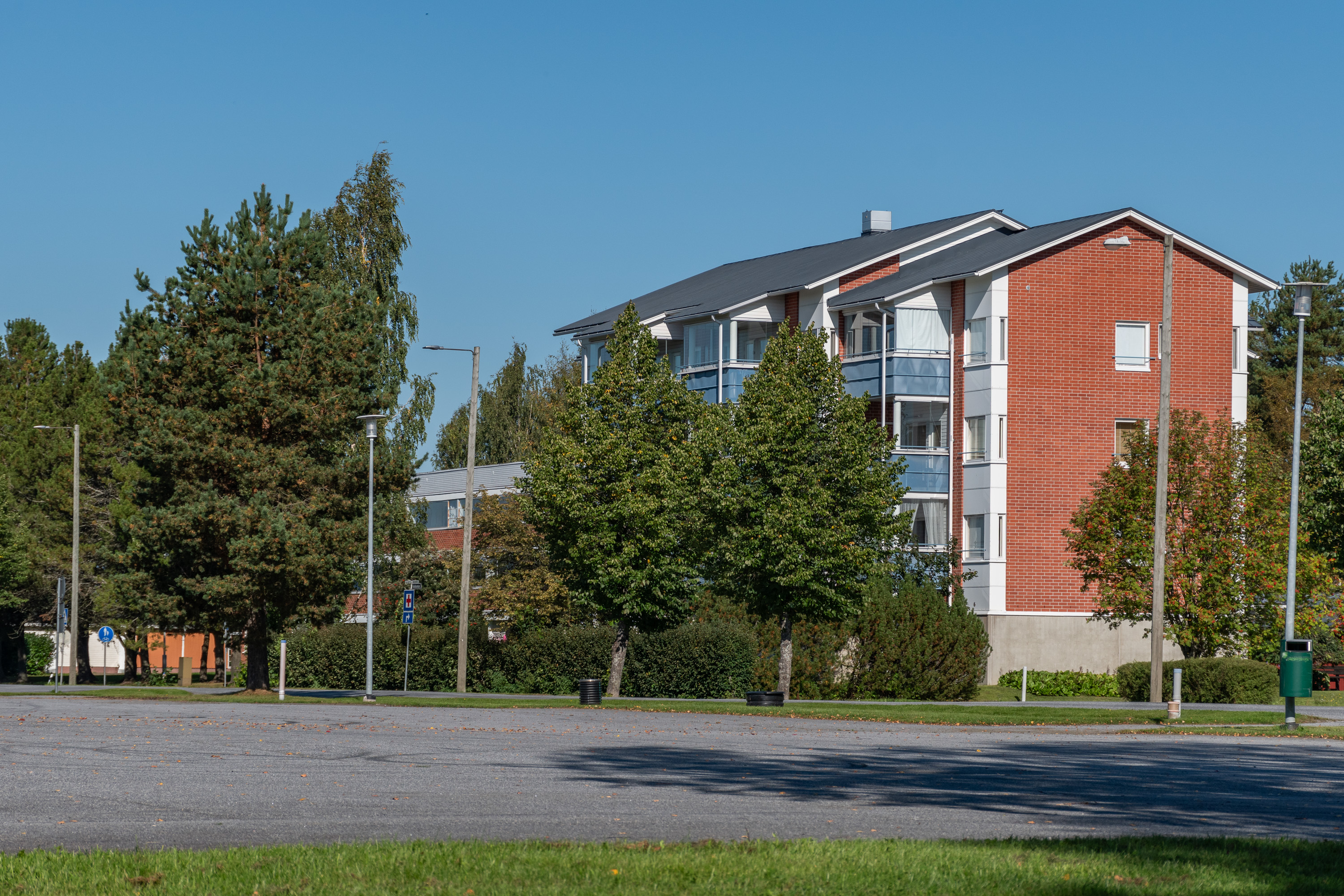 21. Близость Ваасы как относительно крупного города вообще опознается как раз по концентрации многоэтажек, даже такая вот современная есть, и с офисами/магазинами тоже — в более отдаленном селе не стали бы сейчас такое строить.
