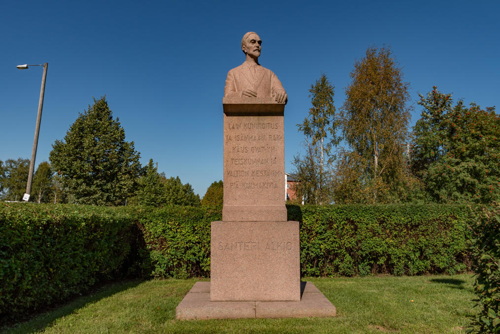 25. Тут стоит памятник Сантери Алкио (Santeri Alkio, 1862-1930), самому известному лайхийцу, основателю нынешней Центристской партии, бывшего Аграрного союза. Про него я рассказывал в предыдущем посте подробно. На памятнике — цитата: "Уважение к закону и любовь к родине — важнейшие фундаменты общества и государства".