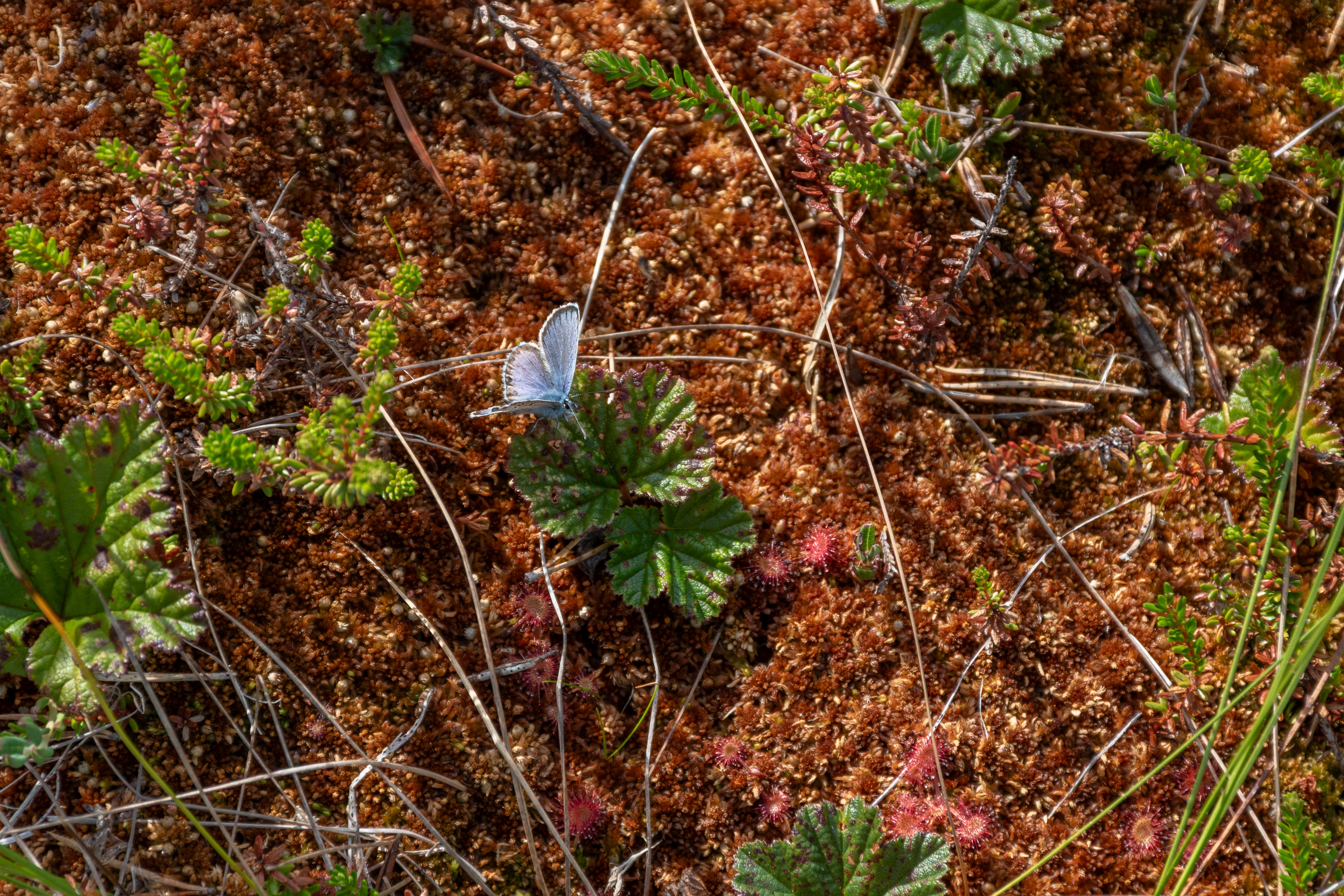57. А вот голубянка (sinisiipi, букв. синее крыло) на листик морошки присела. Тоже разные бывают. Внизу видно цветущую росянку, туда бабочкам, наверное, лучше не садиться.