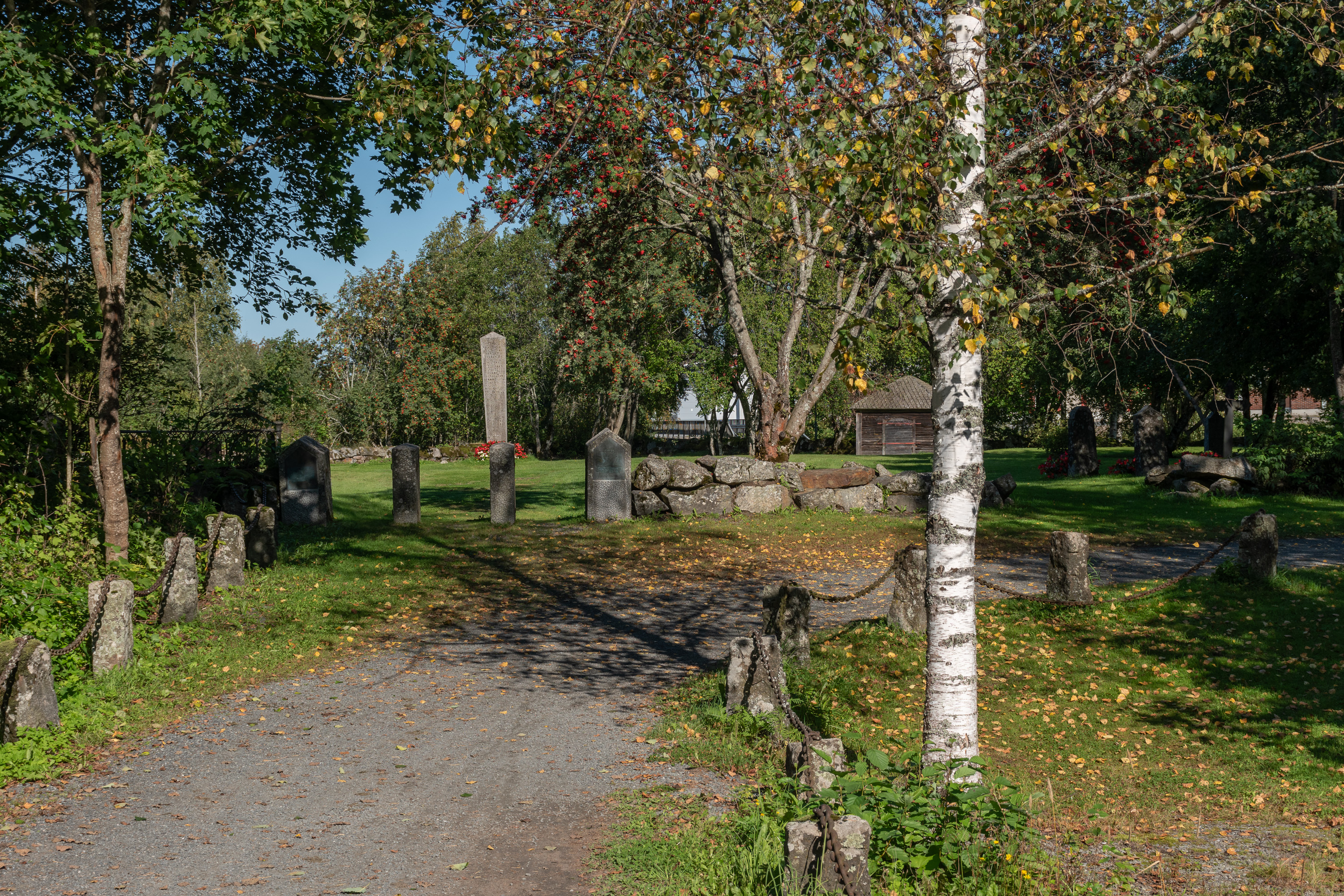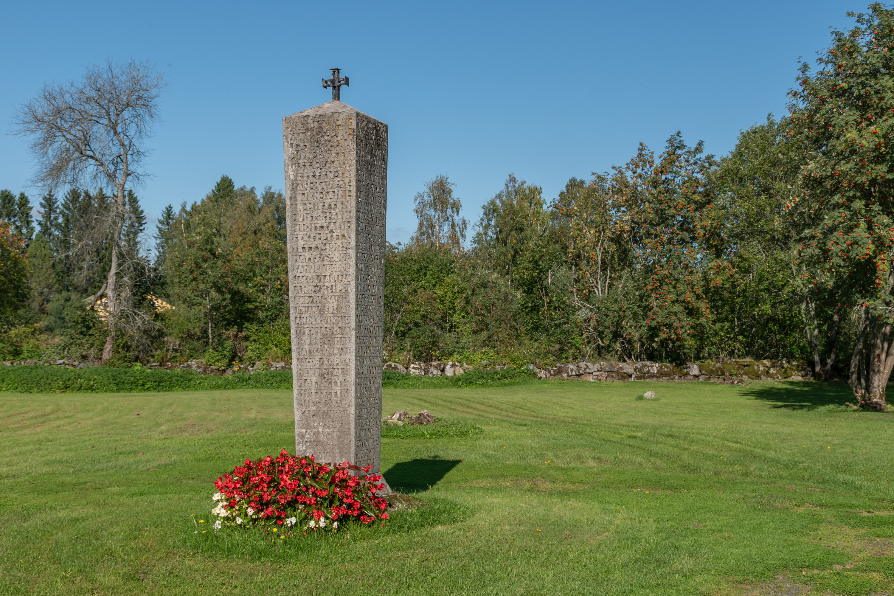 31. Над рекой на месте двух старых церквей стоит памятник битве при Напуе (Napuen taistelu). В этой битве Великой Северной войны, состоявшейся в 1714 году, при деревне Напуе в Исокюрё около 17 км восточнее Лайхии, российские войска окончательно разгромили шведско-финские на территории Финляндии. Начался длинный период крайне жестокой российской военной оккупации Финляндии, Великое Лихолетье (isoviha). Далеко не во всех русско-шведских воинах русские особо зверствовали, но Великое Лихолетье все-таки тут печально отличилось — тогда таки массово убивали, насиловали, разоряли и жгли деревни, угоняли в рабство. Разумеется, в наши дни при современной политической конъюнктуре финны это все с удовольствием вспоминают при каждом удобном случае. В битве при Напуе войскам пыталось помочь местное народное ополчение, и в итоге в Лайхии погибло 60% всего взрослого мужского населения (113 человек) — поэтому здесь и памятник; на месте самой битвы, конечно, тоже мемориал стоит, про который у меня еще один из ранних постов остался. За сопротивление потом именно Остроботния и подверглась максимальным карательным мерам. На памятнике, похоже, перечислены известные имена погибших крестьян.