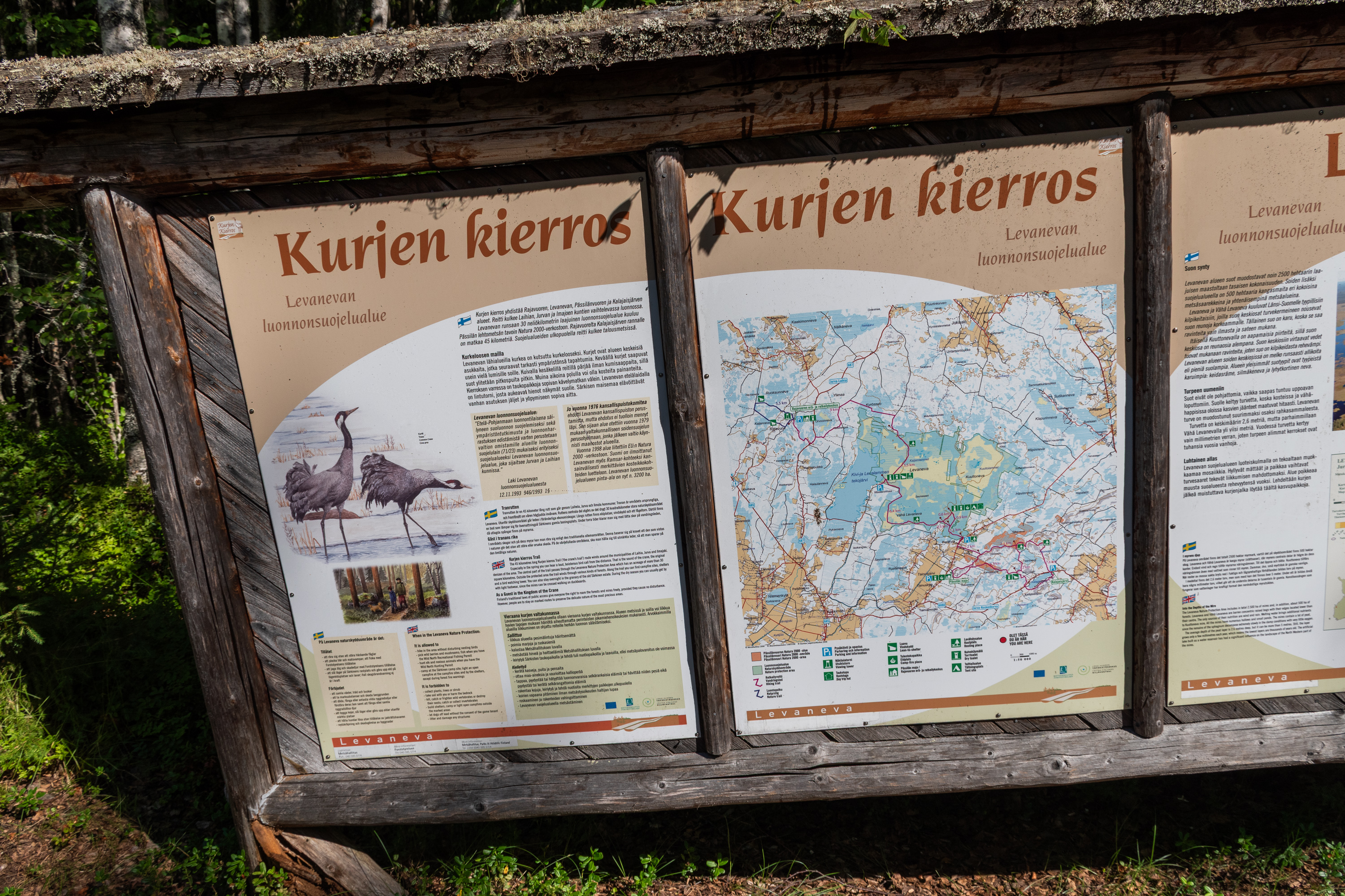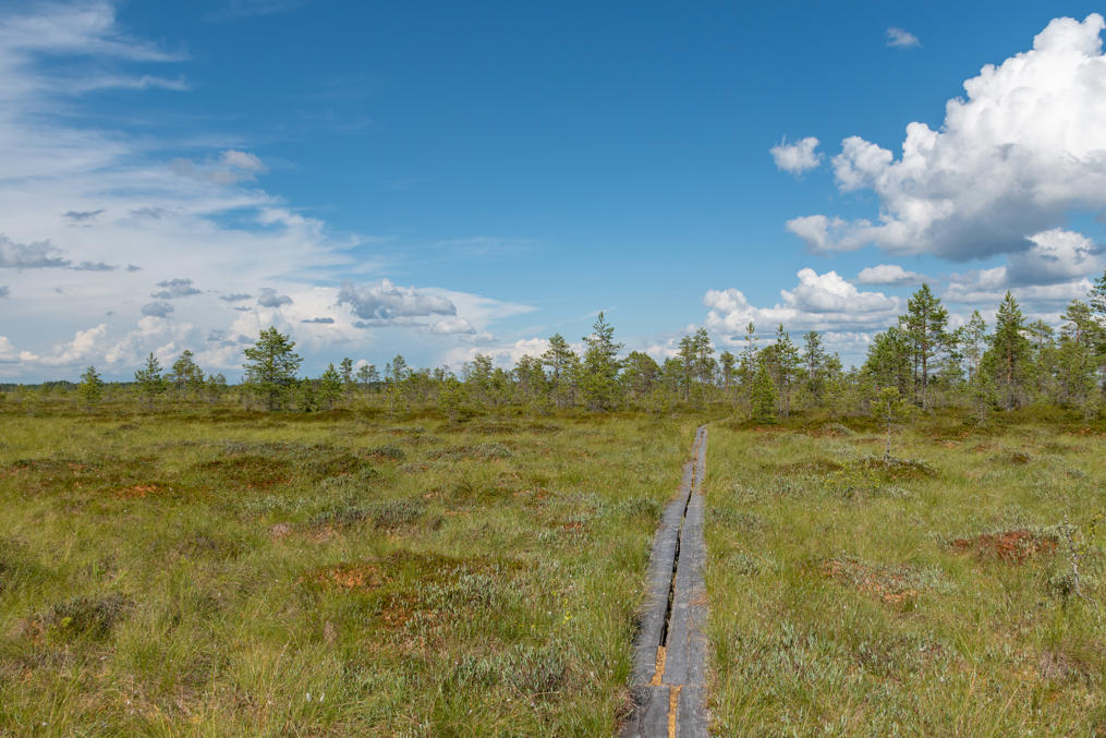 54. Пеший маршрут по мосткам через болото называется Журавлиным кольцом (Kurjen kierros) и имеет общую длину 45 км. На самом деле это не кольцо, он идет из конца в конец, и через болото проходит только его середина, а начинается и заканчивается он на лесных возвышенностях, у каких-то старых мелких баз отдыха — Райявуори и Калаяйсмаа. Маршрут малоизвестный и малопопулярный, ввиду того, что оба конца доступны только на машине со всеми вытекающими, но, может, когда-нибудь я все-таки пройду, относительно не очень далеко от дома раз.