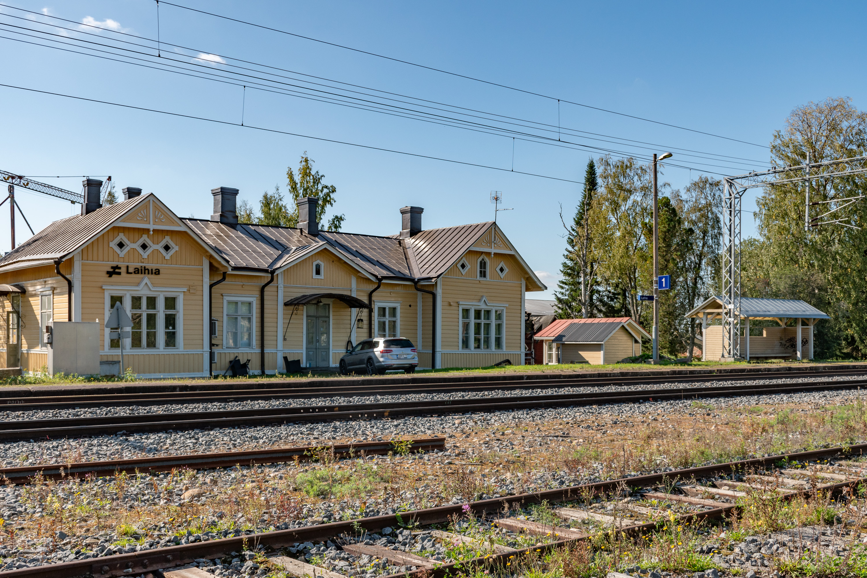 41. Ну а теперь немного окрестностей. Станция Лайхия железной дороги Сейняйоки-Вааса открыта вместе с самой железной дорогой в 1883 году. Поезда здесь останавливались до 2016 года, когда на этой линии закрыли сразу три небольших станции — Лайхия, Исокюрё и Юлистаро — оставив промежуточной остановкой только платформу Тервайоки. Сложно сказать, насколько это было оправдано, но в любом случае на работу на поезде в Ваасу тут вряд ли ездили — на машине проще, тем более, что станция чуть поодаль от основного села, по другую сторону трассы на Сейняйоки. А чтоб поехать в обратную сторону, в Сейняйоки и Хельсинки, можно и до Тервайоки доехать на машине и там сесть, всего 10 км от центра Лайхии. Понятное дело, в месте типа Лайхии машины есть практически в каждой семье.