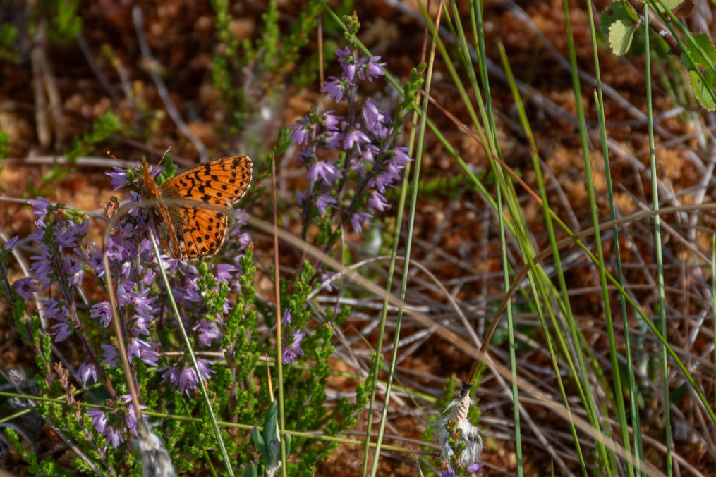 56. Бабочек над болотом целые тучи летали зато. Двух видов, вот какая-то из перламутровок (hopeatäplä, букв. серебряное пятно) на вереске сидит — их с десяток видов, трудно различить друг от друга.