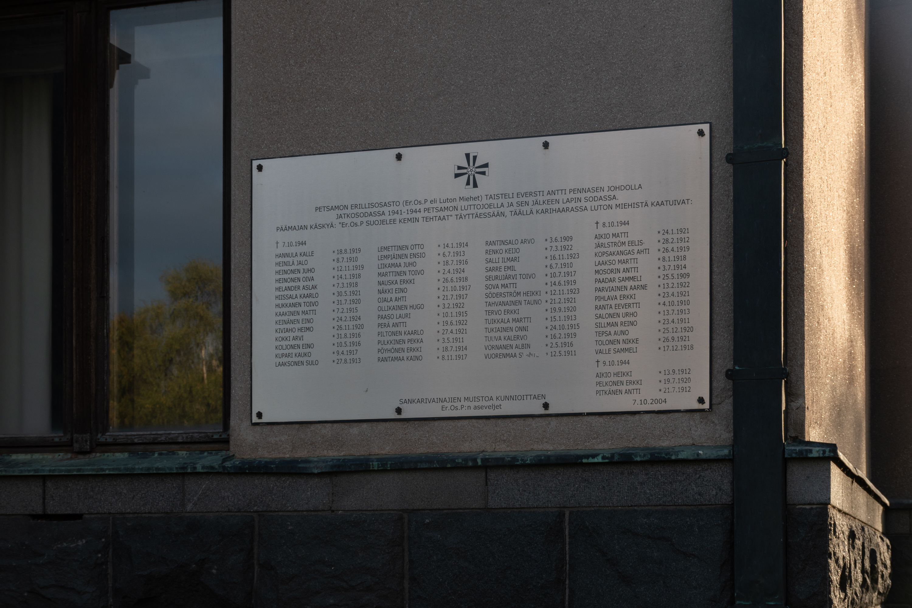 61. На стене конторы можно найти памятную табличку Печенгскому отдельному отряду (Petsamon erillisosasto, ErOsP), он же отряд Пеннанена (Pennasen osasto), он же "люди Лотты" (Luton miehet). Как следует из названия, это подразделение, фактически отдельный батальон, под командованием полковника Антти Пеннанена, большую часть войны сражалось в Печенге/Петсамо, в ее южной части, в районе текущей из Финляндии в Россию, в Тулому, реки Лотта, по-фински Лутто (Lutto). Его набрали из жителей Верхней Лапландии, а также, к примеру, из работников никелевых рудников Печенги, и в 1941 подчинили сражавшимся в Печенге и остальной Северной Финляндии немцам, поставили прикрывать пути сообщения. Больших сражений не было, линии фронта как таковой тоже не было, патрули и перестрелки.