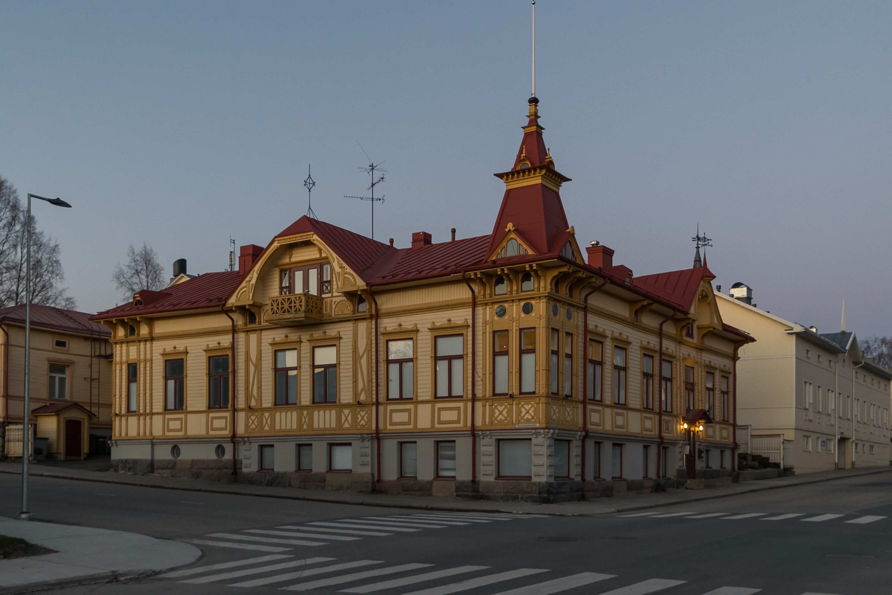 46. Самый, наверное, роскошный деревянный дом Кеми, дом Юннелиуса. Франс Юннелиус (Frans Junnelius, 1850-1916) был банкиром и председателем городского совета, дом этот построил в 1901. В числе прочего в 1981-2006 в нем работала региональная радиостанция Yle Kemi, она вроде до сих пор еще жива, но на других площадях; сейчас здесь частное жилье.