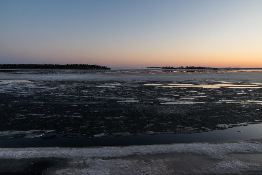 31. Итак, море! По состоянию на 10.5.2018 здесь все еще был лед, хотя и активно тающий; все-таки самый север Ботнии, в холодные зимы лед держится полгода, толщина его достигает метра и выше, а зима 2017-2018, моя первая зима в Финляндии, была, безусловно, холодная. Но даже и в теплые зимы в этом "Дальнем/Заднем море", Perämeri по-фински, ледоколам хватает работы. Справа на заднем плане отсвечивают лопасти ветряков в районе нынешнего грузового порта Кеми — в эту Внутреннюю гавань (Sisäsatama) большие суда давным-давно не заходят.