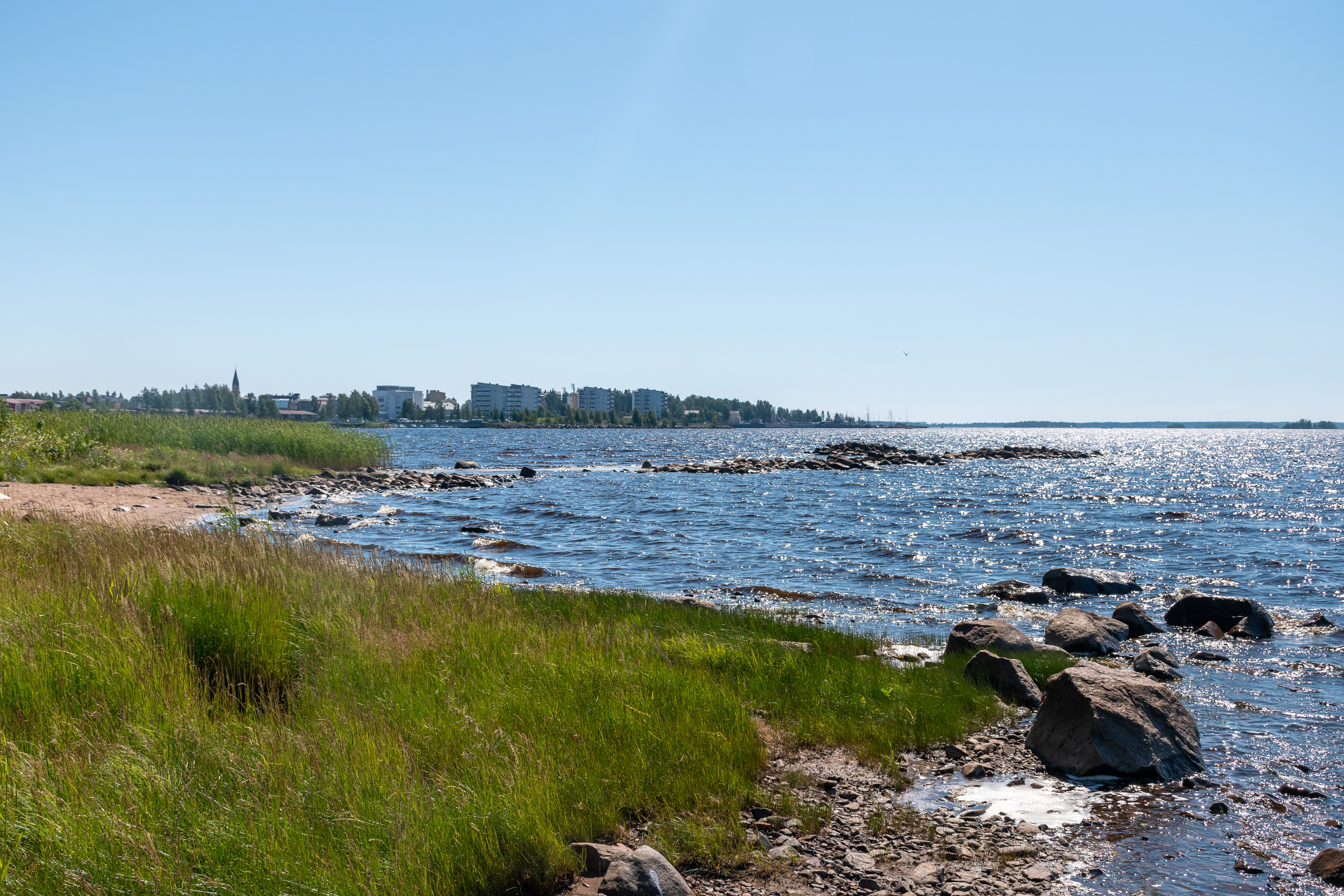 35. Но вернемся обратно; все же Кеми может похвастаться тем, что здесь и центр города стоит у моря, и худо-бедно, но отсюда даже видно немного открытое море. Почти все приморские города Финляндии реально стоят или у устья рек чуть в стороне от берега, или прикрыты от моря архипелагами. Реально в центре города можно выйти на набережную, чтоб там было прямо море-море, только в Хельсинки, Ханко и Котке. Ну и вот с натяжкой, но в Кеми все-таки можно, более-менее единственном из ботнических городов.