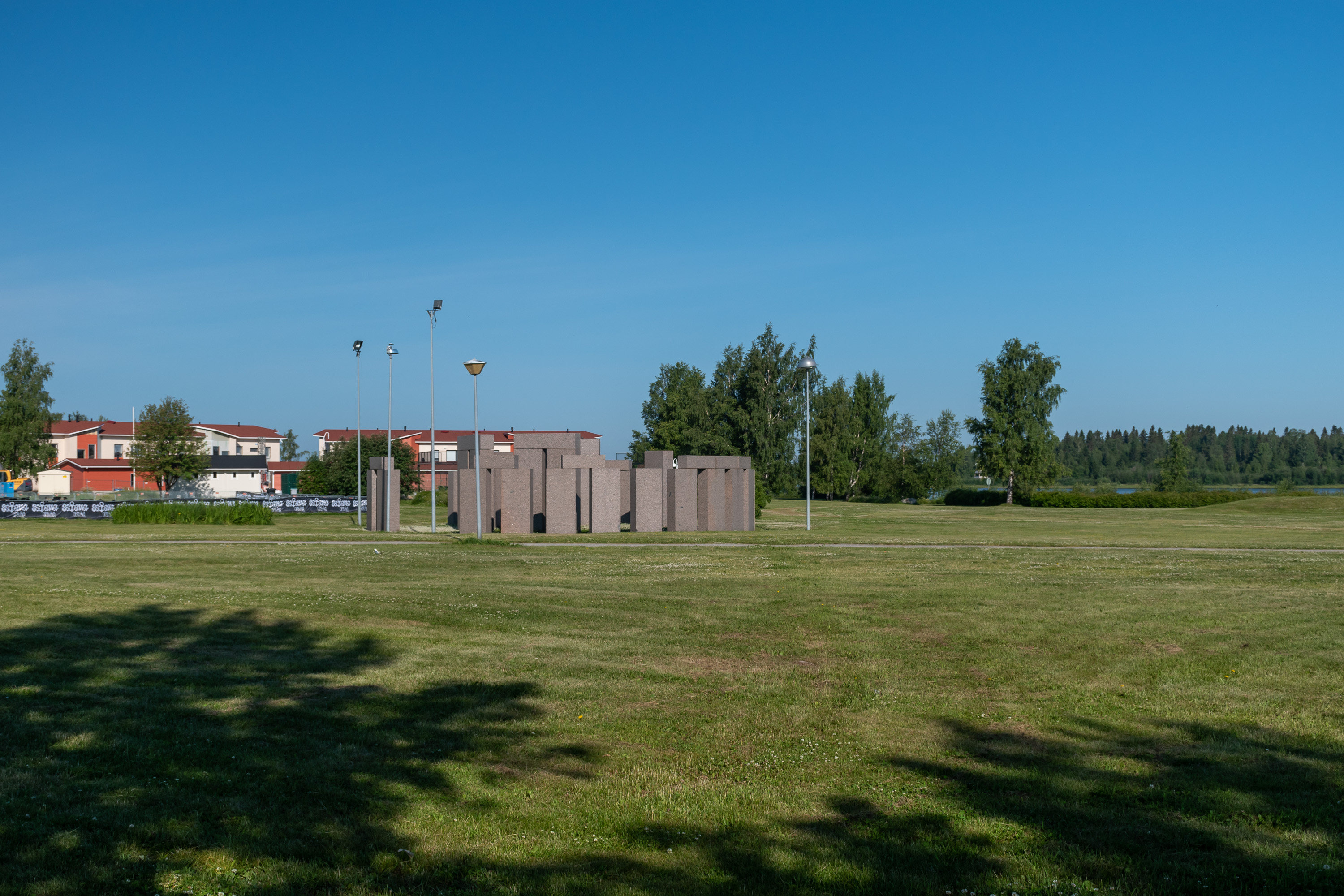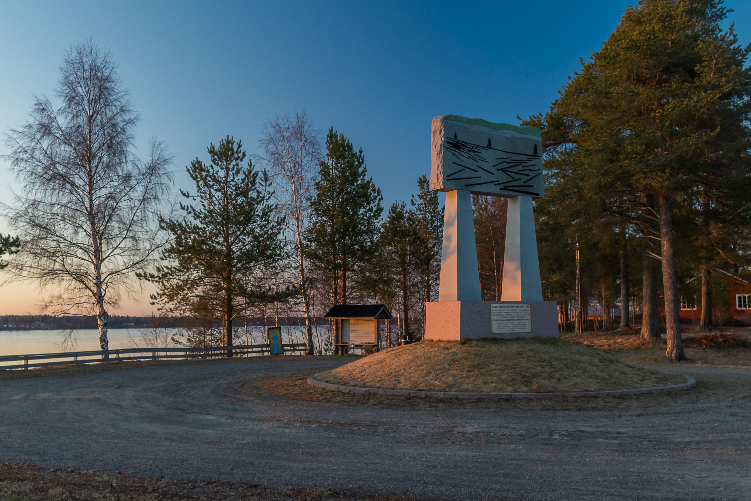 80. Это снова 2018, не знаю, как я додумался сюда тогда заехать, но место красивое, и тут стоит памятник лесосплаву на Кемийоки. Лесосплав, бывший когда-то основным способом доставки леса с делянок на заводы, давно ушел в прошлое (иначе как лесосплав в плотах на Сайменской озерной системе), и на Кемийоки в частности закончился в 1991 году. Теперь все возят грузовиками, и где можно — поездами. До 1-2 млн. куб. м леса в год сплавляли по Кемийоки, написано на памятнике, и трудоустраивало это тысячи работяг.