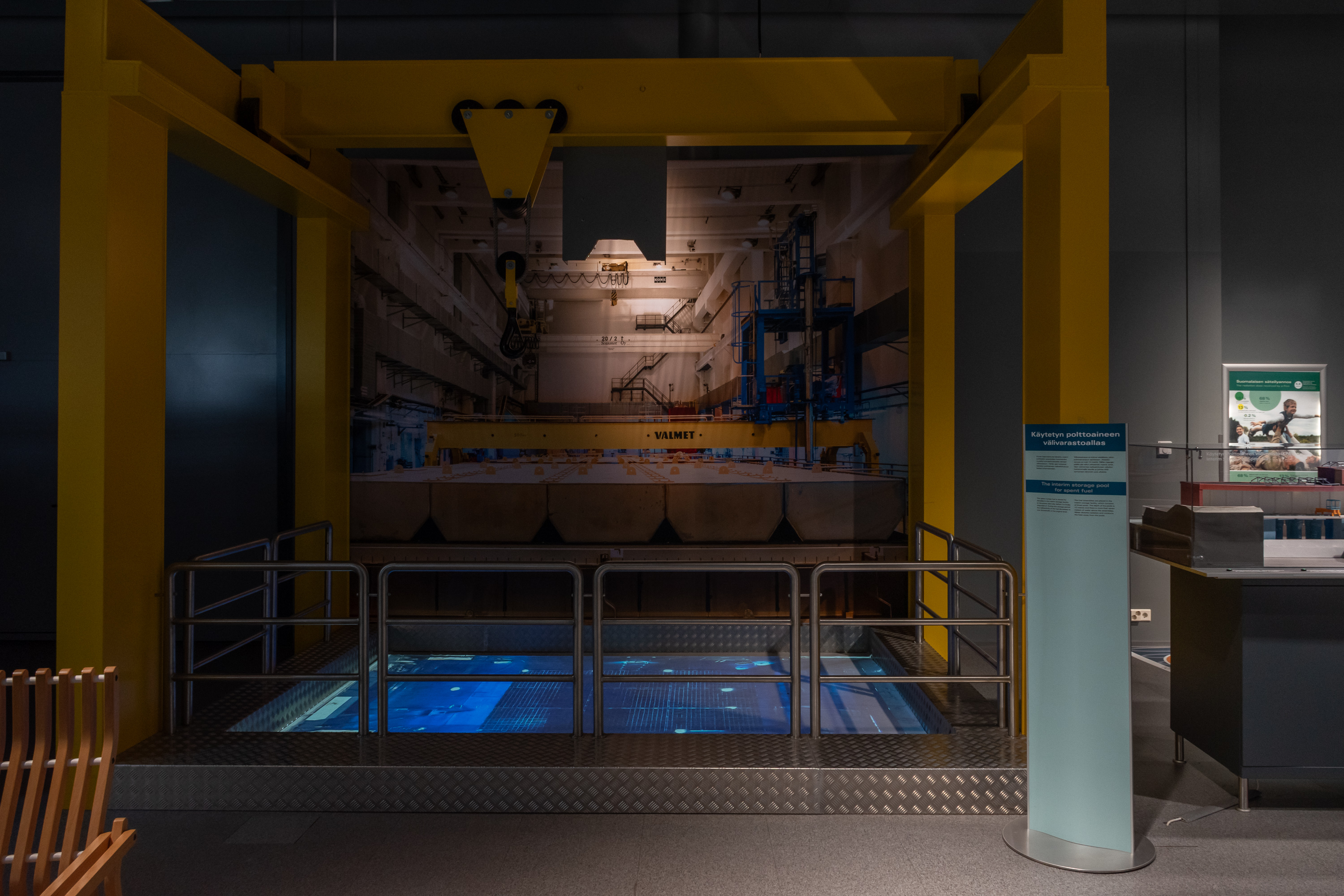 На АЭС отработанное топливо сначала кладут в находящийся непосредственно там же бассейн выдержки, где оно должно полежать хотя бы несколько лет, пока в нем сохраняется высокая остаточная радиоактивность, и оно требует непрерывного охлаждения. На фото как раз модель такого бассейна с Олкилуото. Под толщей воды топливо не представляет какой-либо опасности, а воды в бассейне достаточно много, что даже при достаточно серьезных авариях она не успела бы выкипеть. Вода также не представляет серьезной опасности сама по себе — возможные радиоактивные включения в ней удаляют постоянной фильтрацией (эти фильтры как раз и представляют собой один из видов упомянутых выше среднеактивных отходов), а собственно вода радиоактивной в таких условиях стать практически не может.