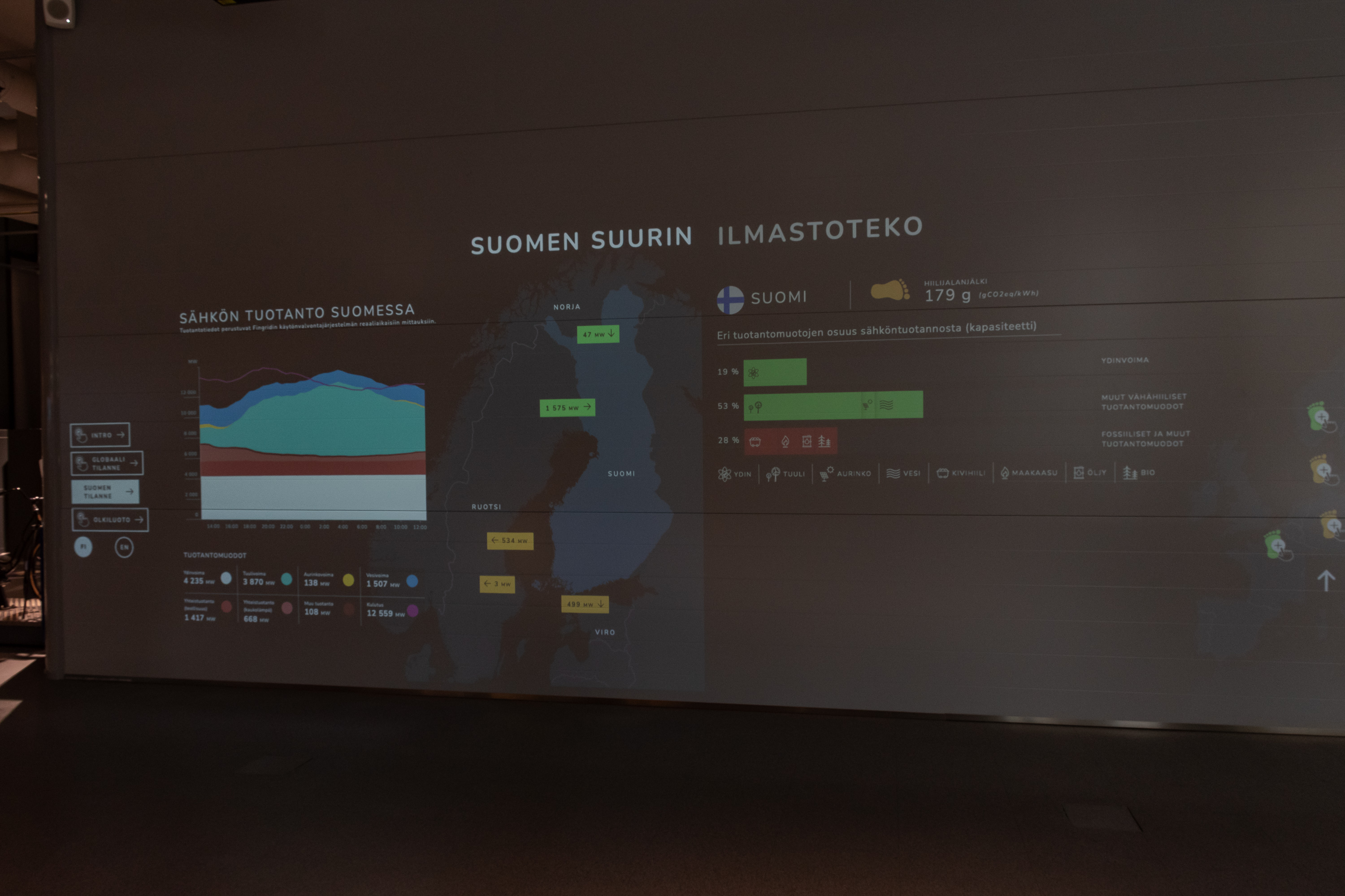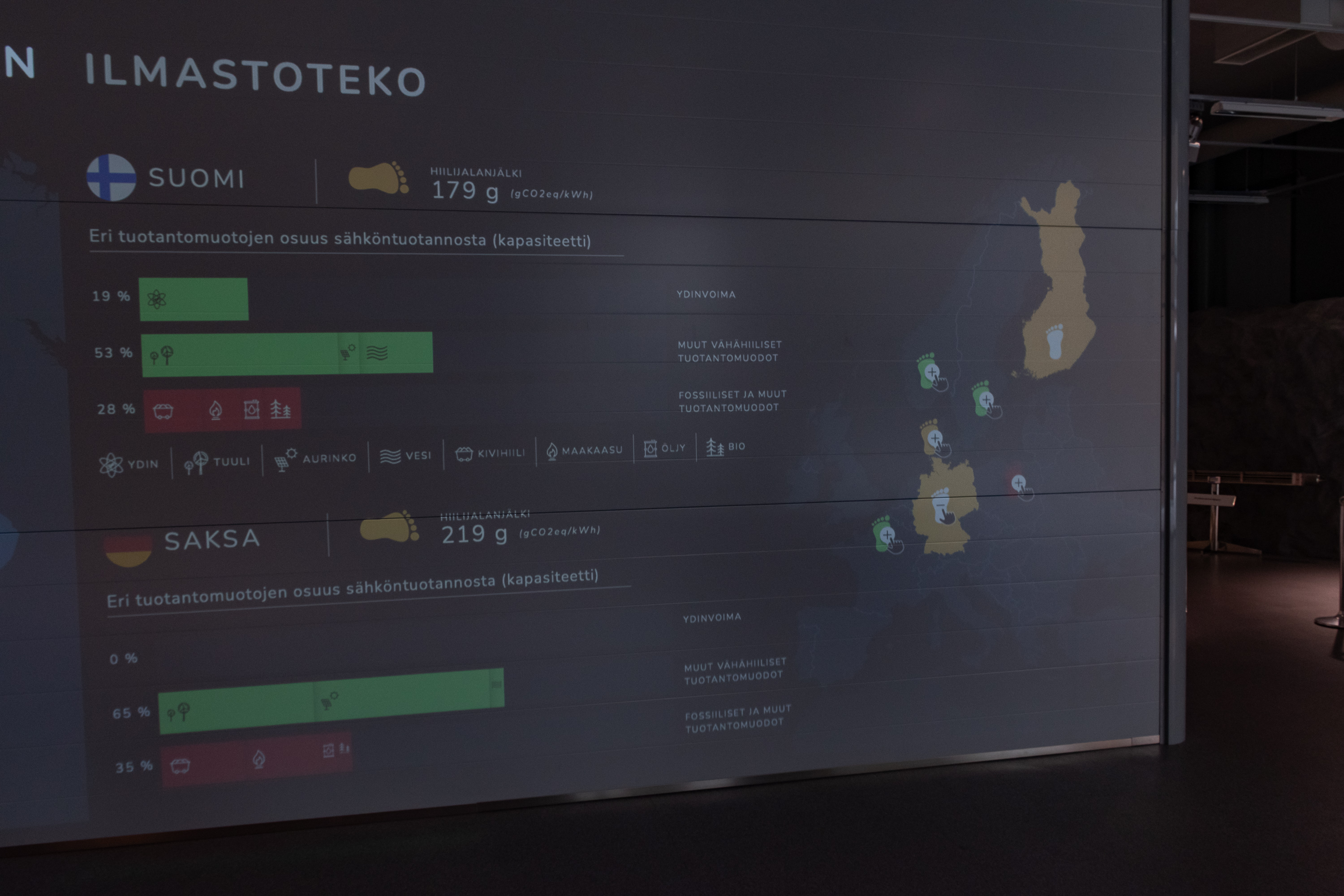 25. И, разумеется, в Финляндии не могли не подчеркнуть, что ядерная энергетика — "зеленая", в том смысле, что не имеет выбросов CO2. Тут можно потыкать и сравнить ситуацию по выбросам CO2 от электрогенерации с несколькими другими европейскими странами. Верхнее зеленое — АЭС, нижнее зеленое — другая "зеленая" генерация (ГЭС-ветряки-панели), красное — "плохая" тепловая. Германия, закрывшая, как известно, непонятно зачем все свои АЭС, в этом плане не блещет, хотя совсем все тут плохо у Польши. В целом, хоть я и не считаю, что нам тут в Финляндии надо всем жертвовать ради спасения климата, но если электричество можно производить без выбросов CO2 достаточно экономично, то почему бы, конечно, и не производить. У Германии, насколько я знаю, получается не очень в плане экономичности, а вот у Финляндии вполне неплохо.
