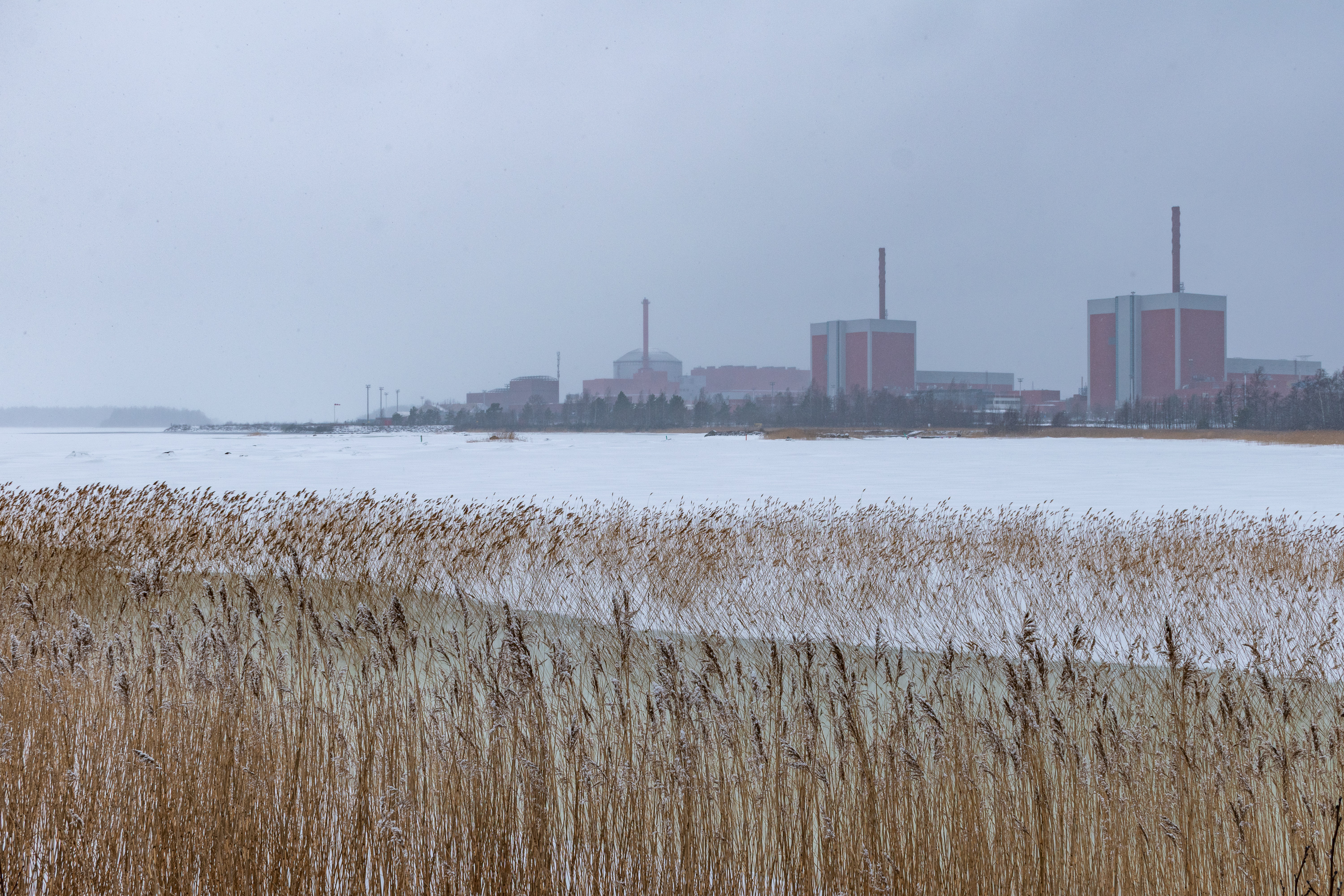 28. Так что вот она, АЭС! Видна с расстояния в километр через залив. Справа налево энергоблоки Олкилуото-2, -1, и, другой формы, округлый, Олкилуото-3. Пологое темное здание с небольшой вышкой левее Олкилуото-3 — бассейн выдержки отработанного топлива.