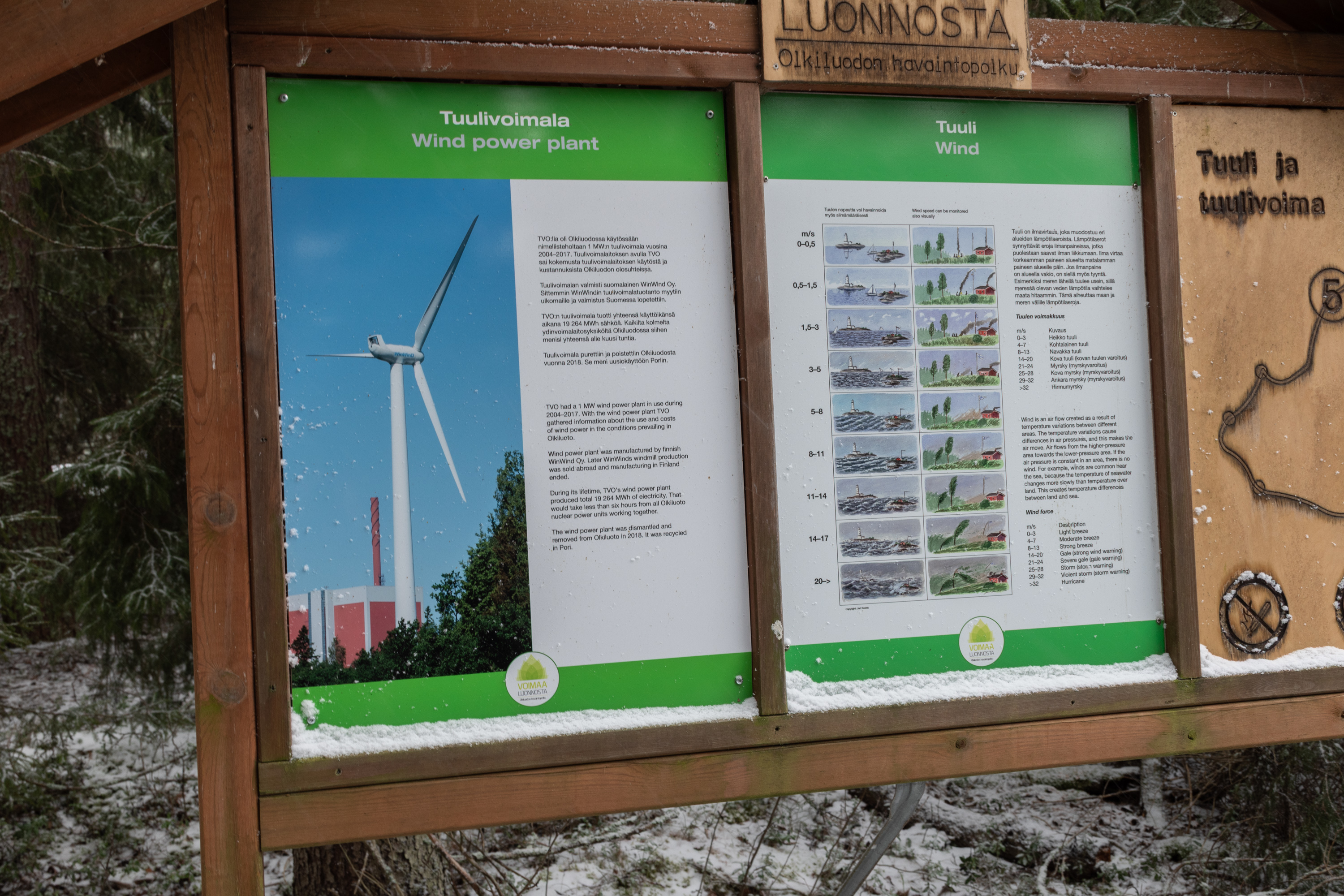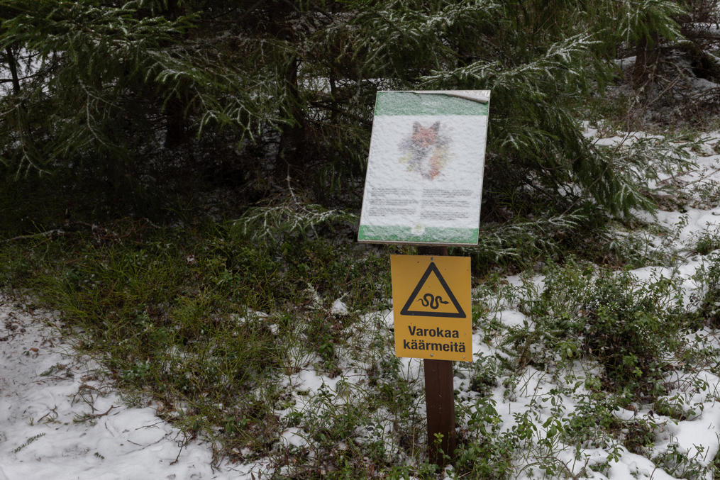 31. Тропа дальше отходит от берега и идет по лесу вокруг визит-центра и его парковки. Она оборудована информационными табличками, в основном про обыкновенные растения и животные финской природы. Впрочем, вполне можно предположить, что как раз на Олкилуото могут бывать посетители, с остальной финской природой не слишком знакомые. Еще таблички говорят особо остерегаться змей.
