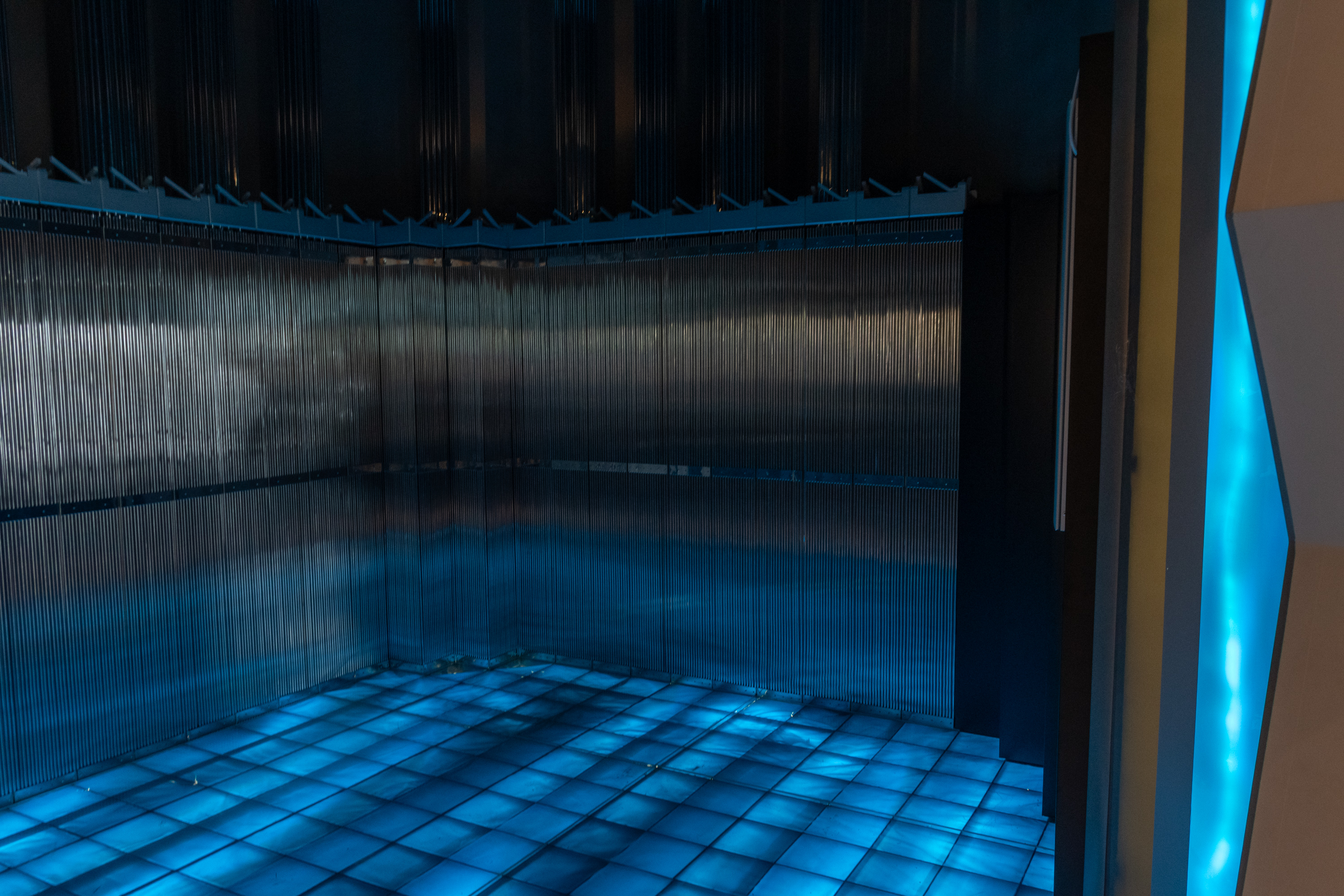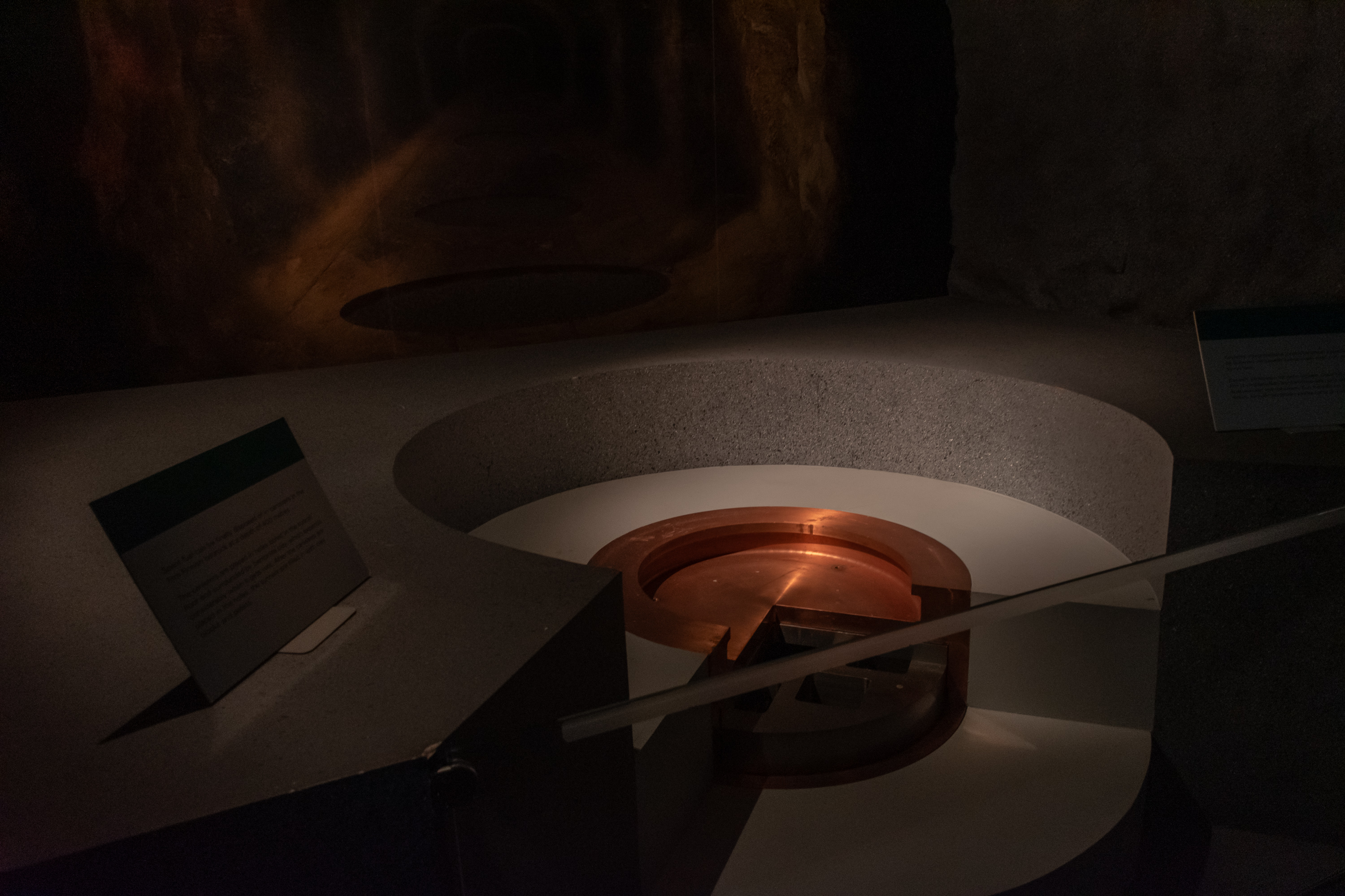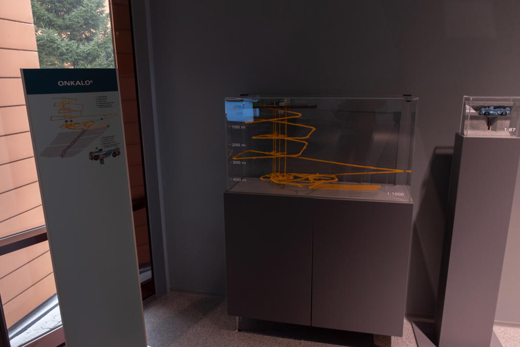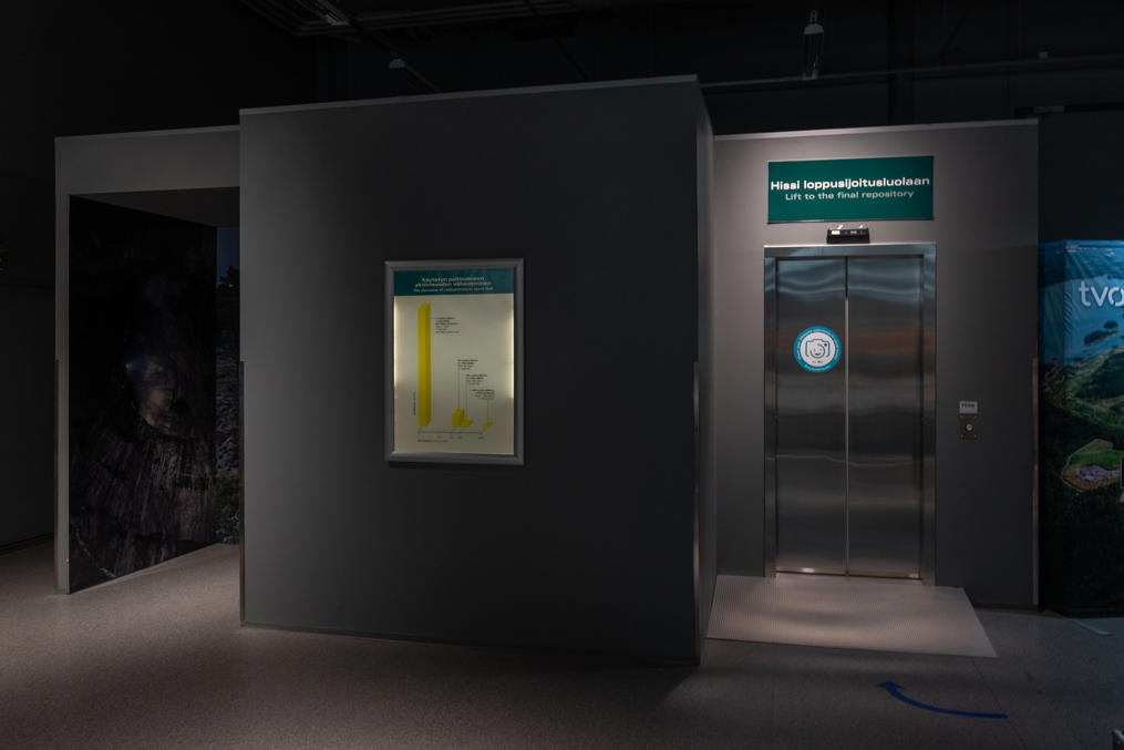 18. В этом месте в визит-центре посетителям предлагается спуститься на лифте в хранилище ядерных отходов Onkalo (фин. пещера, полость). Я даже не понял сначала, ведь хранилище не прямо в этом месте, да и разве пускали бы без экскурсий просто так? На самом деле, конечно, никто никуда не спускается. Но лифт довольно аутентичный, вплоть до таблички производителя Kone и кнопки для связи с диспетчером, и звуки и вибрацию издает тоже очень аутентичные. Но, наверное, реальный лифт спускался бы существенно дольше, чем этот, потому что спускаться надо было бы на глубину более 400 м.