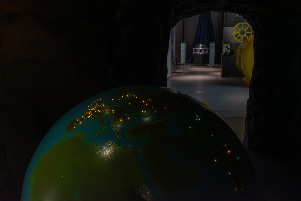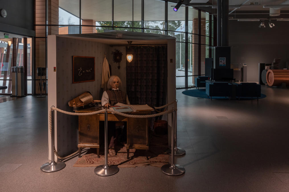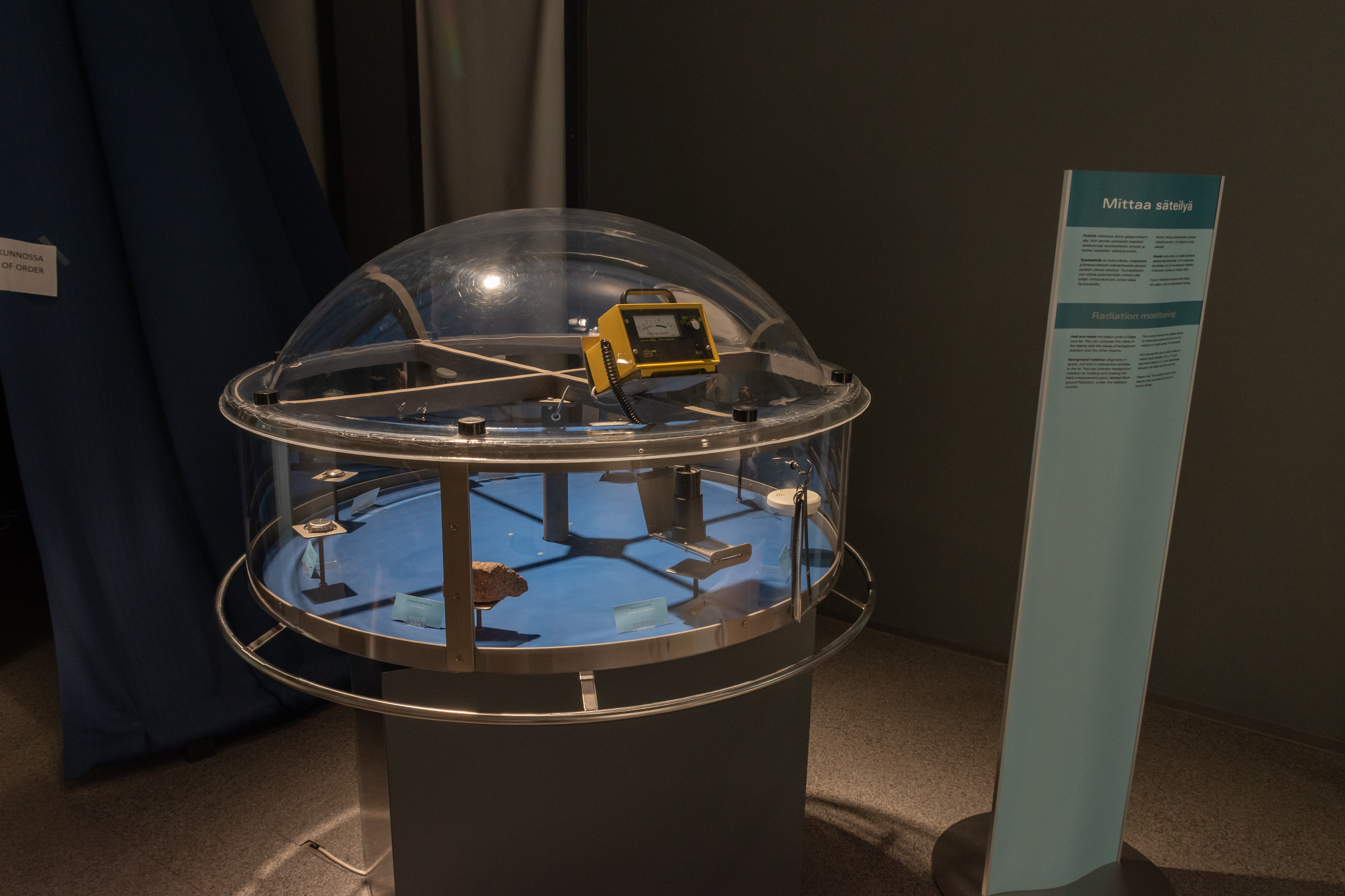 14. Интерактивных экспонатов, не считая отдельных кнопок, тут немного, но можно покрутить этот столик с разными предметами под счетчиком Гейгера — над куском гранита из финской земной коры он начинает щелкать почаще, а над старыми часами с радиевыми стрелками и куском урановой руды и вовсе сходит с ума. Должна быть еще камера Вильсона, в палатке на заднем плане, но, написано, не работает. Табличка повествует, что средний финн получает дозу радиации в 5.9 мЗв/год, из которой 68% от радона в воздухе в помещениях, 19% от остального природного фона, 13% от медицинских обследований, а также около 0.2% (0.01 мЗв/год) от осадков Чернобыля.