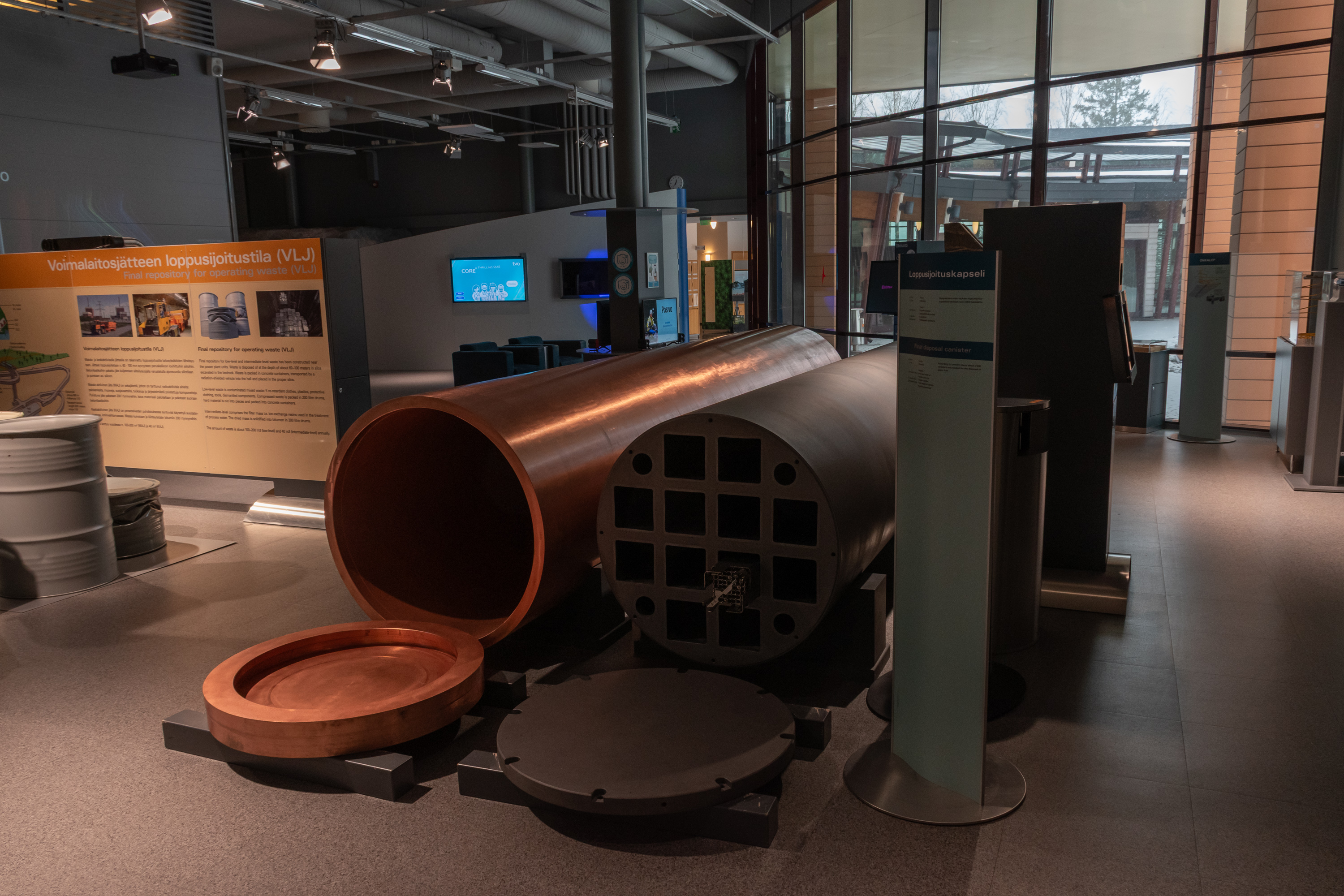 21. Так, собственно, выглядят капсулы, которые должны будут использоваться в Onkalo. Внутренняя — чугунная, с гнездами под отдельные ТВС, внешняя — медная. Завод по упаковке топлива в капсулы построен непосредственно над стволом шахты. Собственно, когда едешь в визит-центр Олкилуото, как раз Onkalo проезжаешь по пути. Пытаться снимать, даже на ходу, я все же не стал, все-таки тоже режимный объект. Ну, там ничего сильно интересного и не видно, обычное угловатое и скучное современное промышленное здание.