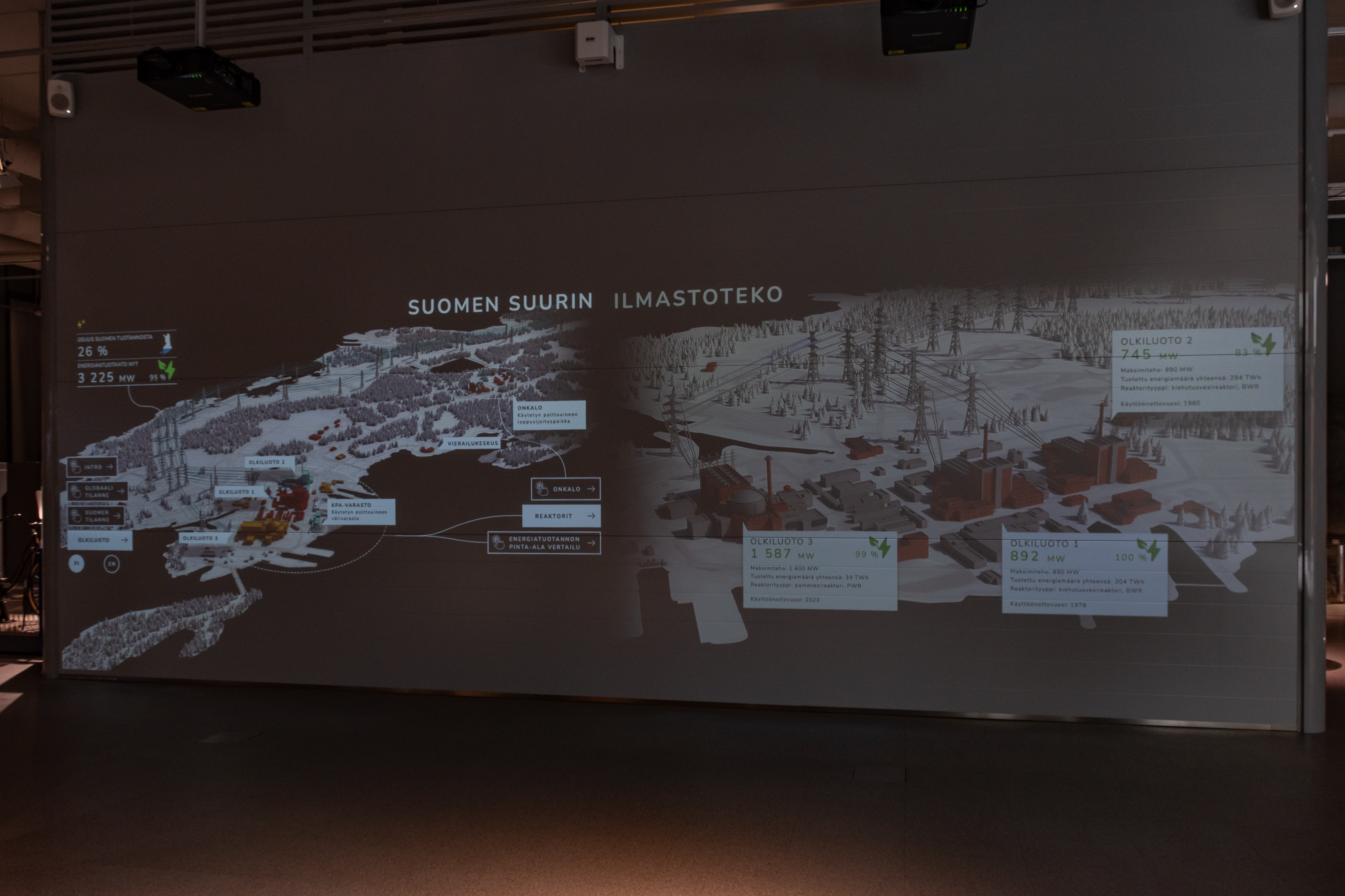 23. Напоследок на большом экране можно посмотреть разные цифры в реальном времени. Это схема территории Олкилуото — слева видны три энергоблока, бассейн выдержки (KPA-varasto), визит-центр (vierailukeskus) и Onkalo. И цифры текущей мощности. На момент моего посещения АЭС работала на полную мощность, вырабатывая 3225 МВт электричества, или 26% всего электричества Финляндии. Справа — разбивка по энергоблокам. Эти цифры можно посмотреть в любой момент на сайте TVO, чуть проскроллив там вниз.