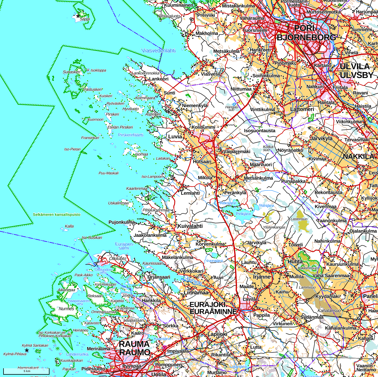 Эурайоки (Eurajoki, швед. Euraåminne) — сельский муниципалитет на юго-восточном побережье Ботнического залива, в области Сатакунта, вклинившийся между городами Пори и Раума. Как можно догадаться по названию, он находится в устье одноименной реки средних размеров, через которую стекает в Ботнию весьма крупное по меркам Южной Финляндии озеро Пюхяярви. Озеро и поселки Эура и Кауттуа в верховьях реки мы видели в прошлом году, теперь и про эти места стоит поговорить.