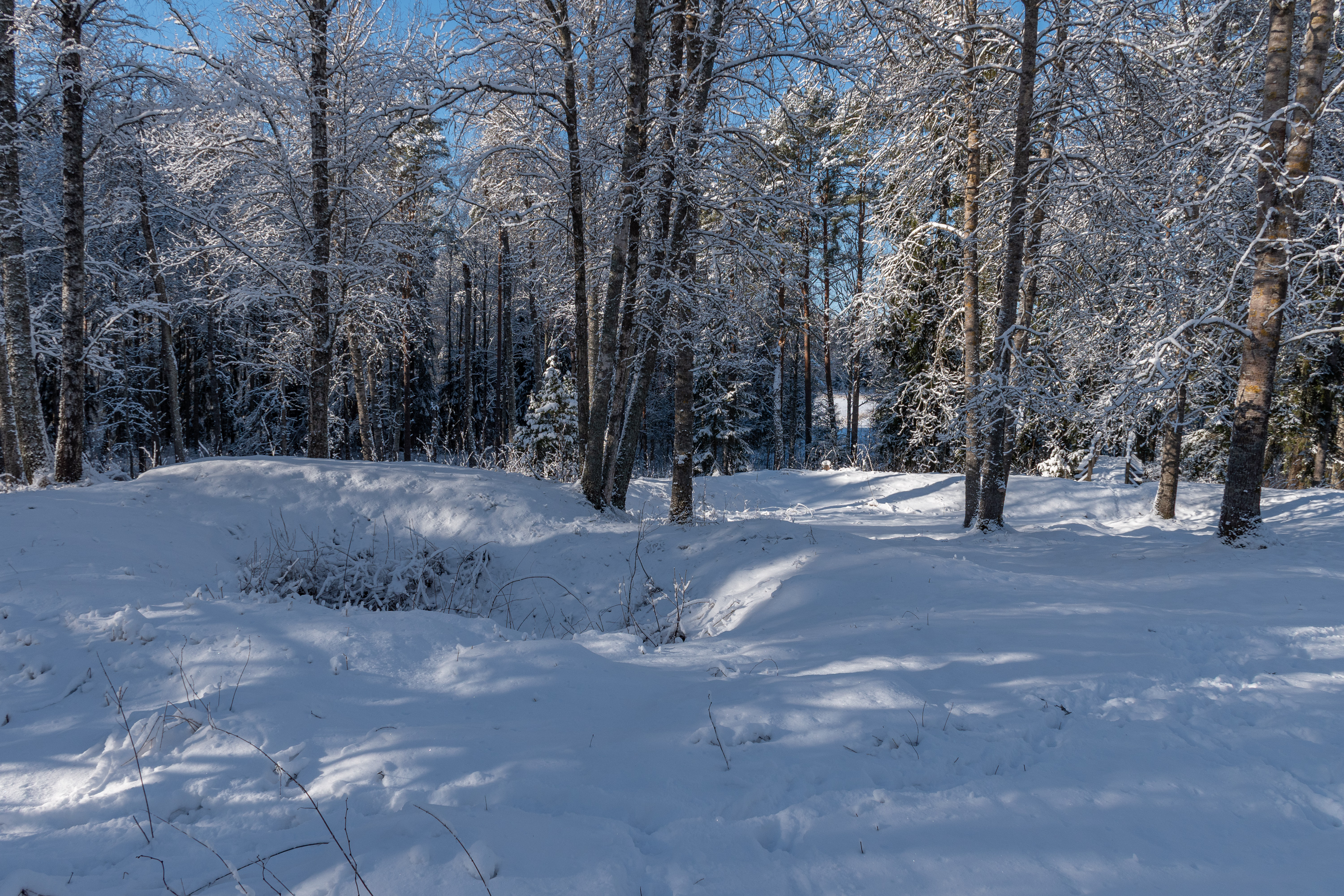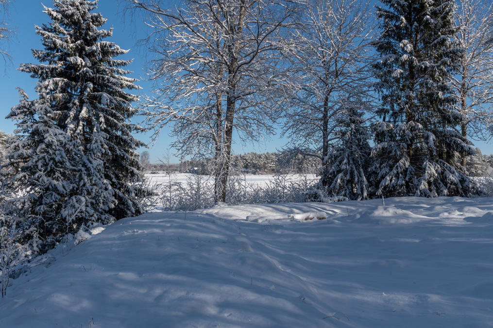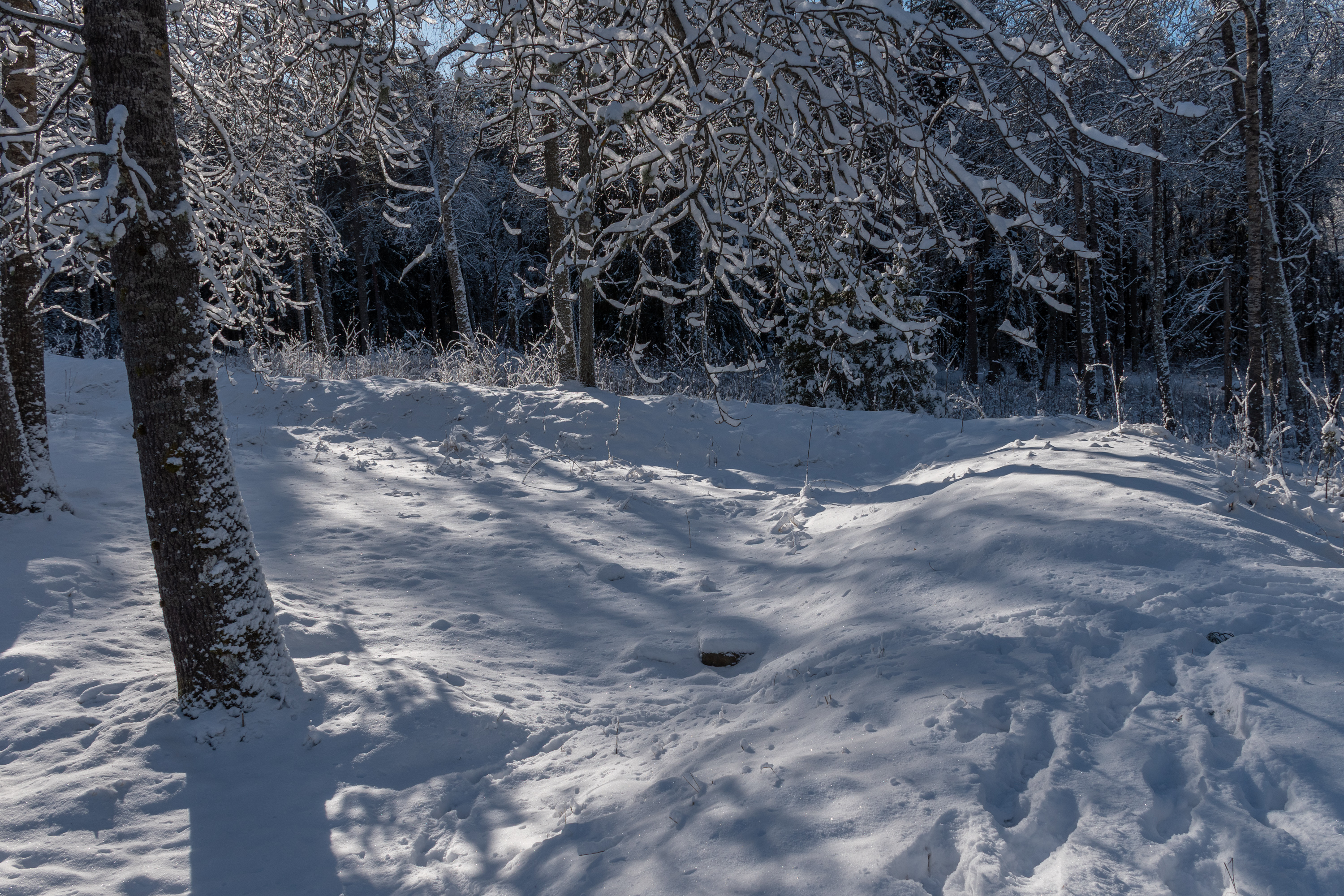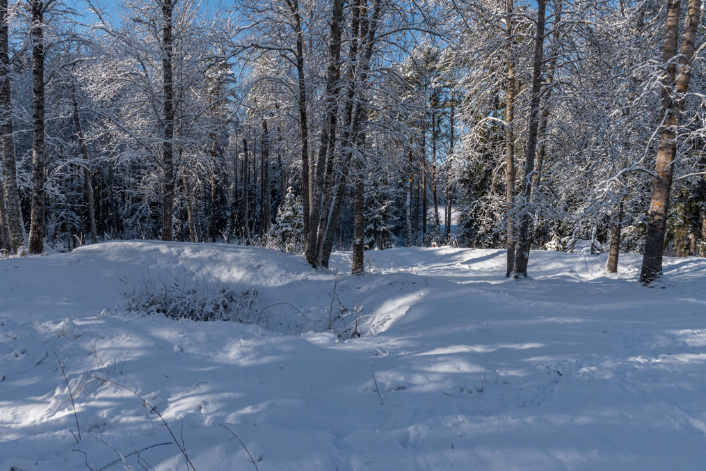 1. Но начнем мы с самой старой исторической достопримечательности, лишь в километре от современного устья реки Эурайоки и в несколько сотнях метров от ближайшей бухточки побережья: руины крепости Лиинмаа (Liinmaan linna). Конечно, руины — громковато сказано. Вот этот холмик маленький в лесу — это оно и есть. Различить здесь можно лишь несколько небольших земляных валов, а под снегом и того сложнее.