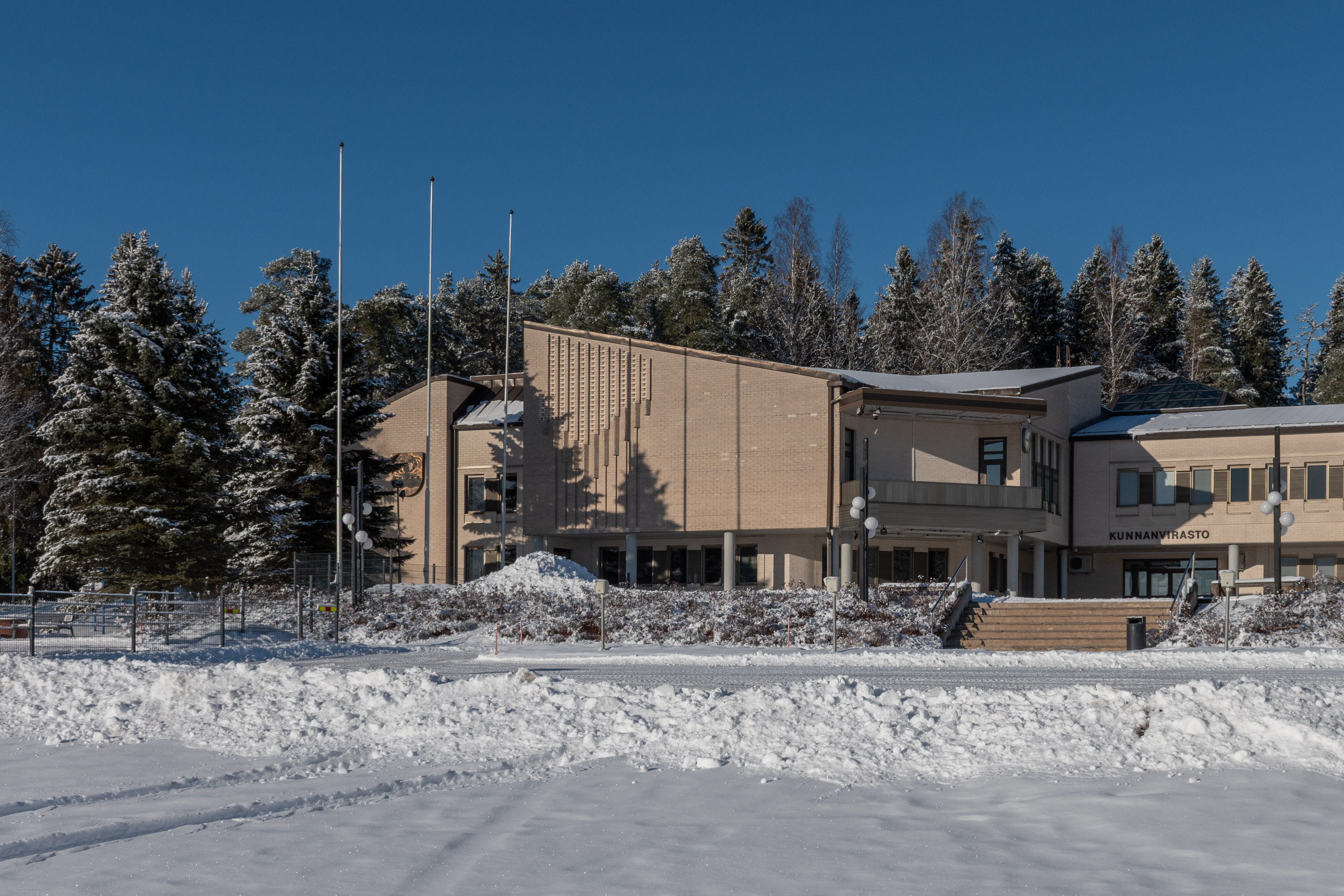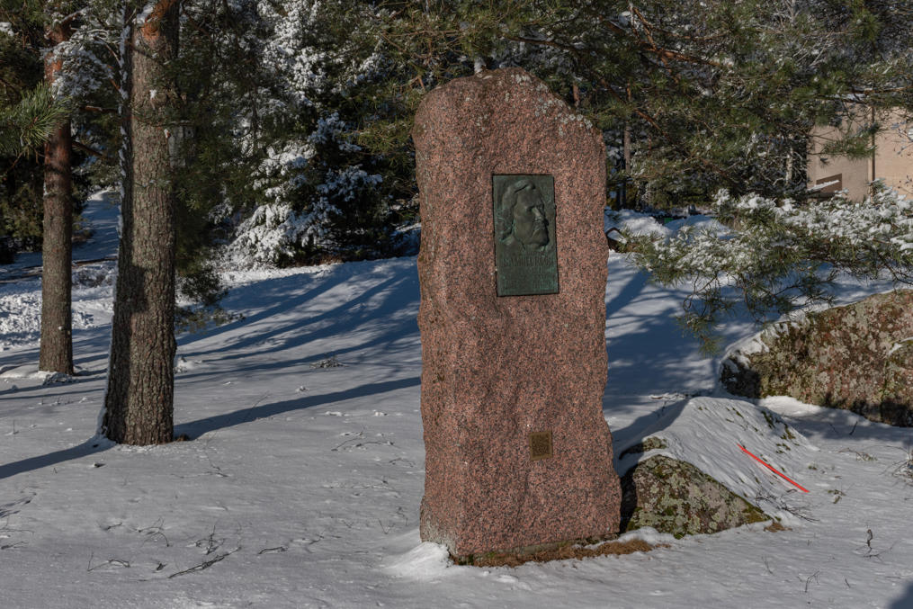 56. У администрации стоит памятник известнейшему местному уроженцу, Самуэлю Роосу (Samuel Roos, 1792-1878). Роос был из крестьянской семьи, однако поступил в университет в Турку и выучился там на врача, после чего устроился уездным врачом в Каяани — собственно, на этом посту он как раз предшествовал знаменитому Лённроту, автору "Калевалы". После этого он трудился врачом также в Йоэнсуу, Рауме и потом имел частную практику в сельской местности, в Мюнямяки и Вехмаа. Но прославился он тем, что, как и Лённрот, он имел большой интерес к финскому языку и его развитию, и в частности изобрел ряд слов финского языка, используемых с тех пор повсеместно. В первую очередь sähkö (электричество), также, к примеру, lämpö (тепло), kaasu (газ), kasvi (растение), särmä (ребро, в геометрии), то есть, в общем, в основном все термины околонаучные. Как получилось, что эти слова распространились и прижились, я, правда, не понял. Но позже в жизни он и научные труды о финском языке стал писать.