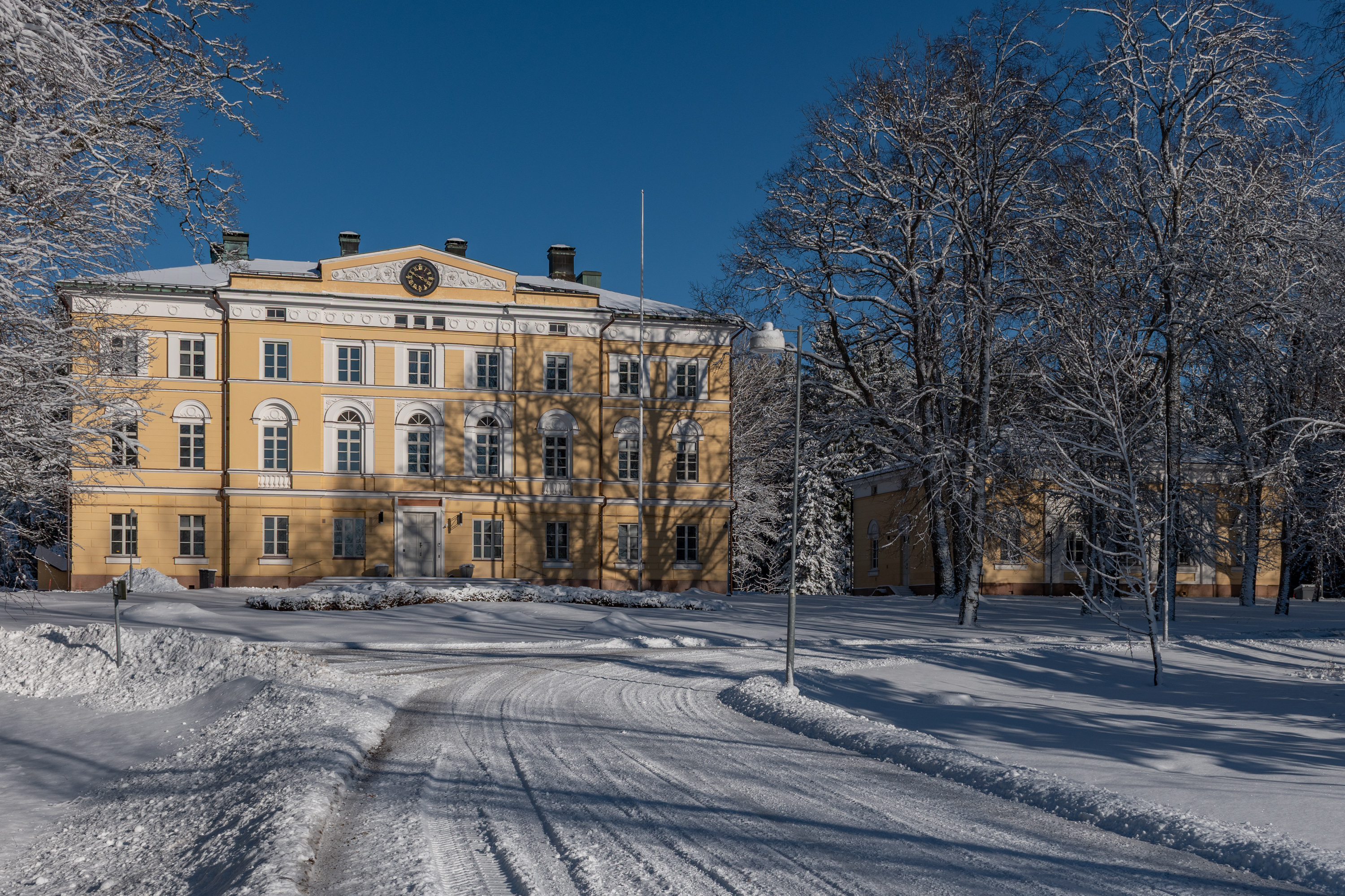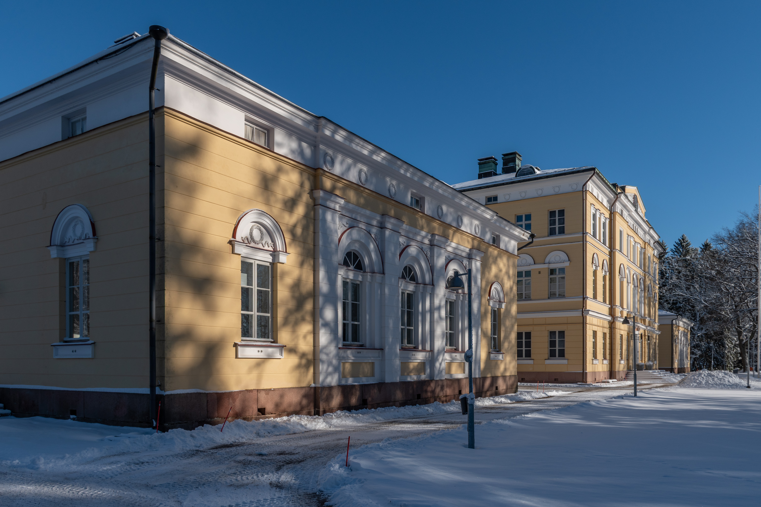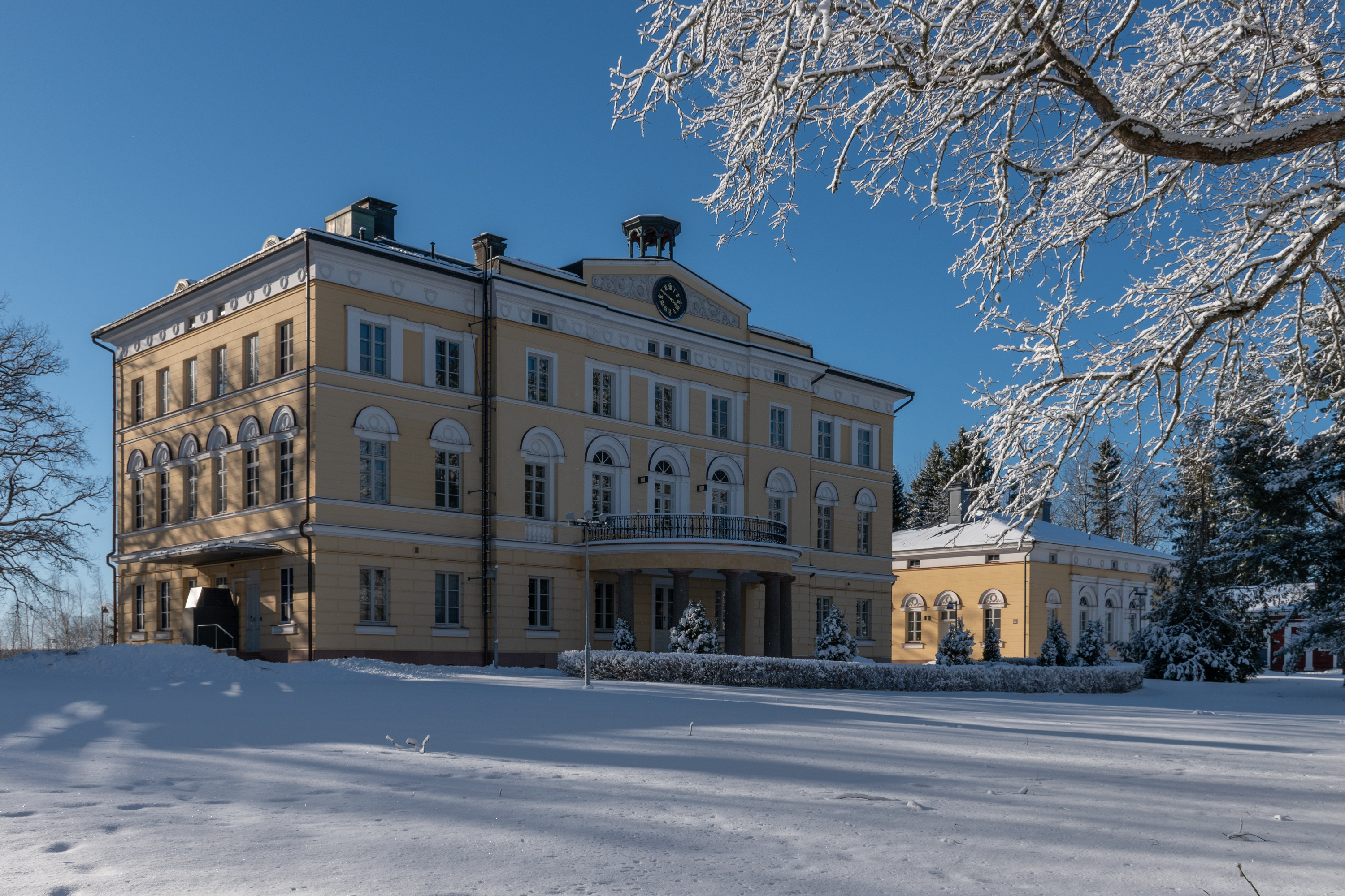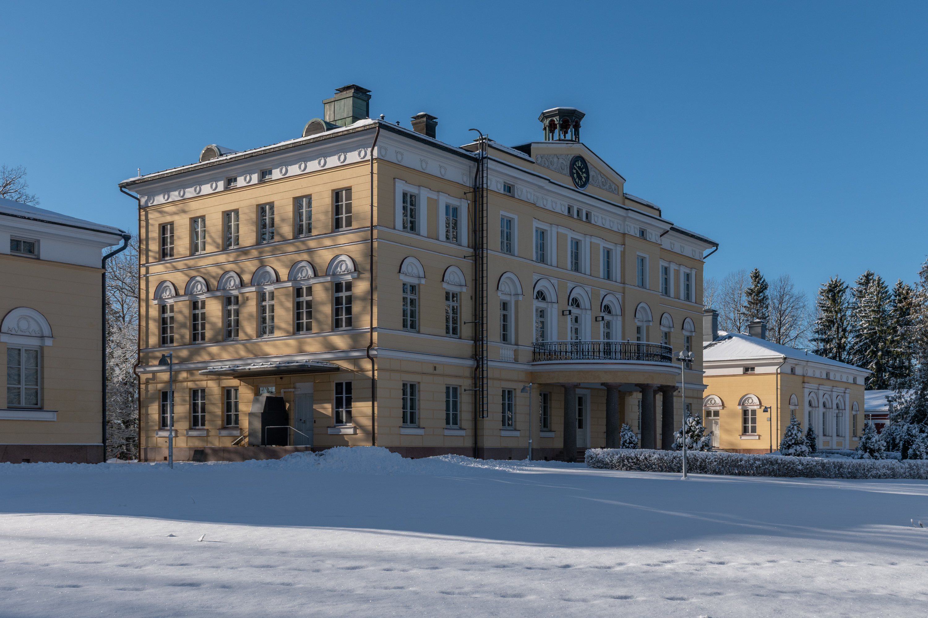 12. Главное здание датируется 1836 годом. Когда видишь в Финляндии такую классическую архитектуру, да еще и в этих желтых цветах, то с большой вероятностью не ошибешься, если предположишь, что это строил Энгель. К. Э. Энгель (Carl Ludvig Engel, 1778-1840) известен как архитектор центра Хельсинки, в первую очередь ансамбля Сенатской площади, с Кафедральным собором и дворцом правительства, но он много оставил после себя и во всей Финляндии — в общем-то самый выдающийся архитектор первой половины 19 века, я бы сказал. Для Бьёркенхейма Энгель построил не только Вуойоки, но и Орисбергскую заводскую церковь — единственную часть Орисберга, с которой сейчас можно ознакомиться постороннему. Над Вуойоки изначально работали также тоже весьма известные Басси и Гюлих, но окончательный проект был Энгеля.