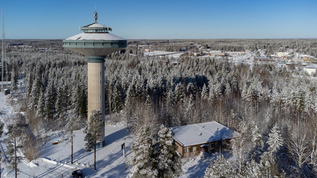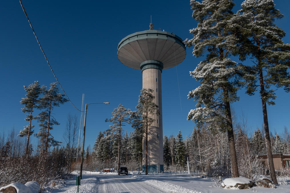 53. Водонапорная башня стоит на возвышенности чуть в стороне от центра поселка — виден на заднем плане справа. Типичная финская современная (1985) водонапорка, вполне симпатичная, как и другие подобные, но эта особо интересна тем, что на ней висит маятник Фуко.