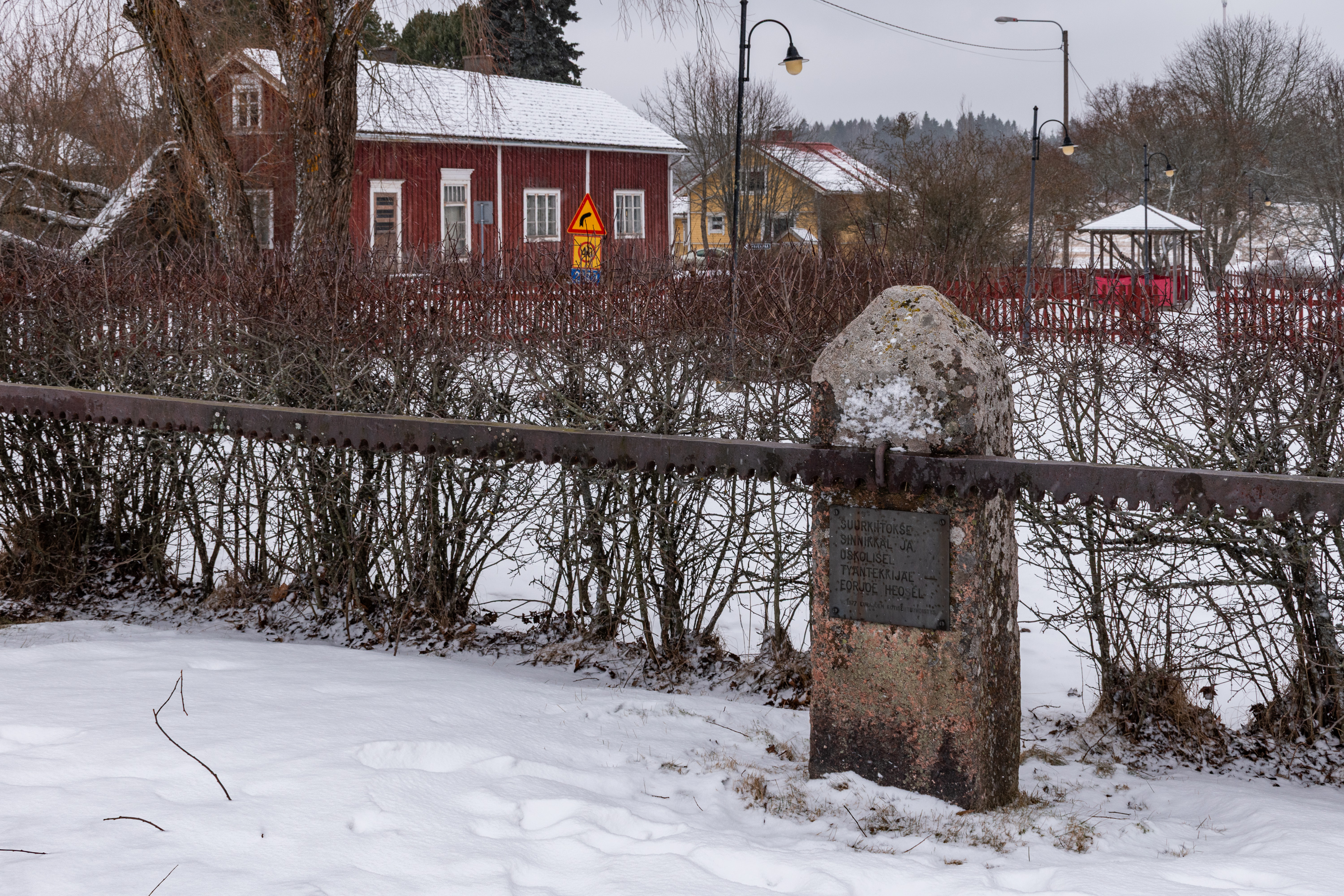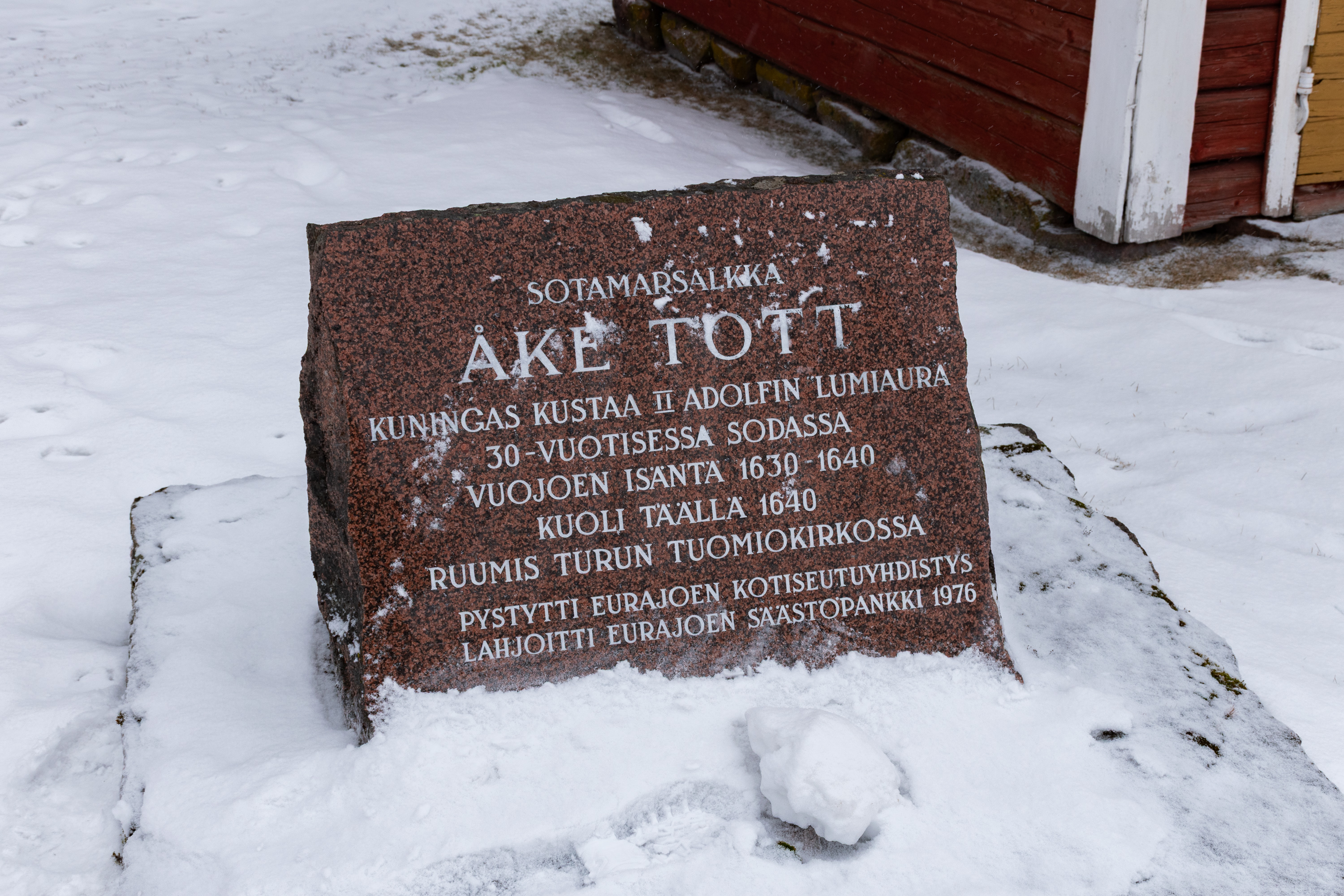 21. А перед церковью также находится памятник на месте смерти Оке Тотта (Åke Henriksson Tott af Sjundby, 1598-1640) — маршала Швеции, близкого соратника короля Густава-Адольфа II, и одного из самых знатных людей, похороненных в Финляндии за всю ее историю. Написано: "Маршал Оке Тотт, "Снежный Плуг" короля Густава-Адольфа II в Тридцатилетнюю войну, владетель Вуойоки 1630-1640, умер здесь в 1640, похоронен в Туркусском соборе. Памятник установлен краеведческим обществом Эурайоки, на средства Сберегательного банка Эурайоки, в 1976." Правда, в интернете пишут, что он умер в поместье Лавила, на окраине современного Эурайоки, так что я не уверен, что памятник именно в Ирьянне справедливо ставить. Но в любом случае он владел всеми местными поместьями — Лавила, Ирьянне (не знаю, где оно тут было), и, самое главное, Вуойоки — как я упоминал выше, Тотт был одним из его первых владельцев.