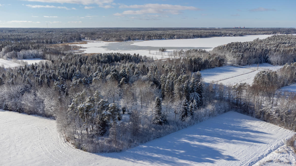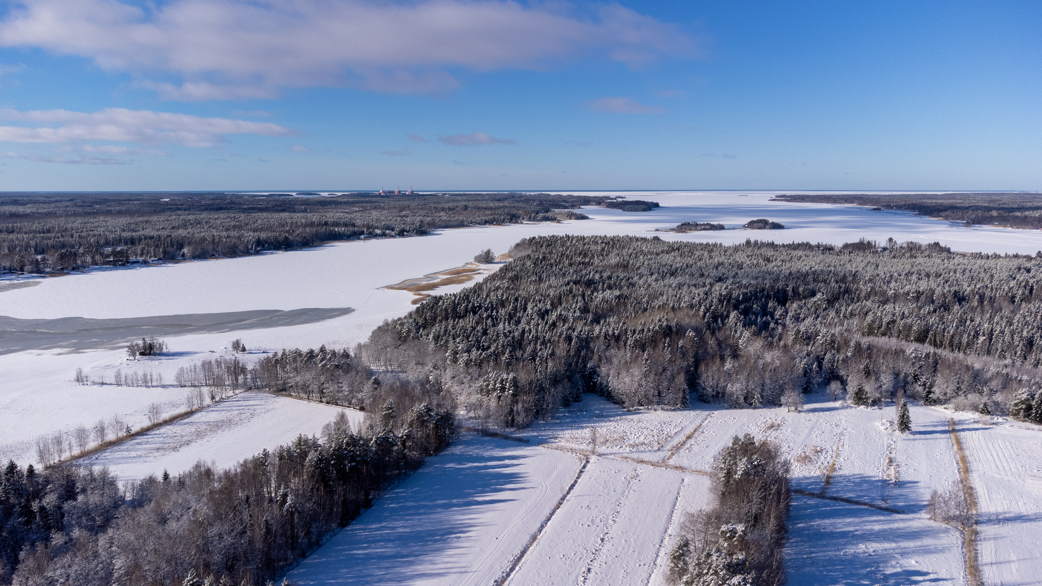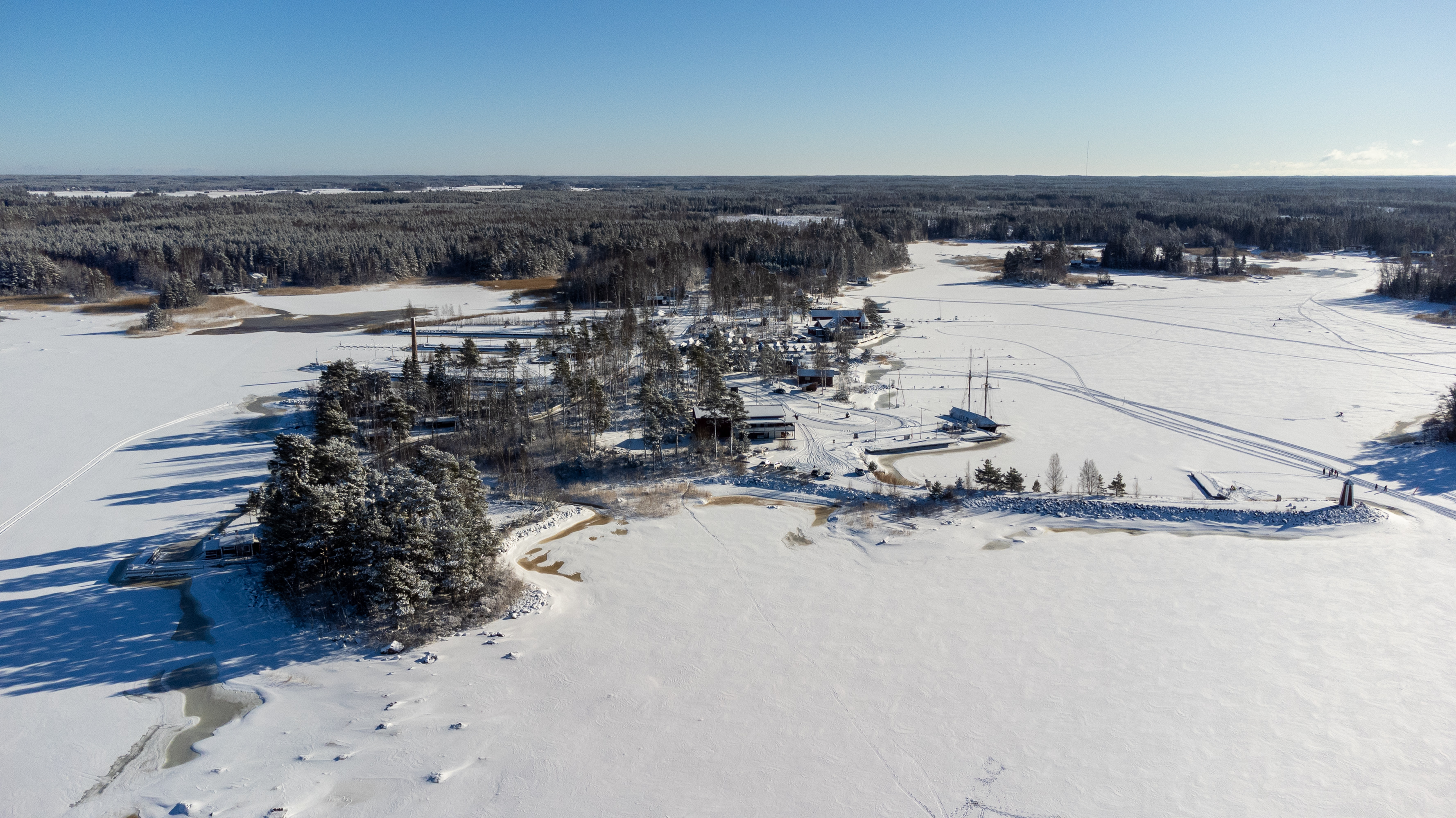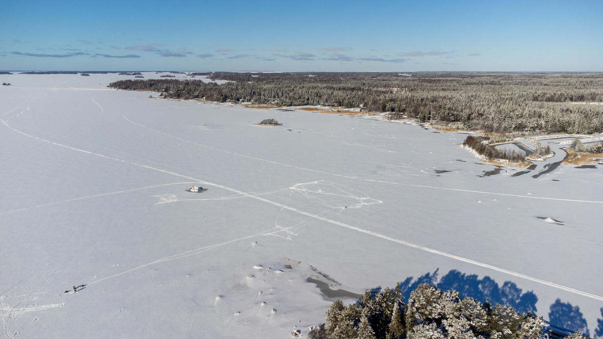 8. С воздуха тоже красиво, хотя очертания руин с воздуха разобрать еще сложнее, чем c земли. И почему на фото с дрона чаще баланс белого сильно разный получается даже после обработки? Ну, не буду переделывать, чего уж. На первом фото вдалеке видна АЭС Олкилуото — в 9 км по прямой — на таком расстоянии от нее летать еще можно :) Ну и море видно, конечно, — замерзшее, — заливчик Вяккярянперя справа. Впрочем, на горизонте хорошо видна полоска открытого моря. Хотя Балтика в зиму 2025-26 замерзала весьма основательно, эта южная широкая часть Ботнического залива (Selkämeri) все-таки, как обычно, осталась в основном открытой.