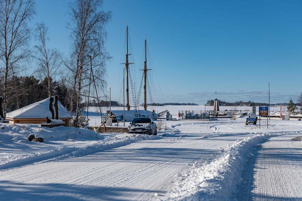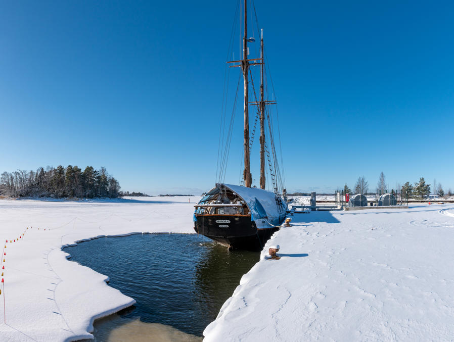 На севере Ботнического залива подобные галеасы называли jähti; там по крайней мере раньше из Кеми на таком были экскурсии на острова национального парка Ботнического залива — там я на такую ездил пять лет назад, пост писал. На "Ихана" не пробовал, а сейчас он, конечно, ждет весны, в конце мая у него сезон начинается. Интересно, что тут вот так вот обеспечивают, чтоб льдами его не зажало, — насос в воде работает.