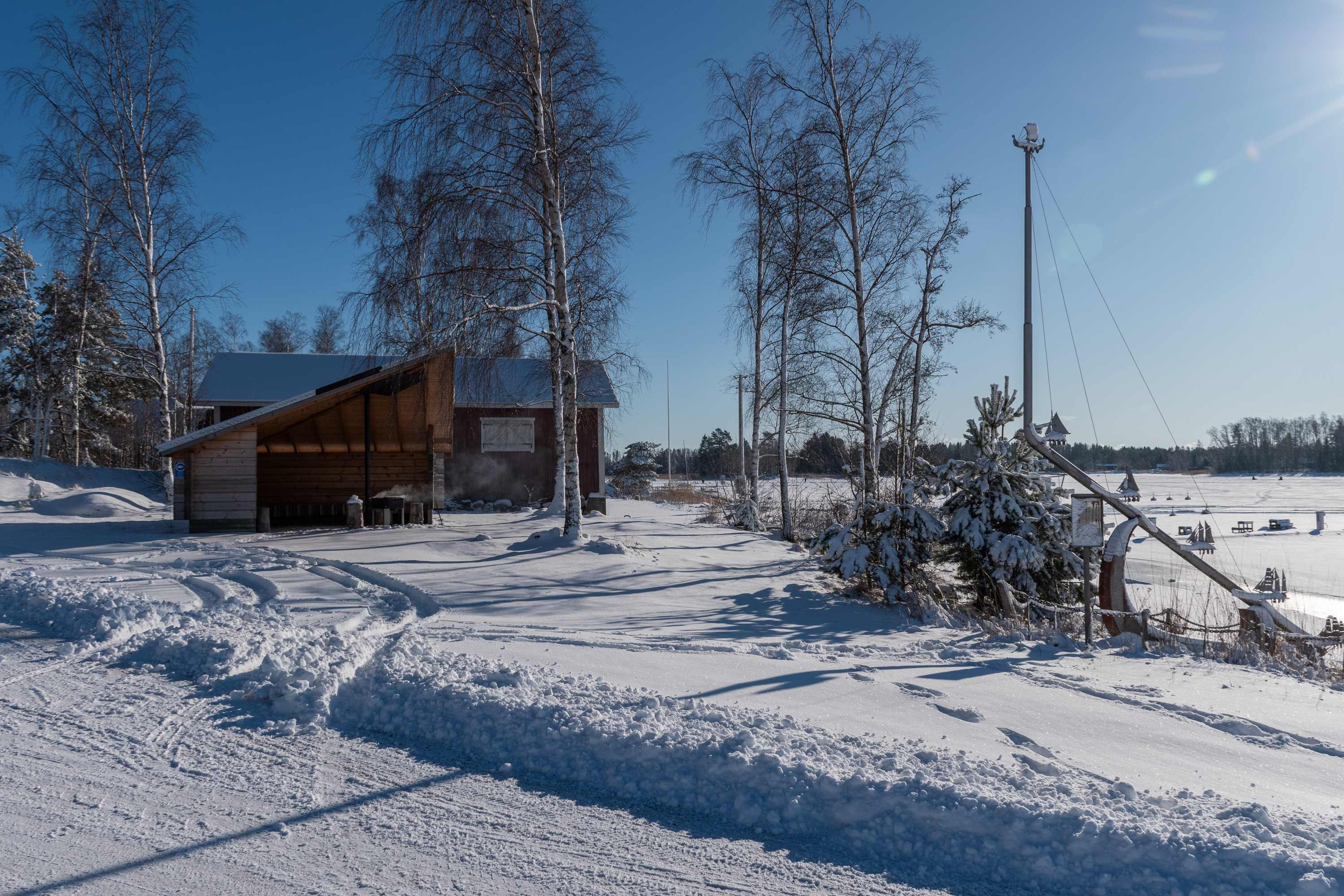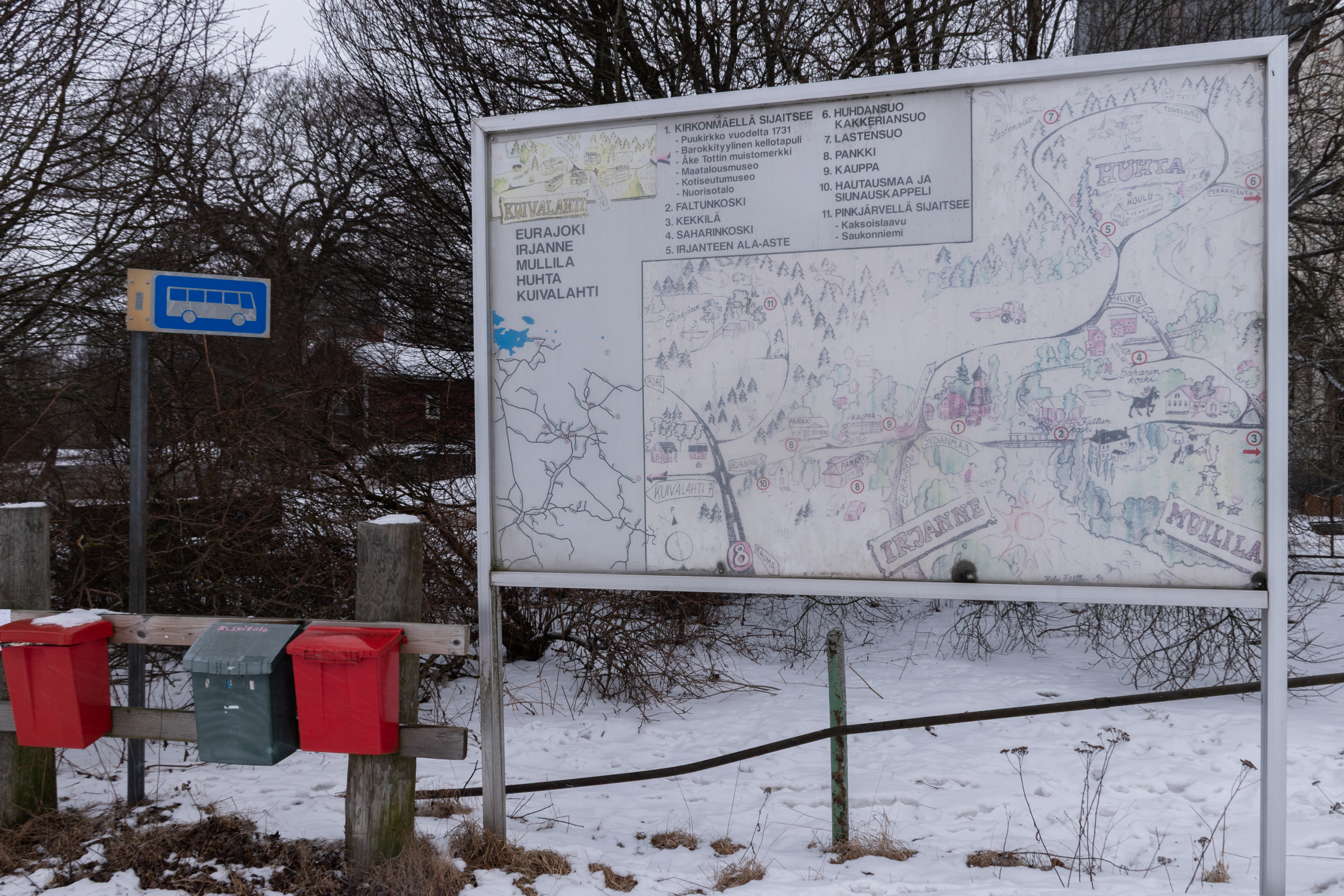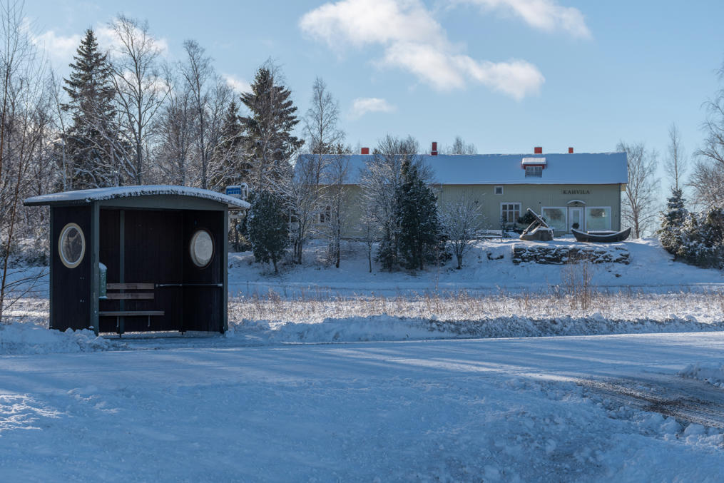 37. На въезде в село перед кафе в деревянном домике встречают лодка и якорь — последний от некоего старого галеаса "Вейкко". Автобусные остановки тут тематические тоже, с "иллюминаторами", хотя в само село вряд ли много автобусов заезжает, гораздо больше просто мимо по трассе проезжают и только на своротке останавливаются.