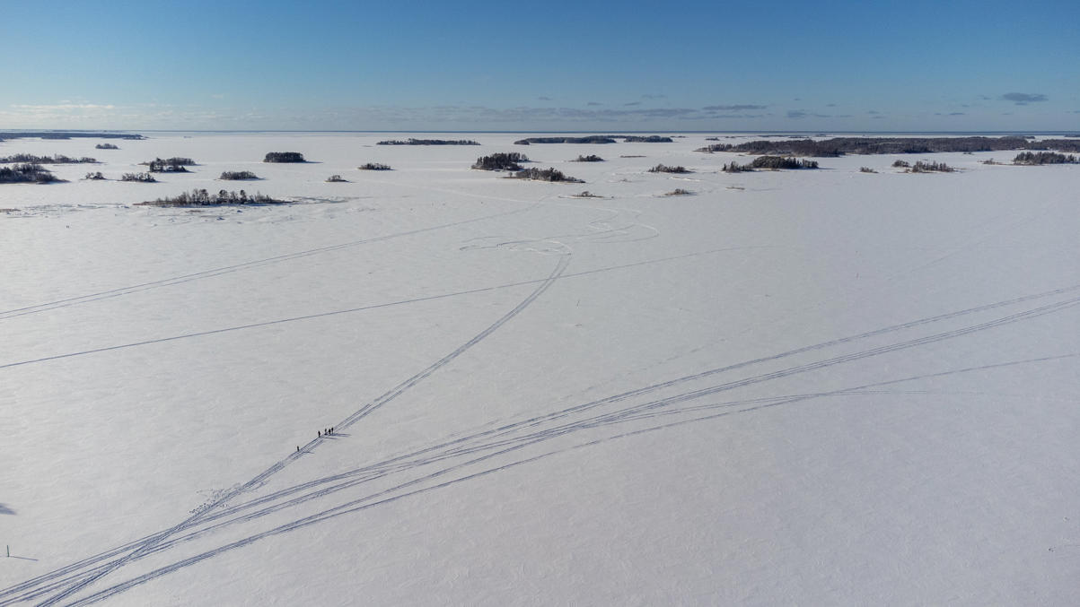 32. Архипелаг, расчерченный следами снегоходов. Но вроде бы не автомобилей, а то у нас под Ваасой и на машинах вовсю гоняют в такой сезон. Кто-то идет рыбачить, но, по-моему, больше просто по льду погулять. На горизонте и тут видно открытое море, но до него пешком все равно не дойдешь :)