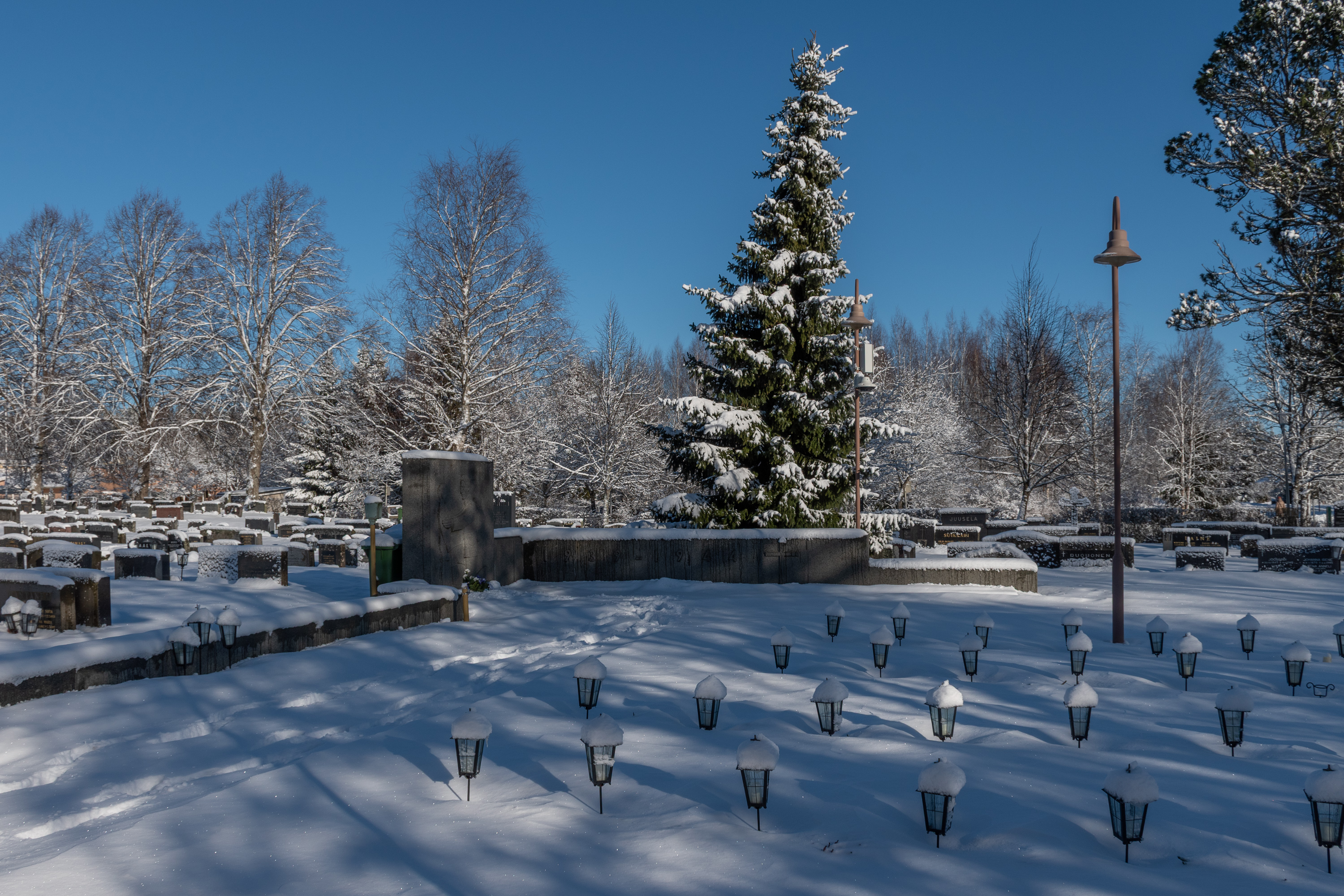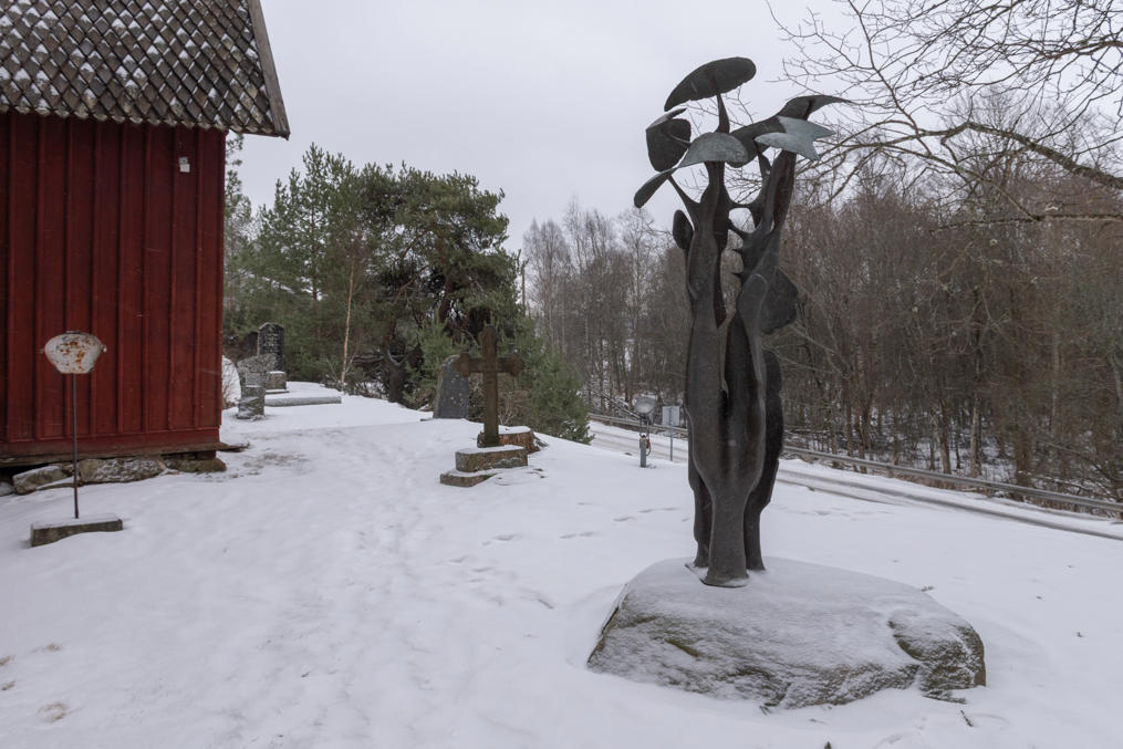 19. Детали: скульптура "Древо жизни" (Elämänpuu) на старом кладбище — в честь ветеранов? не понял, к чему; — скромный совсем ящичек для сбора пожертвований; надпись на амбаре (при церквях обычно строили общий амбар, куда собирали зерно на случай неурожая) со старой финской орфографией.