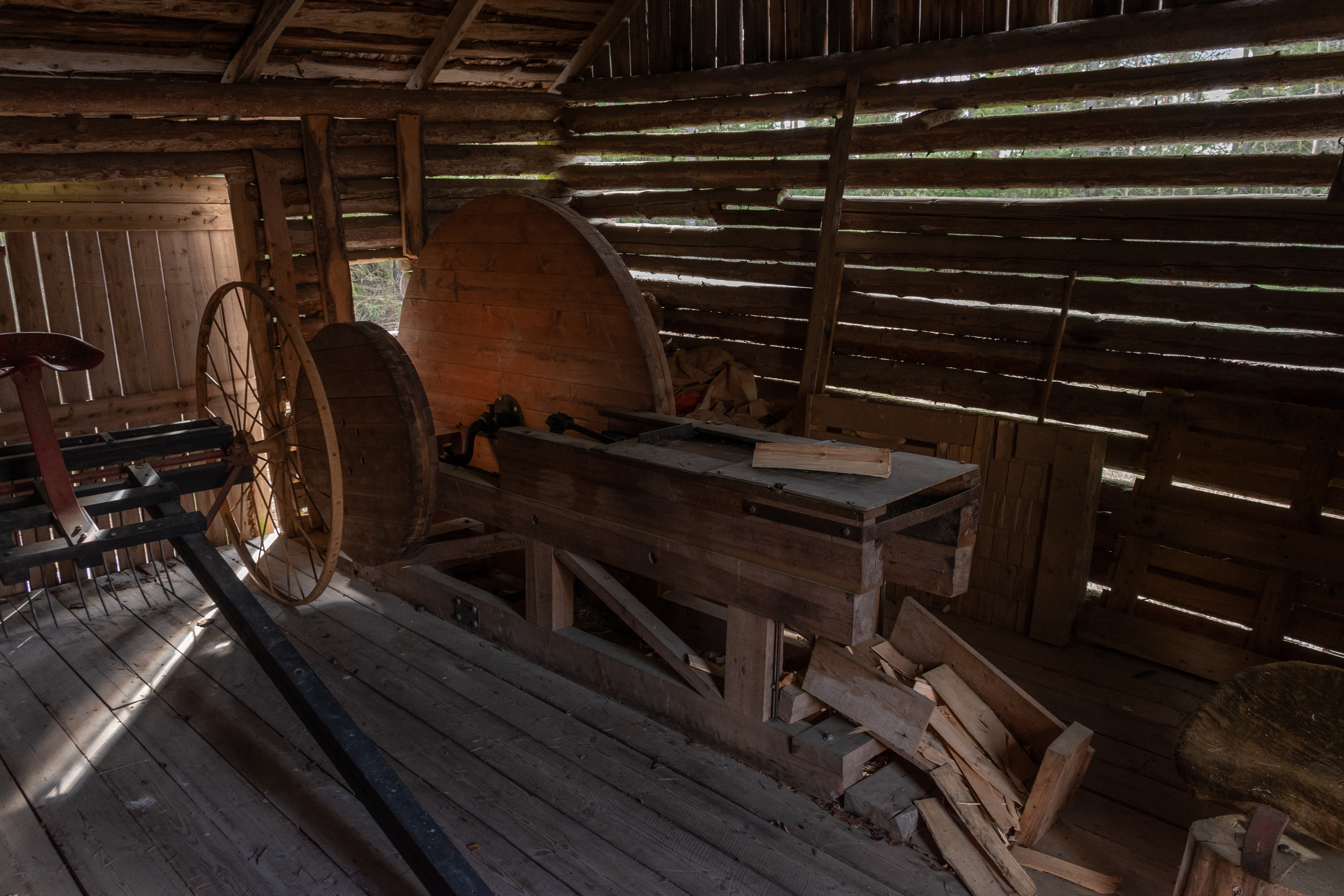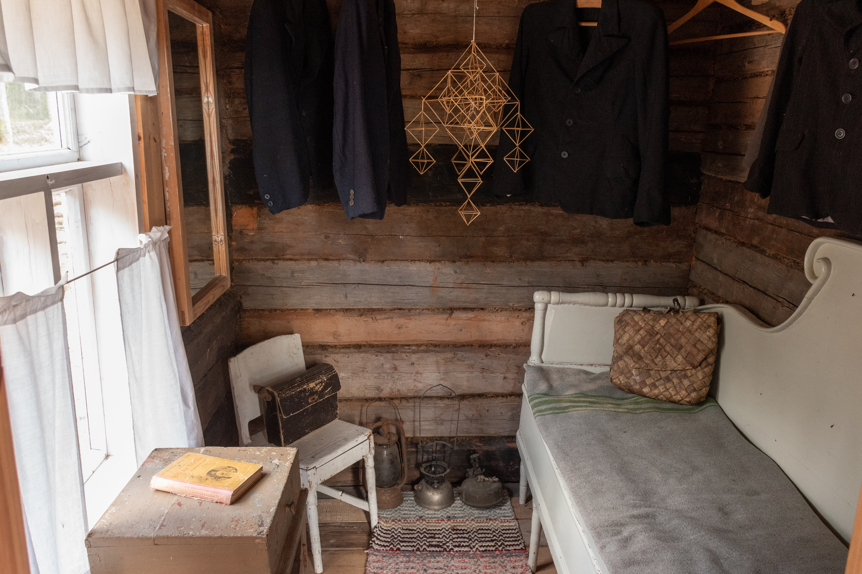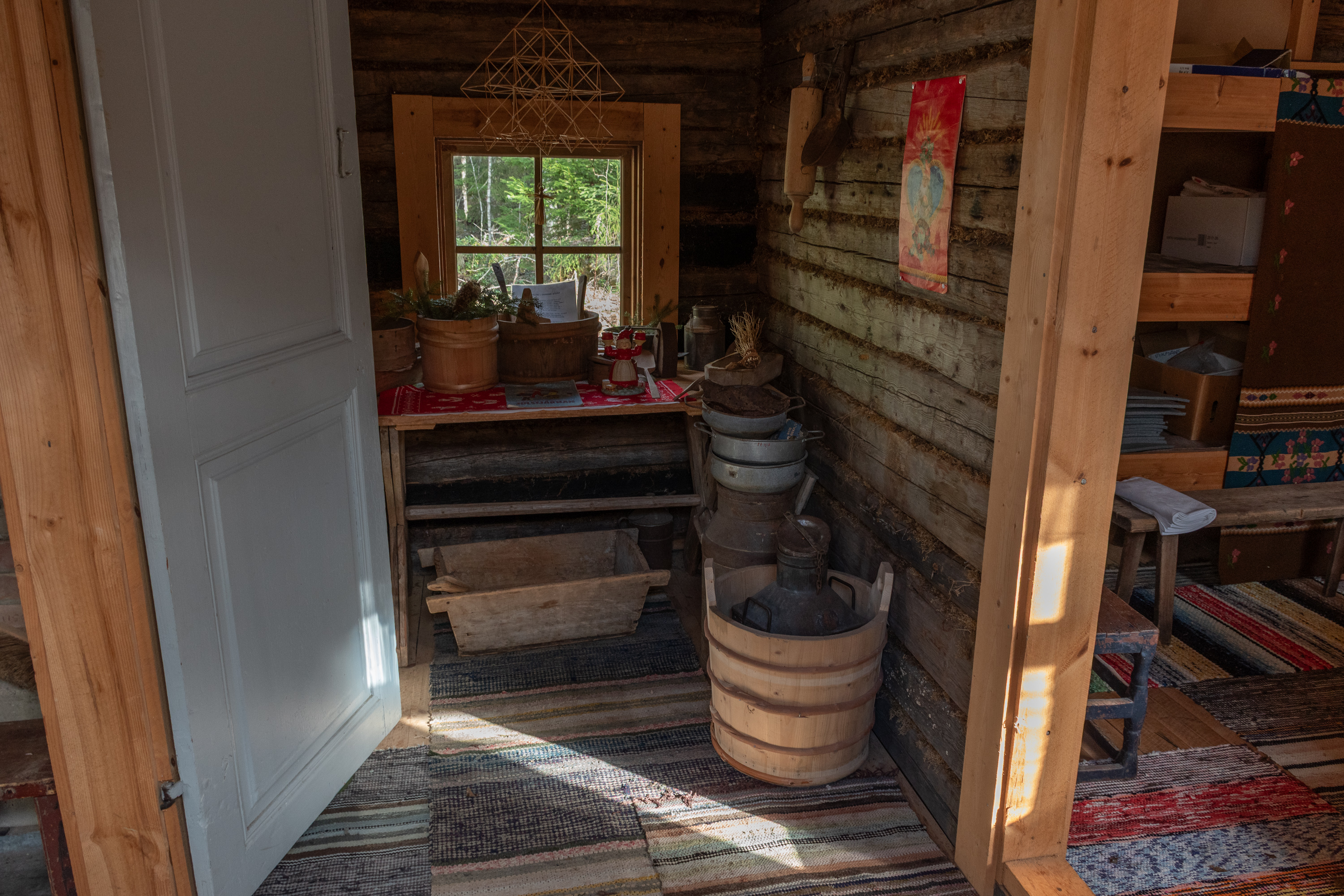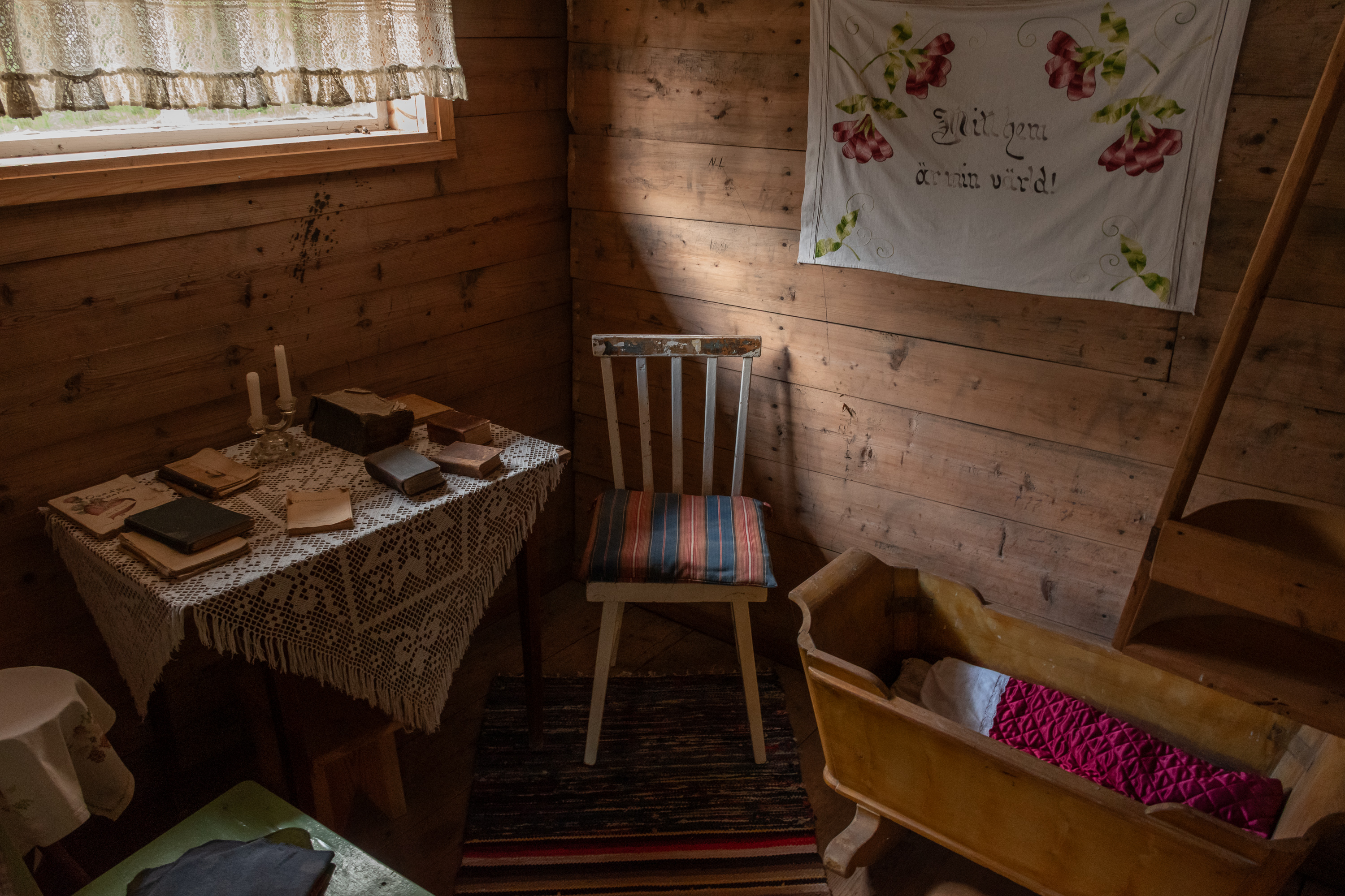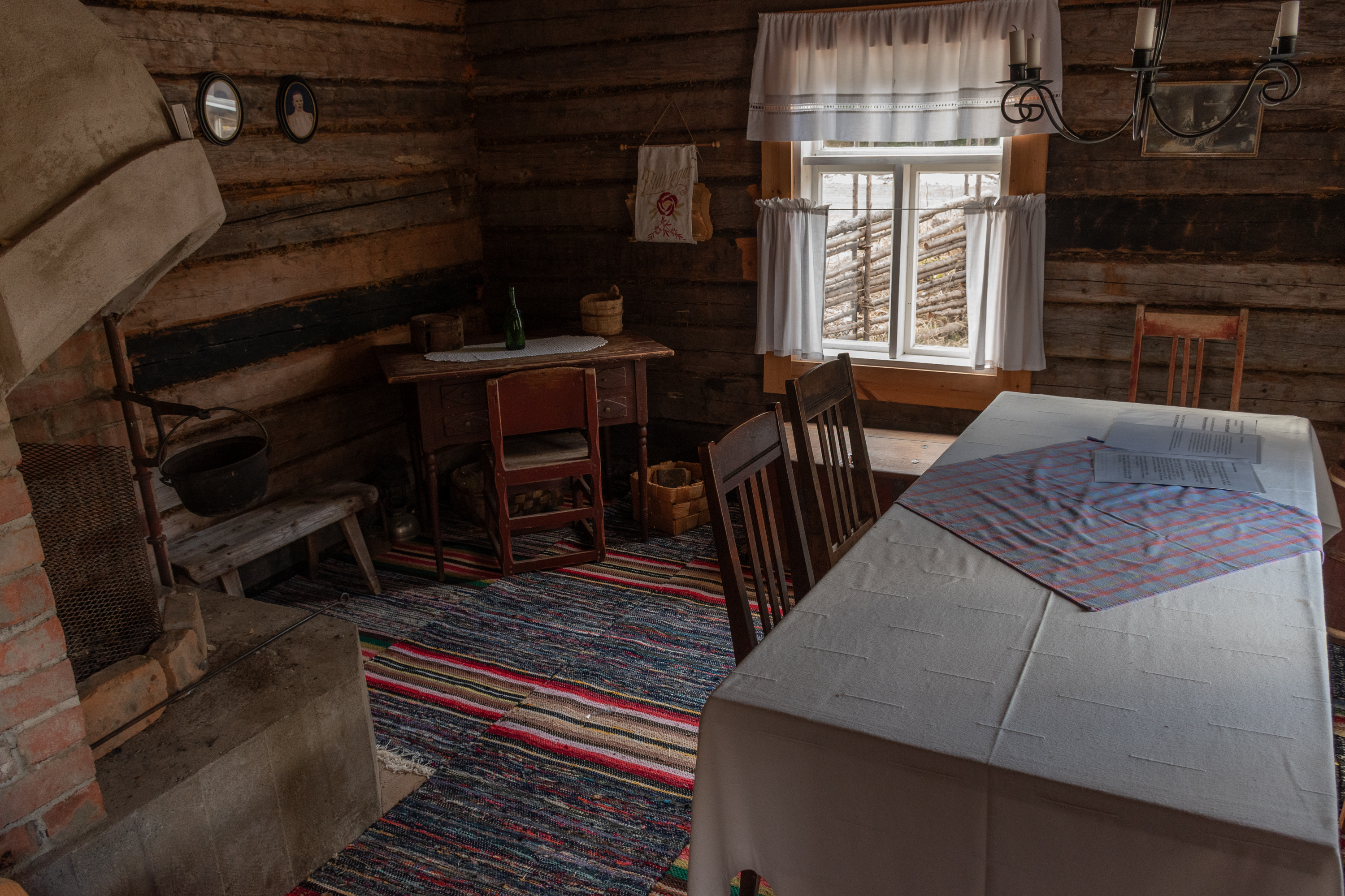 52. Главная хижина (из четырех вроде бы) — Маттью-Олина (Mattjus-Olins stuga) — с информационными материалами. Для меня полнейшей неожиданностью и культурным шоком стало то, что хижины все не заперты и можно спокойно зайти и разглядывать сколько хочешь! В Финляндии, конечно, очень много чего на доверии, — и это одна из вещей, за которые мы все ее и любим, — но все-таки всему есть предел, и традиционные сельские музеи-скансены, как хотя бы показанный мельком выше, в Эссе, неизменно закрыты на замок, и там гулять и рассматривать обычно можно только снаружи; а открыты бывают только в летний сезон, иногда буквально всего по одному месяцу в год. А тут знакомься хоть круглый год 24/7. Возможно, в этом есть что-то именно от шведоязычных финнов; помню в Малаксе, в южной части шведоязычной Остроботнии, избушку в начале природной тропы, тоже обставленную и с информацией, тоже не запертую.
