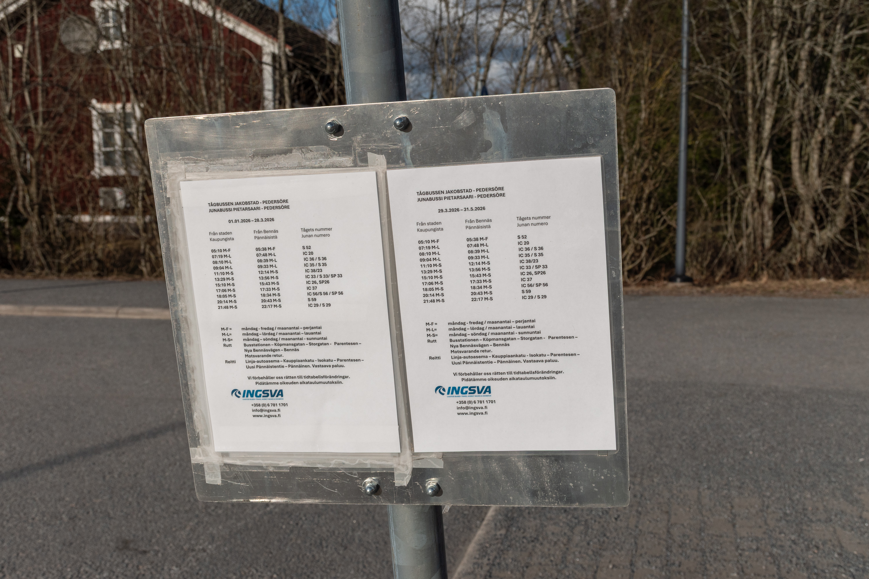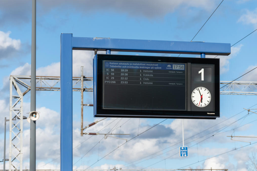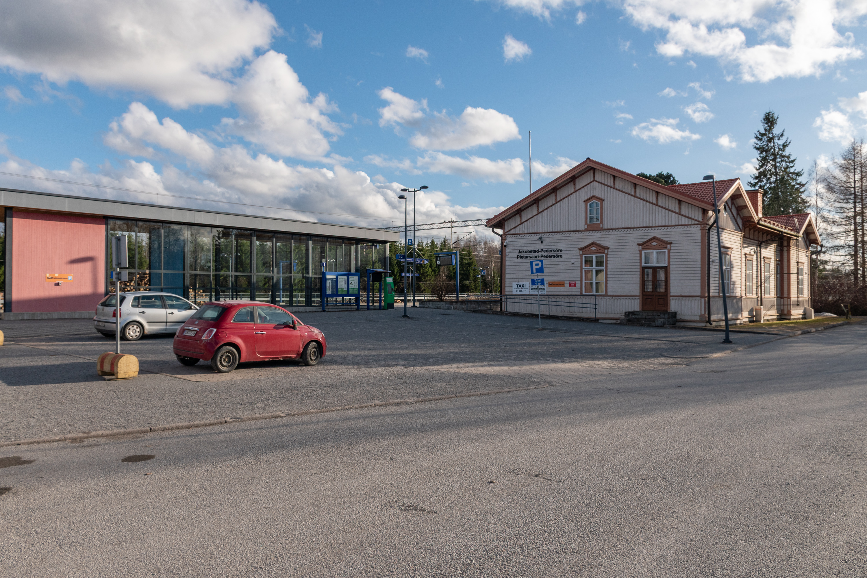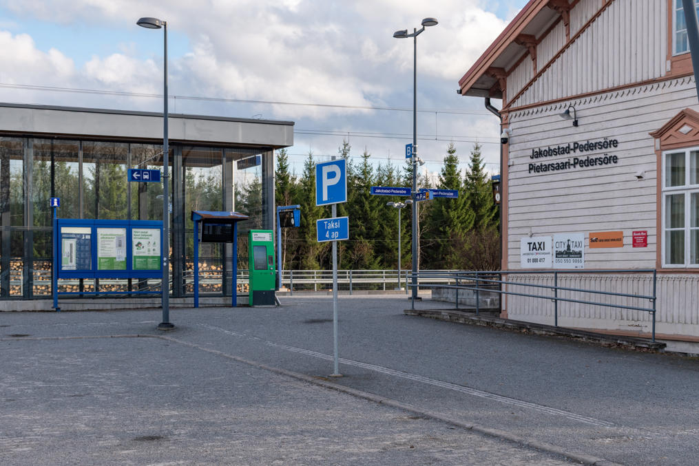72. Вот от этой остановки. Автобусы согласованы, по-моему, со всеми поездами, кроме ночных, а здесь останавливается большинство поездов на Оулу-Рованиеми. Также здесь довольно обширные перехватывающие парковки — это только первая тут, а всего три. Довольно серьезно организовано все, мало где увидишь. Станция называлась Беннес до 2020, только после этого для удобства решили переименовать с указанием именно на Якобстад. Впрочем, нынешнее название "коммерческое", а в информационных системах железнодорожников так и остался Беннес.
