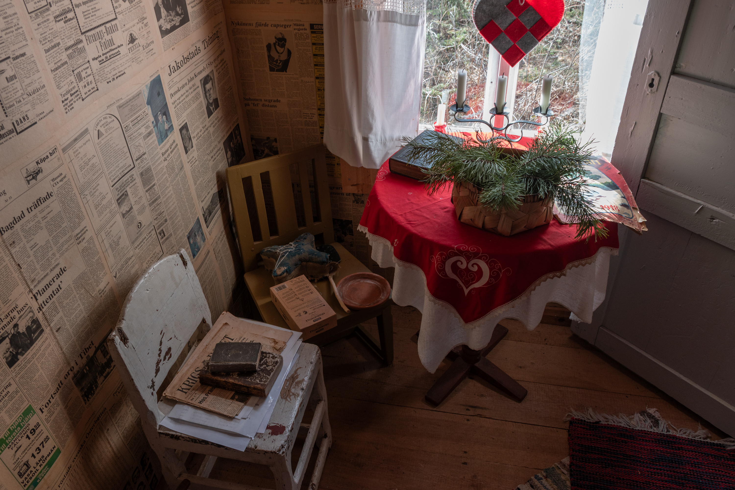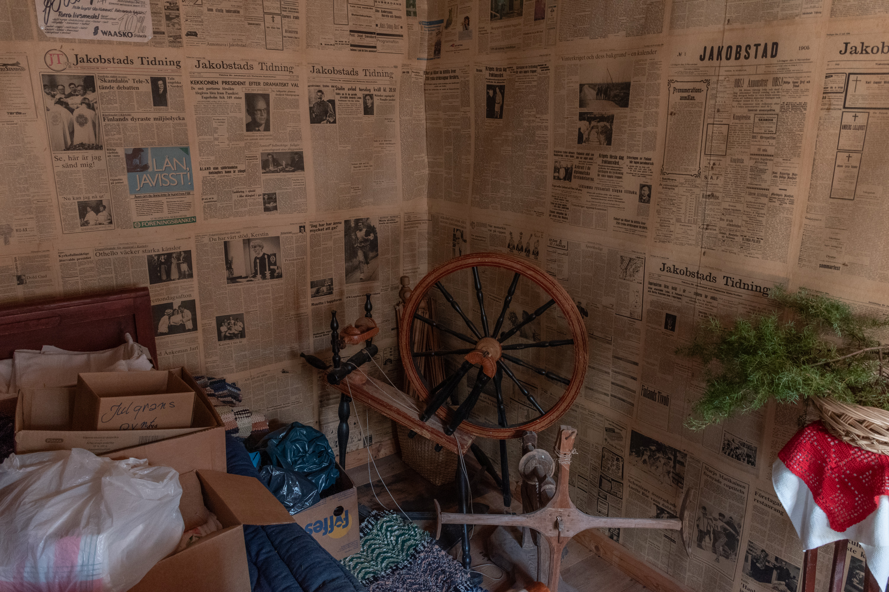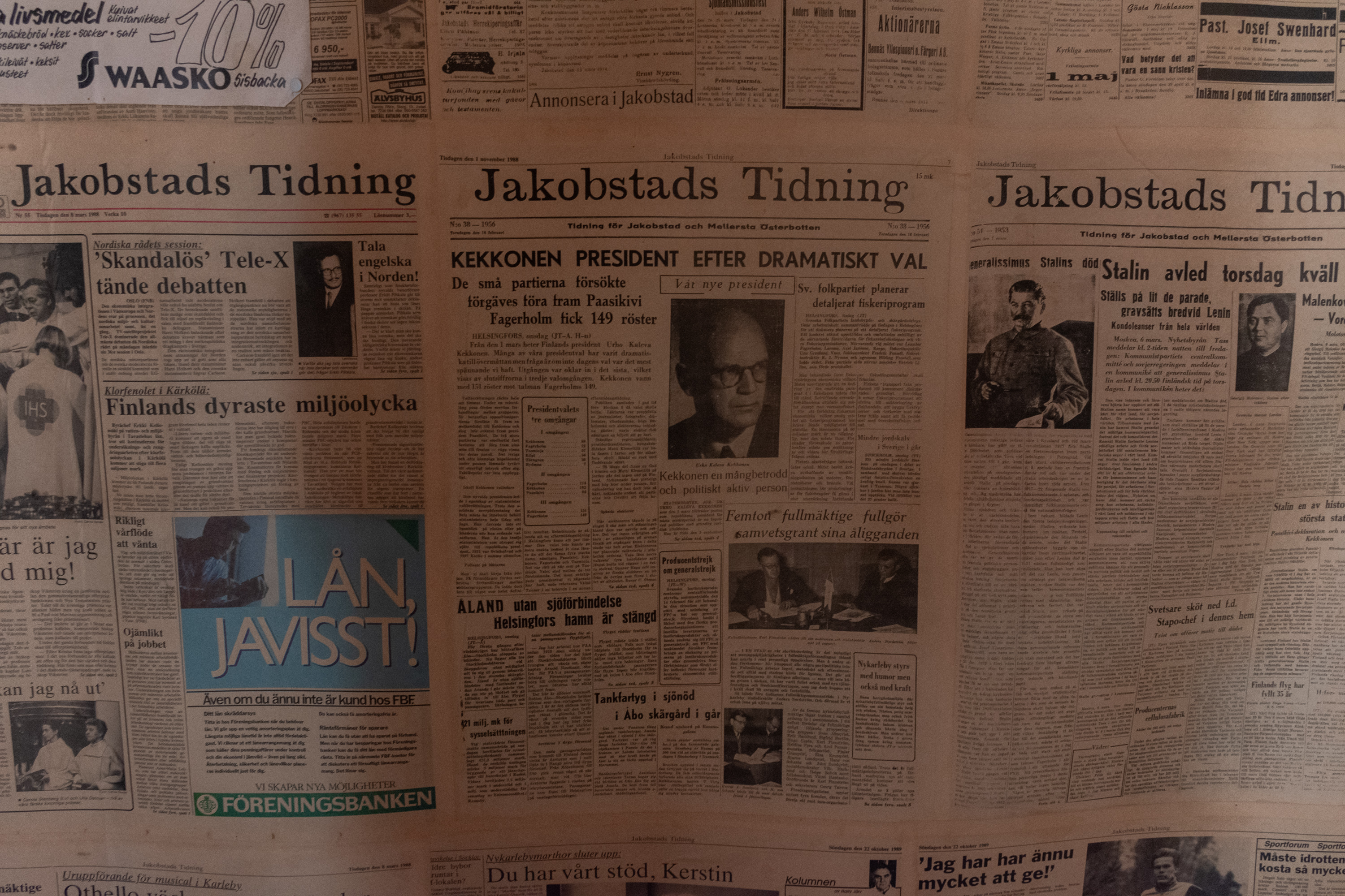 58. Местные газеты, чтоб комнату оклеить, явно специально подобрали интересные — вот в середине про победу Кекконена на своих первых президентских выборах в 1956, а справа про смерть Сталина в 1953.