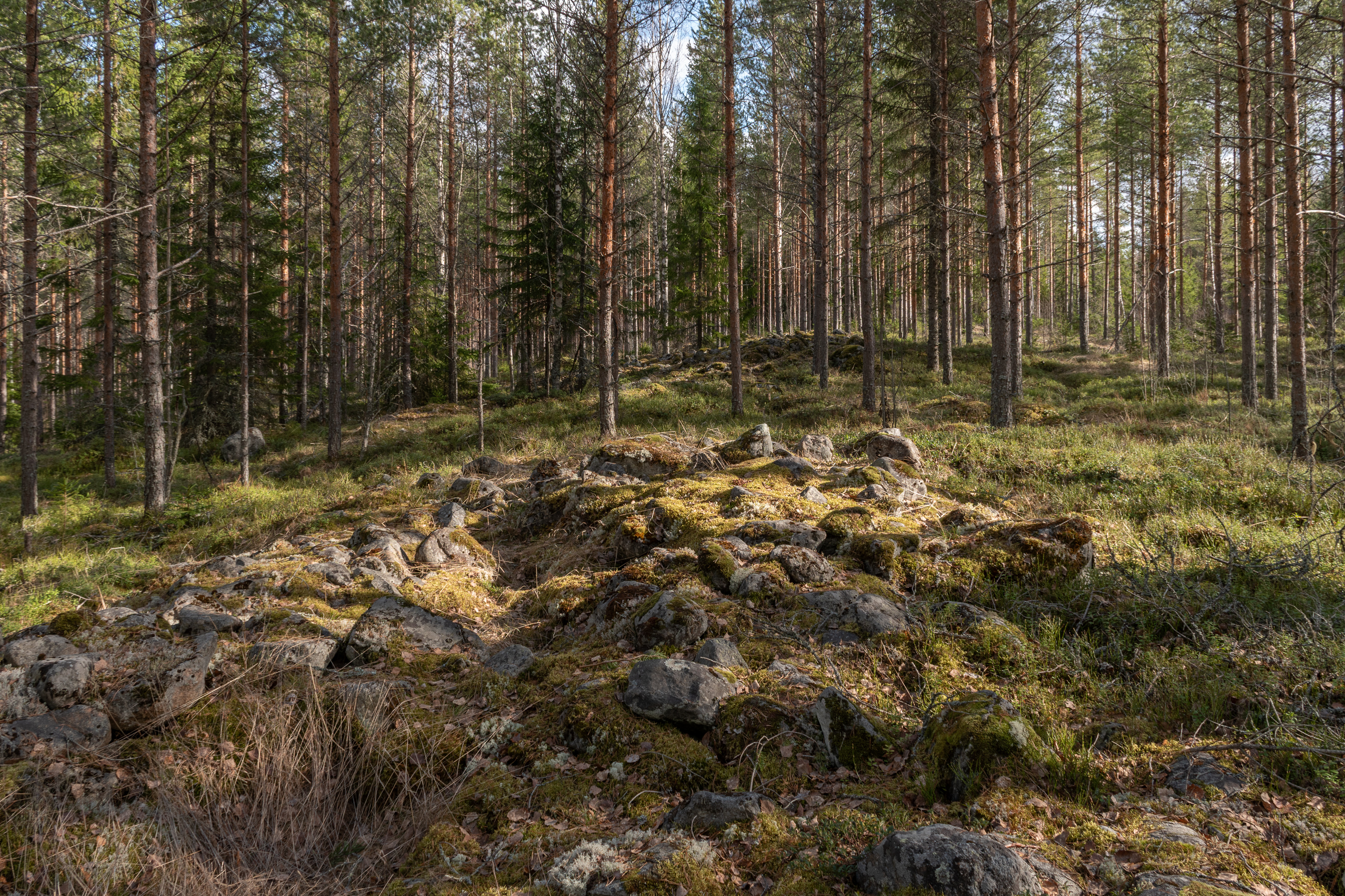 47. "Церкви великанов" (фин. jätinkirkko, швед. jättekyrka) встречаются на северном Ботническом побережье Финляндии и являются самыми большими — по размеру — известными в Финляндии доисторическими артефактами; это прямоугольные каменные валы, шириной в несколько десятков метров, с проходами в стенах. Их точное назначение неизвестно, однако камни в валах ничем не скреплены, а следов постоянных поселений и захоронений у них нет. Традиционная гипотеза — в них хранили (накрывая чем-то) тюленье мясо и жир; в доисторические времена море могло доходить и до этих мест. Довольно эффектную старую "церковь великанов" под Раахе, "Паттийокскую крепость", я когда-то показывал; 40-метровая Екнебака заросла лесом, валы невысокие и прослеживаются подо мхом плохо, и, честно говоря, смотреть особенно нечего.