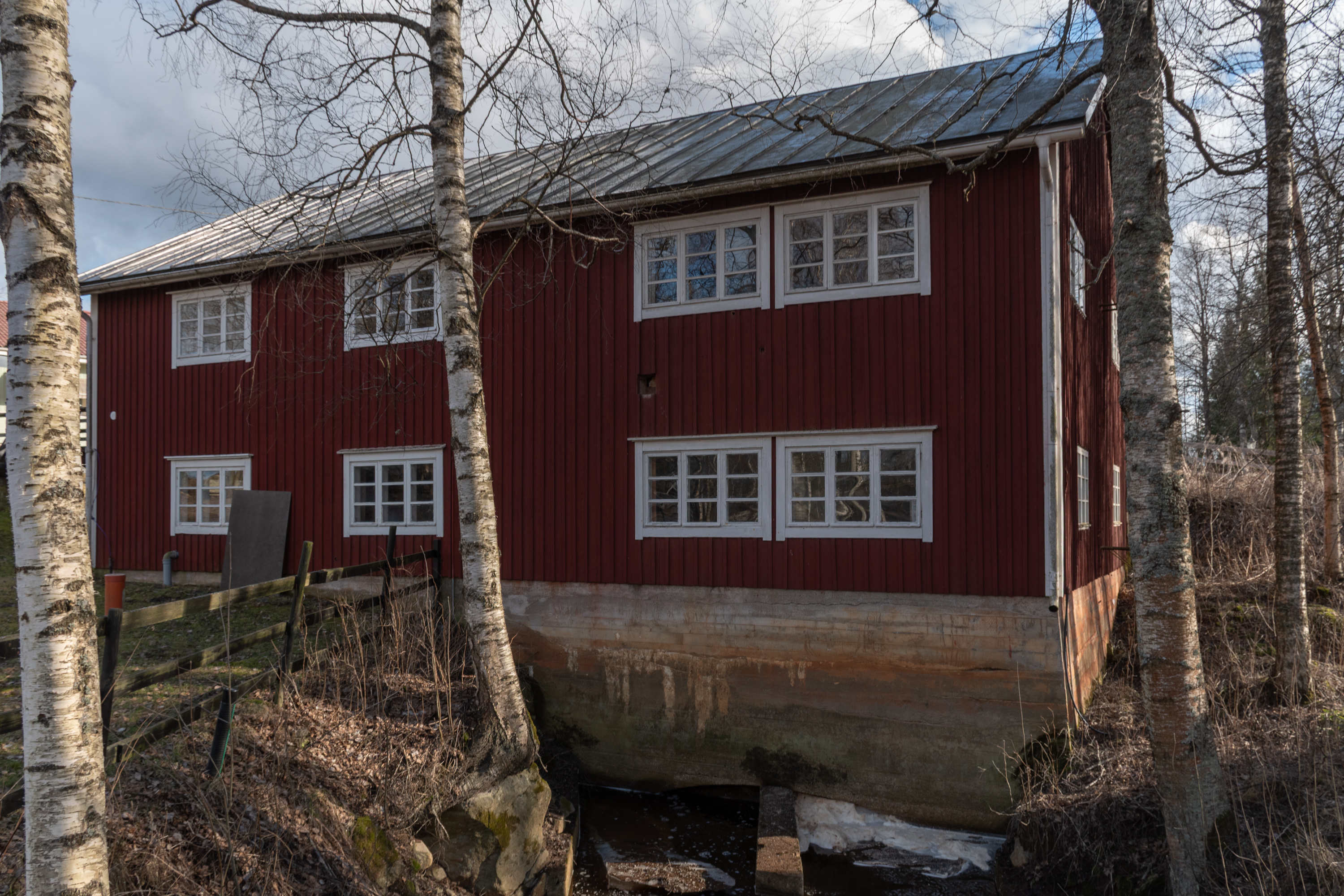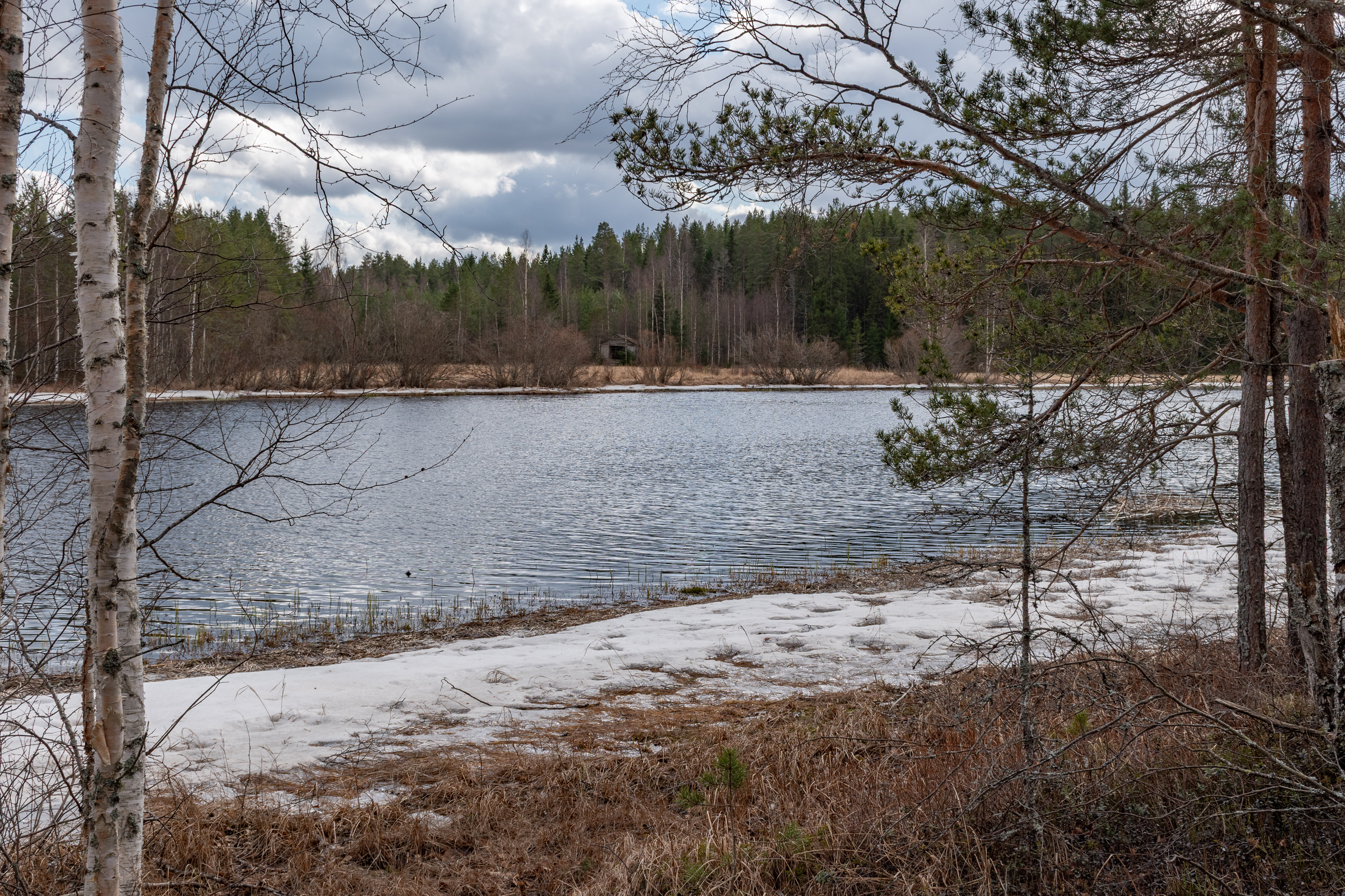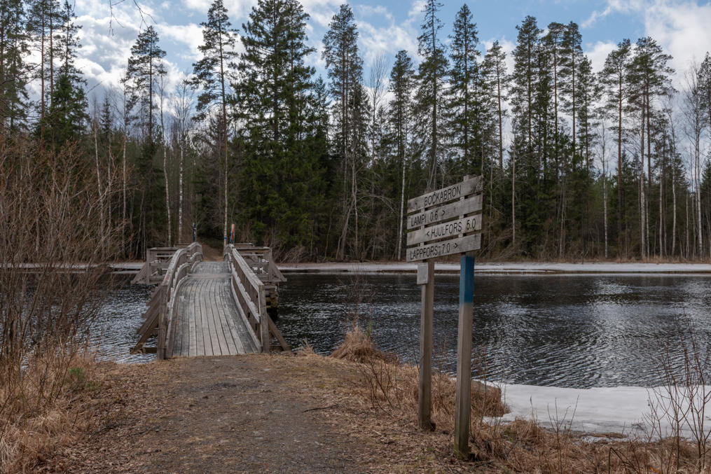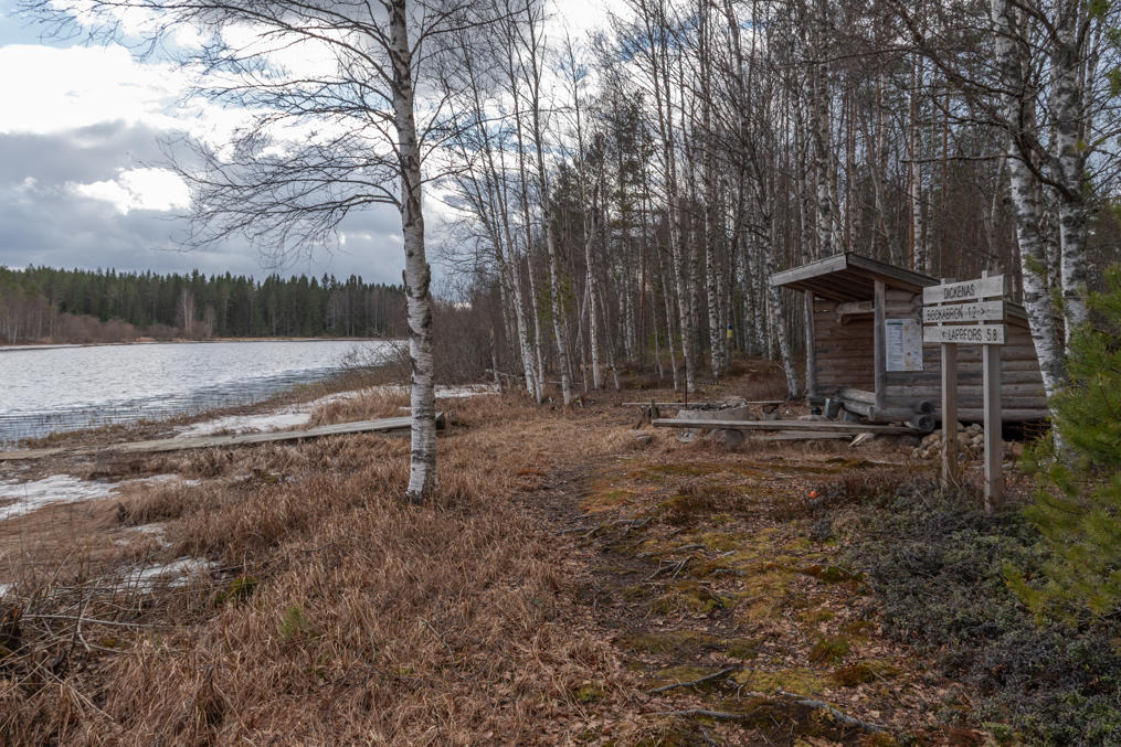 31. Школа стоит и тропа начинается с маленького озера Щискшён (Kisksjön), еще бывшего подо льдом. Информационный щит говорит, что первыми поселенцами здесь была семья кузнеца Миккеля Даниэльссона из Иттерэссе в 1750.
