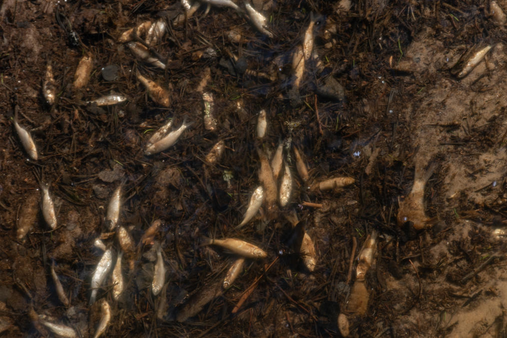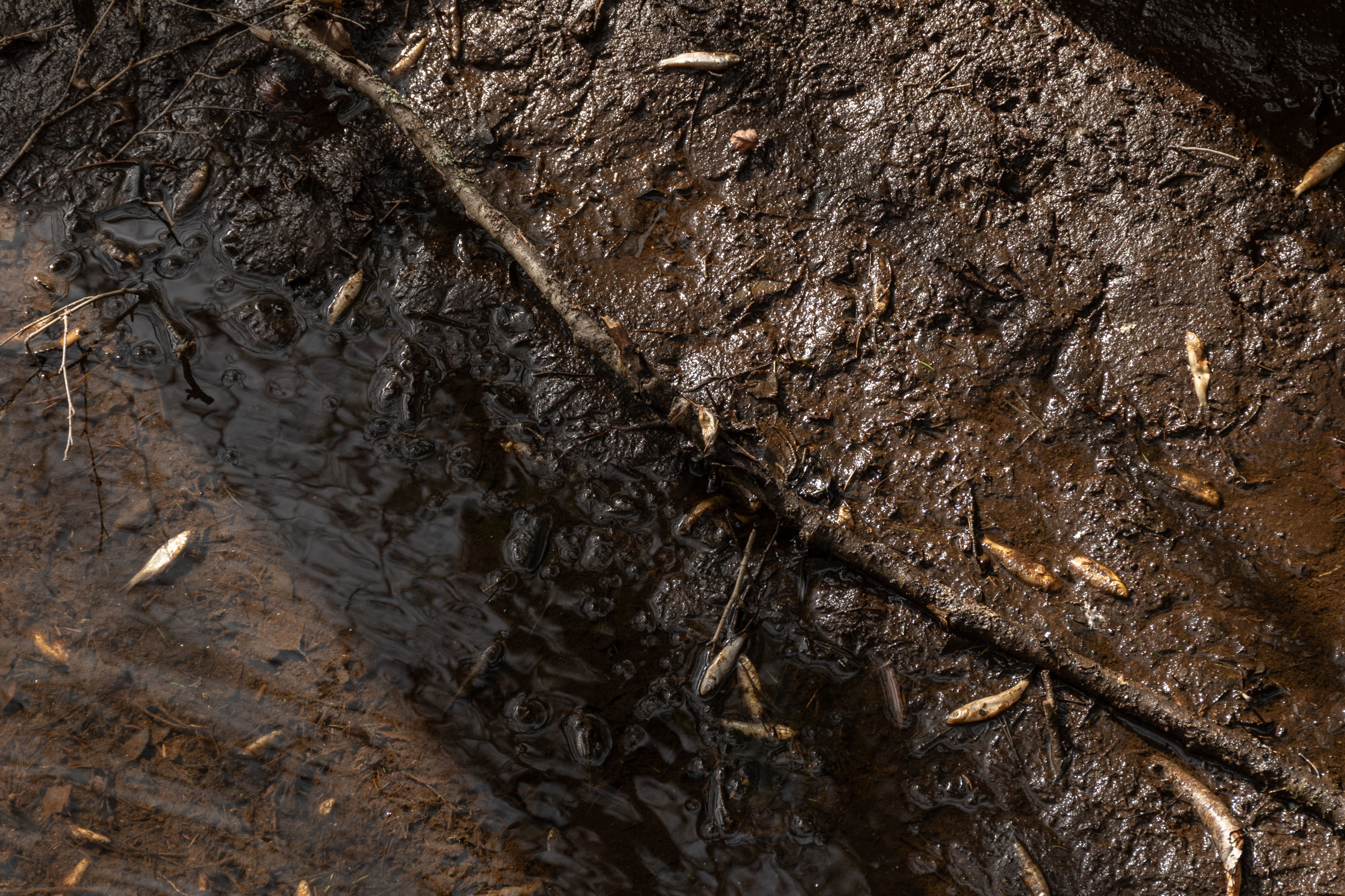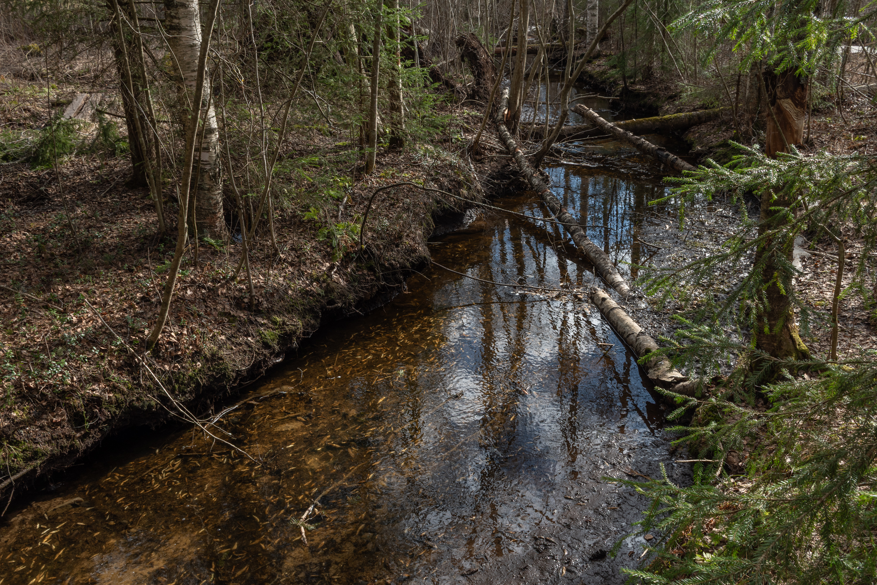 41. В этом месте я внезапно почувствовал сильный неприятный запах — подумал про характерный весенний запах навоза с полей, но для этого еще слишком рано, земля еще на глубине промерзшая и заморозки ночные есть. Причина обнаружилась быстро: короткий полукилометровый ручей, через который показанное выше озерцо Щискшён стекает в реку Эссе, оказался полон мертвой рыбы! Не припомню, чтобы видел такое раньше. Но, конечно, ничего сильно удивительного в нем нет: то, что в мелком озере, сильно эвтрофицированном (с окрестных болот стекает много нутриентов, вода мутная), зимой после сильных морозов может кончиться кислород и вся рыба попросту задохнется, — вполне нормальное природное явление, не такое уж даже и редкое, возможно. На дохлой рыбе другие местные экосистемы отожрутся, а новая рыба поднимется в озерцо из реки по этому ручью постепенно. Но запах, конечно, тот еще, и это она еще и гнить-то всерьез не начала.