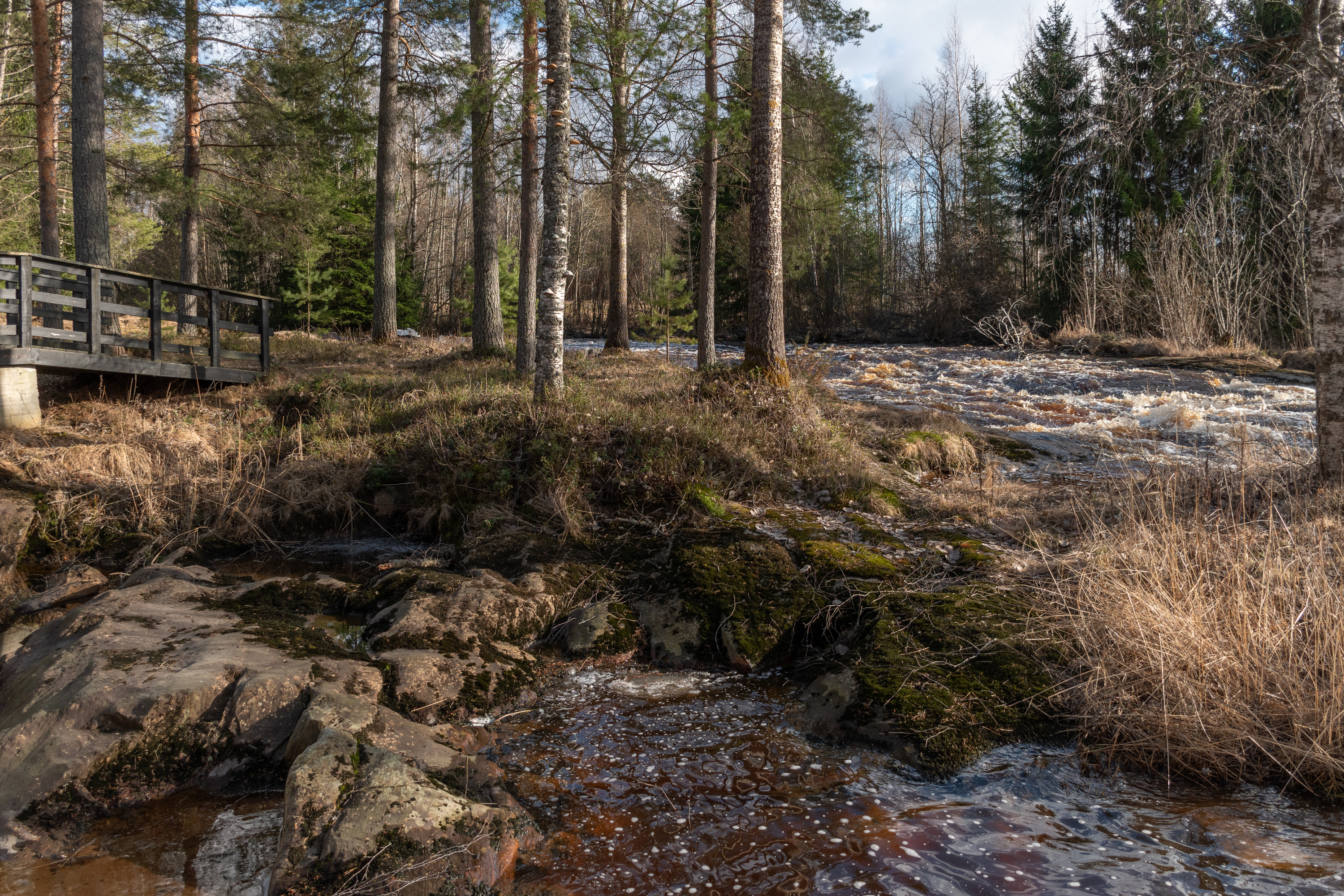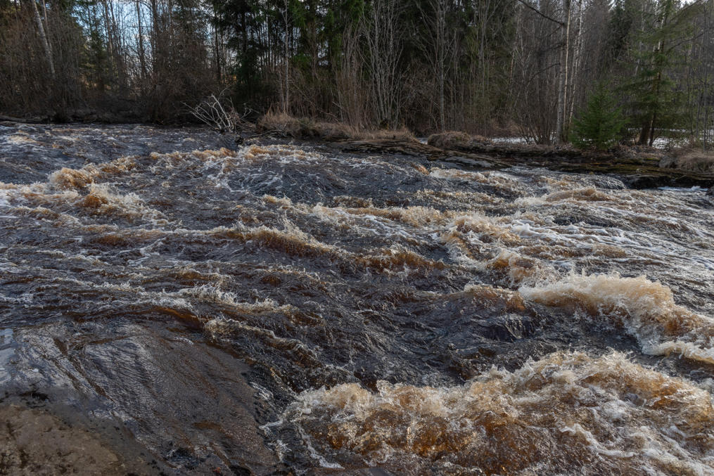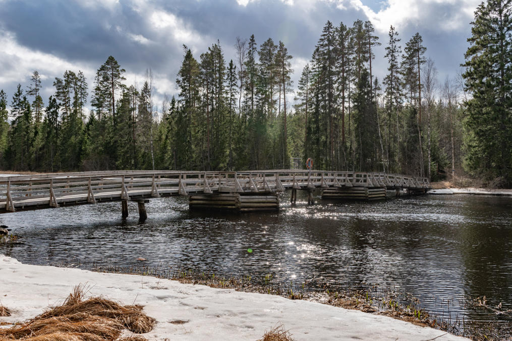 44. Берегом Эссе. Река тут спокойная и относительно широкая, метров пятьдесят. На еще одном информационном щите пишут, что славилась раками, была в свое время чуть ли не самая продуктивная река Финляндии в этом отношении (хотя раки в большом количестве появились не сами, а когда в начале 20 века хозяин лесопилки ими реку засадил). Раки почти исчезли в 1960-х из-за эпидемии чумы раков и строительства ГЭС. Родных речных раков (jokirapu) в Финляндии, как и в остальной Европе, осталось мало, из-за распространения в местных водных системах гибельной для них чумы раков — грибкового заболевания; кроме того, их вытесняют завезенные сюда американские сигнальные раки (täplärapu), не только более агрессивные, но и частично устойчивые к чуме раков сами и за счет этого активно ее распространяющие.